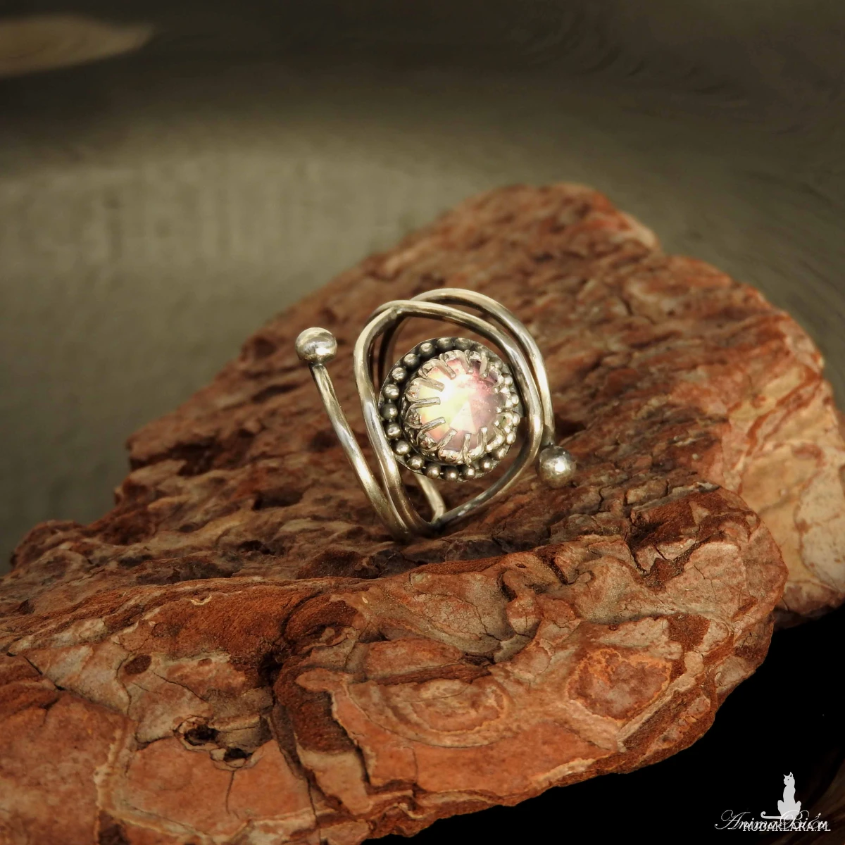 ręcznie pierścionek powstał ze srebra próby 925 i 999. Jego sercem jest