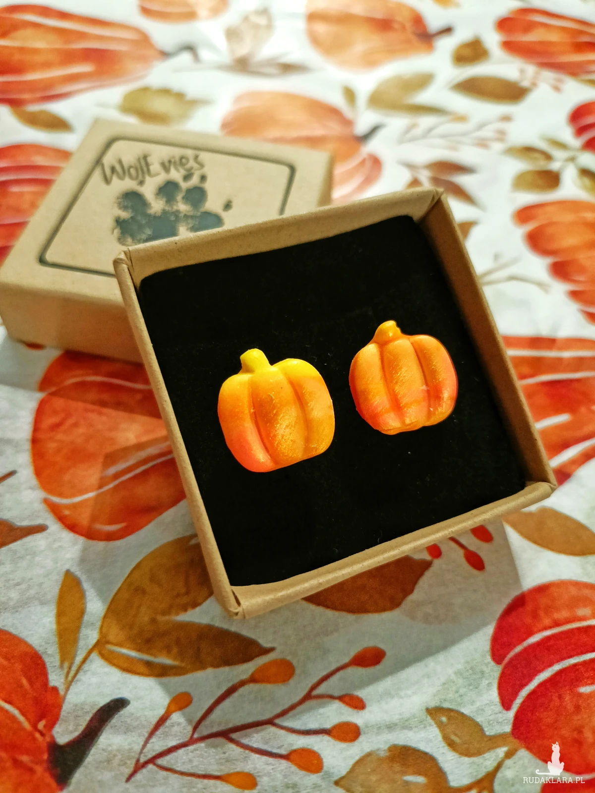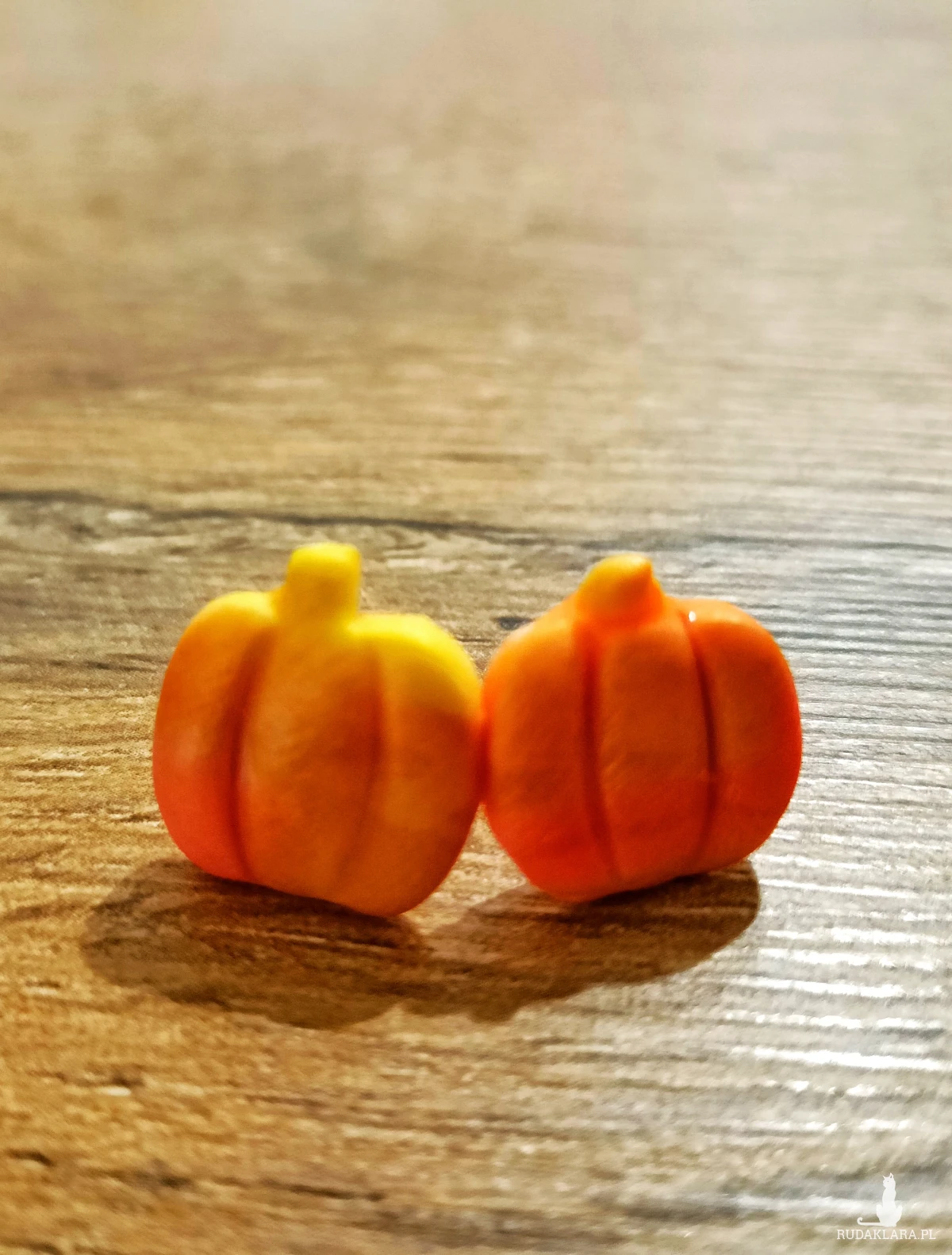 kolczyki jesienne handmade • kolczyki dynie • kolczyki z glinki polimerowej • kolczyki handmade jesień • kolczyki z żywicą epoksydową • biżuteria handmade prezent • kolczyki perłowe błyszczące • kolczyki pomarańczowe • kolczyki dynie na jesień • rękodzieło biżuteria