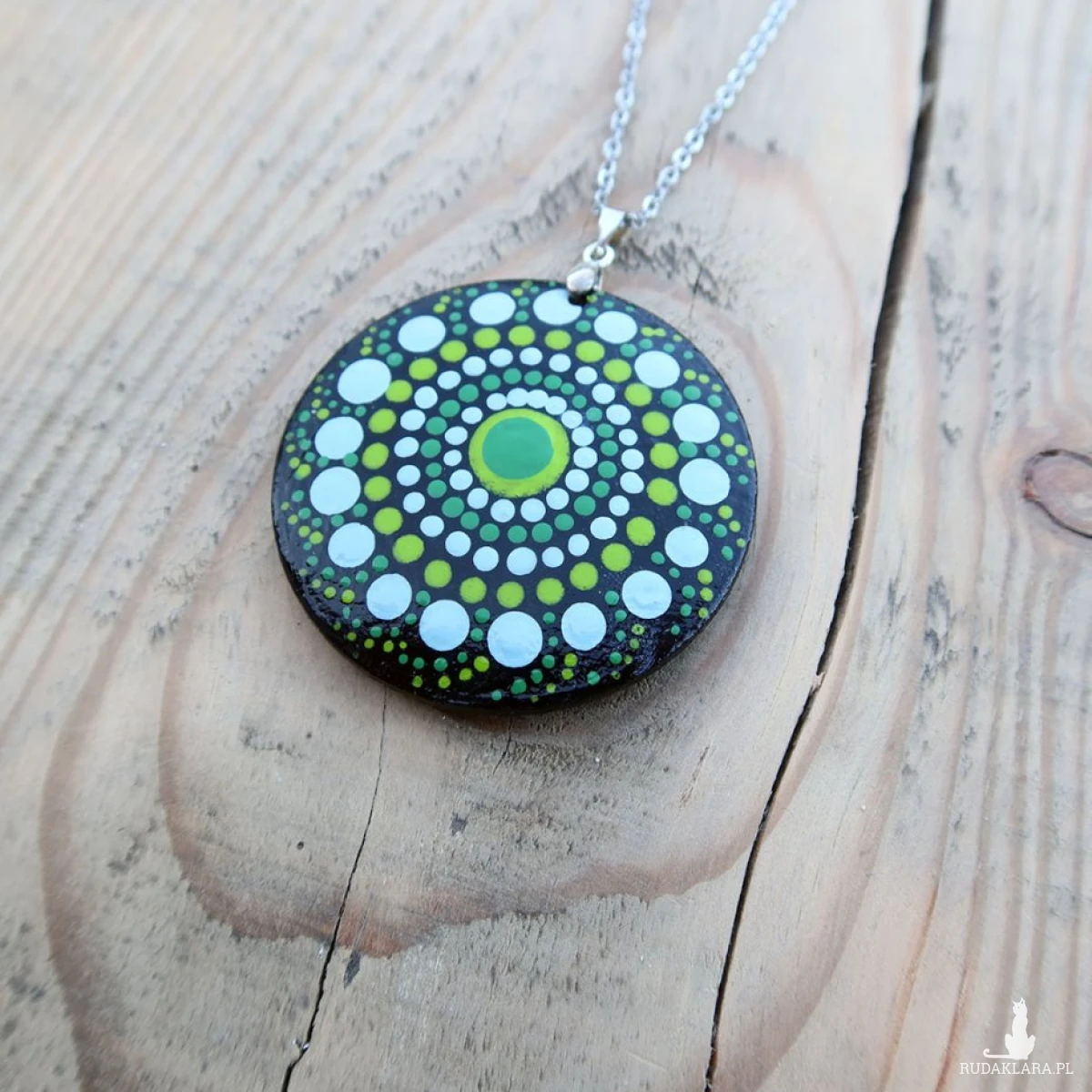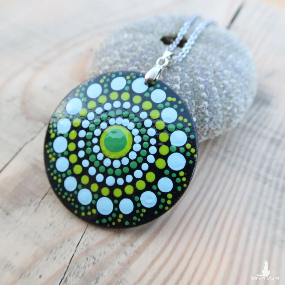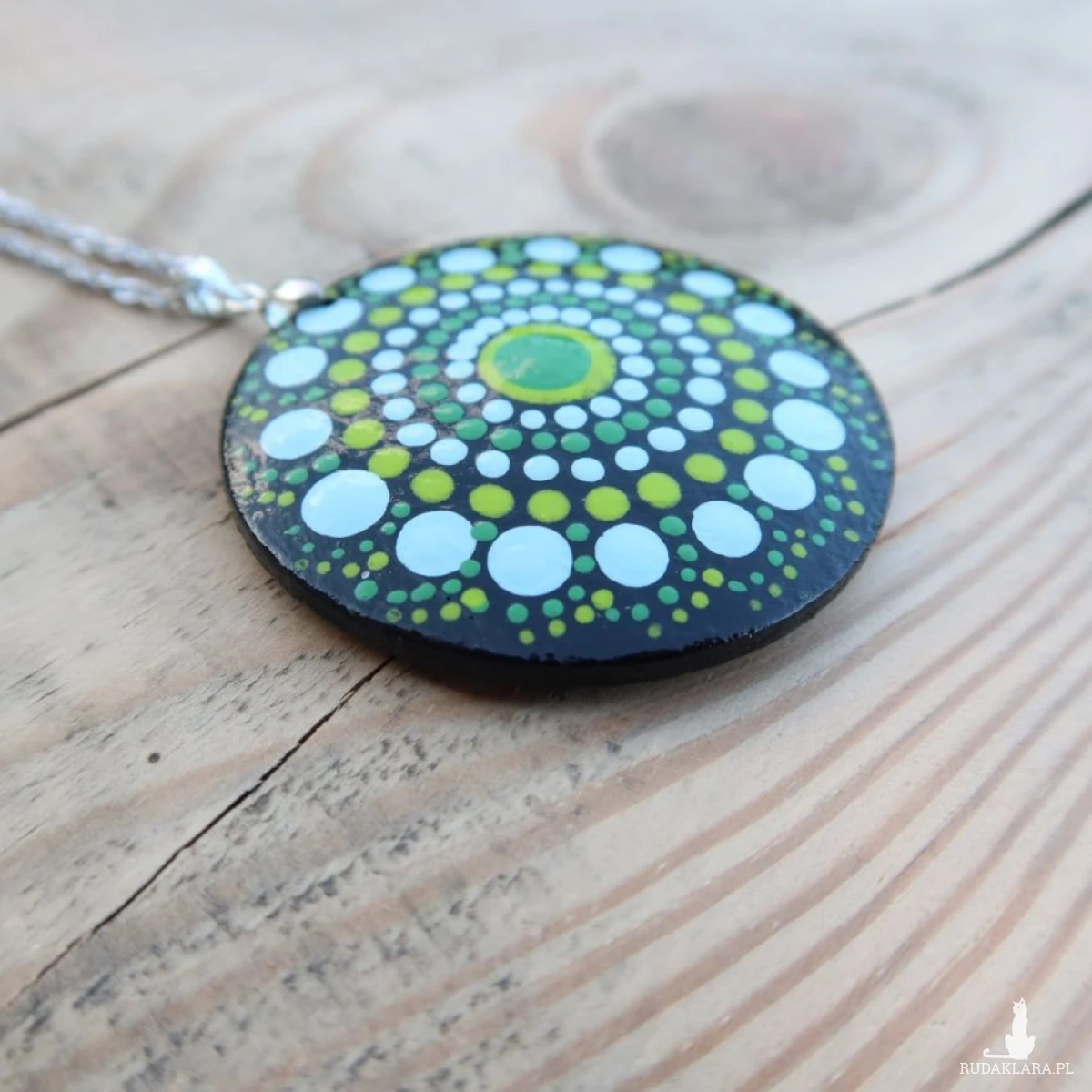 Ta piękna mandala zrobiona w technice dot painting zachwyca swoją symetrią i precyzją wykonania. Na czarnym tle wyróżniają się intensywne, przepiękne kropki w odcieniach zieleni i niebieskiego. Kropki te tworzą subtelne wzory i motywy, które przypominają delikatne liście roślin czy fale na oceanie. Całość została zawieszona na srebrnym łańcuszku, który dodaje blasku i elegancji temu unikalnemu wisiorkowi. Jest to doskonały dodatek do każdego stroju, który doda mu charakteru i oryginalności.