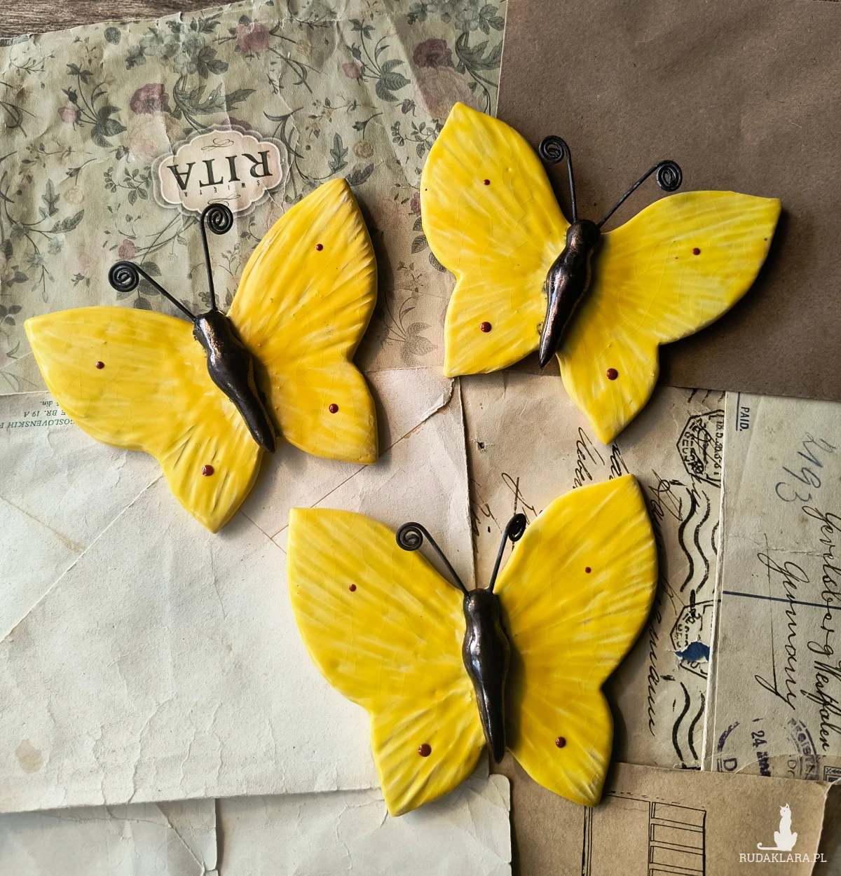 Motylek ceramiczny wykonany z gliny szamotowej, wypalony na biskwit, a następnie szkliwiony w temperaturze 1260 stopni C. Wymiary: ok. 9 cm x 9 cm. Czułki wykonane zostały z drutu węzełkowego. Przeznaczony do powieszenia na metalowej zawieszce na ścianie.