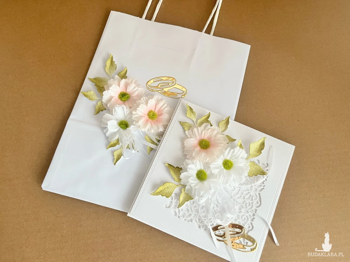 Elegancka, bogato zdobiona kartka w pudełku z okazji ślubu. Utrzymana wbiałej kolorystyce - ozdobiona kwiatami w kolorze delikatnego różu i bieli. Na kartce dodano złote obrączki . Kartka jest w całości wykonana ręcznie z najlepszej jakości materiałów do scrapbookingu tak jak pudełko tz. sandwich box. Wielkość pudełka 15,0x15,0x3. Wielkość kartki 14,0 x 14,0 wewnątrz ,której są gotowe życzenia do własnoręcznego podpisu oraz kieszonka na małe co nieco lub kupon lotto. Zestaw dostępny od ręki. Do zestawu dołączono torebkę w tej samej stylizacji co kartka i pudełko.Wielkość torebki 18x22,5x8cm.Zestaw dostępny od ręki.