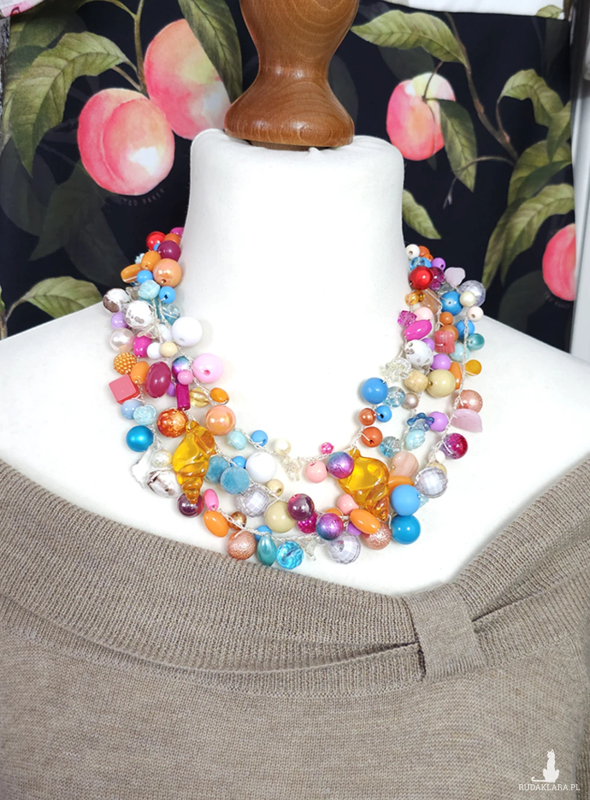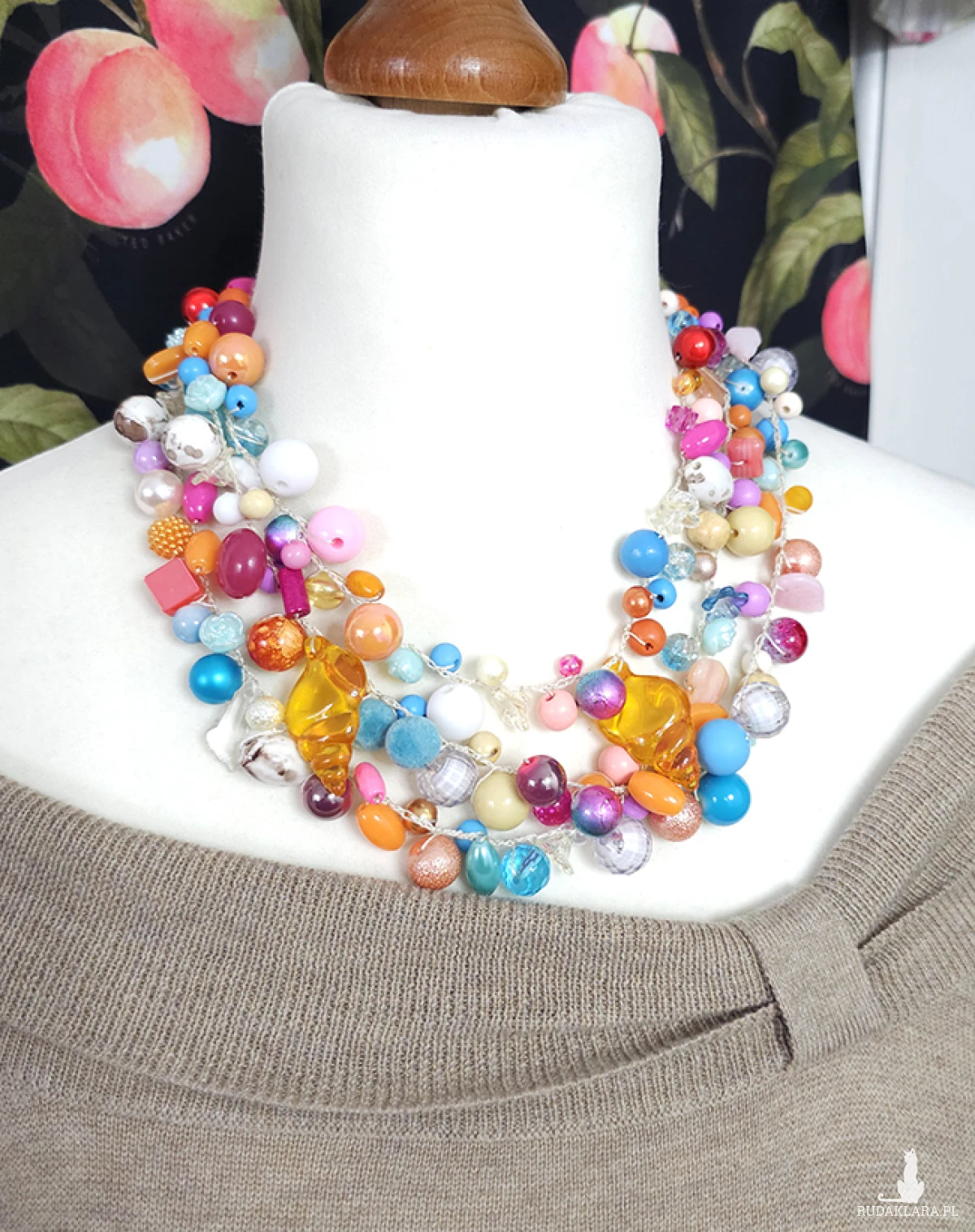 Jest wykonany z koralików szklanych, akrylowych i drewnianych o różnorodnych kształtach i rozmiarach, tworząc niepowtarzalną kompozycję.