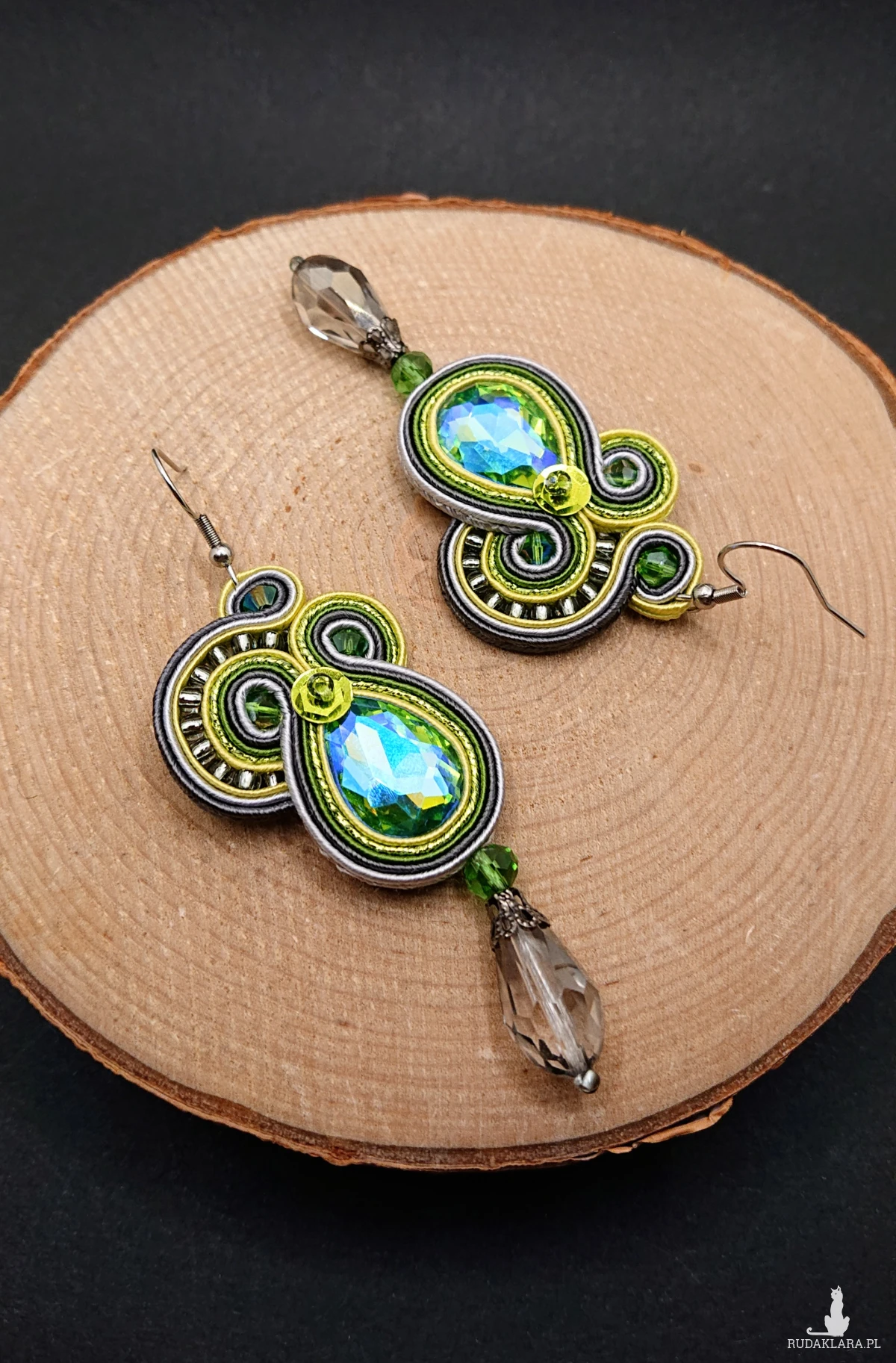 Szklane fasetowane kryształki w kolorze zielonym z niebieskim połyskiem otoczone metalizowanym sznurkiem oraz sznurkami sutasz w odcieniach zieleni i szarości. Dół kolczyków ozdobiony szklanymi kryształowymi kroplami w ozdobnych czapeczkach. Kolczyki zawieszone na metalowych otwartych biglach w kolorze ciemnego srebra.