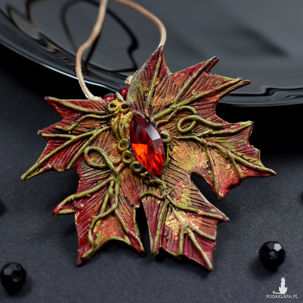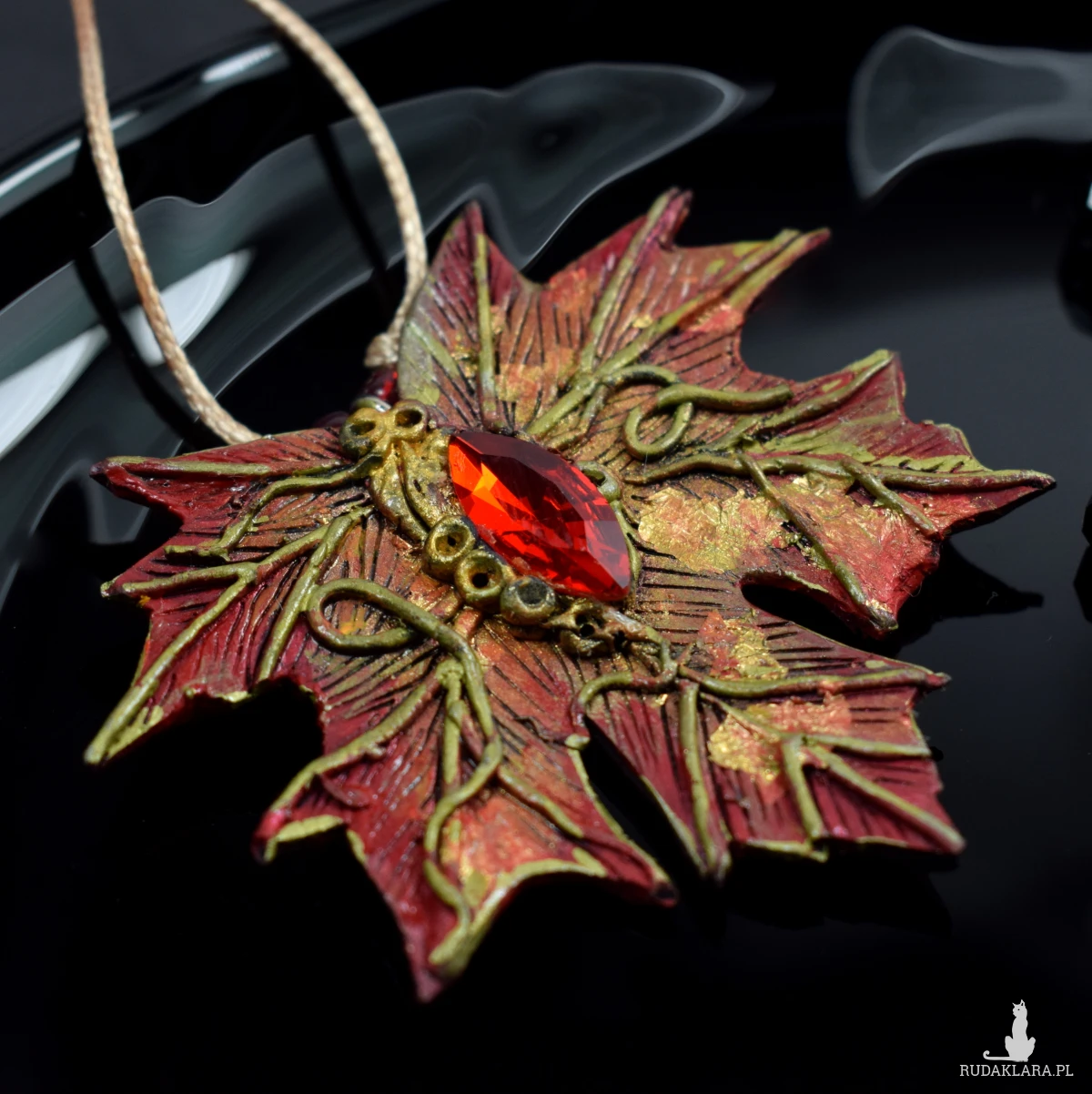 Wyjątkowy wisior w formie liścia klonu, utrzymany w odcieniach czerwieni, bordo i złota.