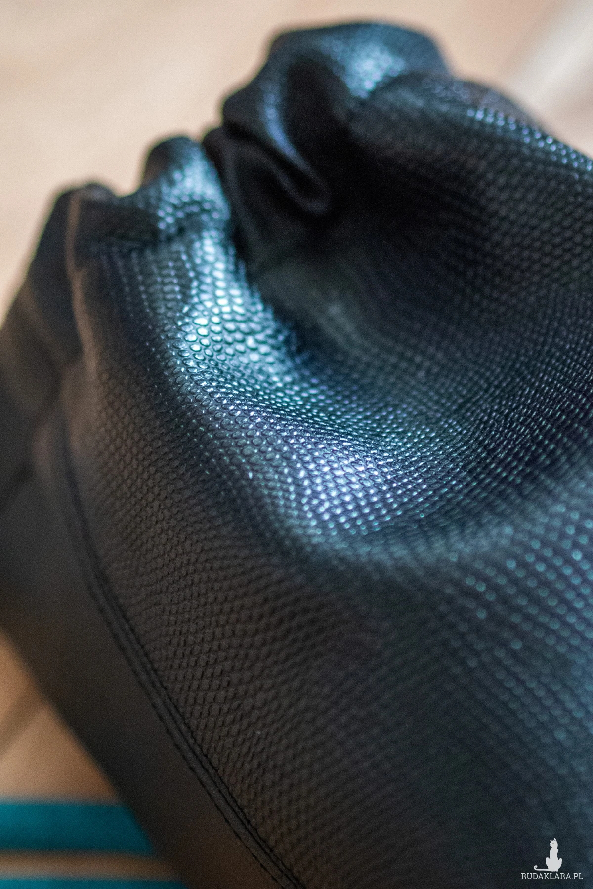 Plecak worek wykonany z czarnej tłoczonej ekoskóry. Jego kształt sprawia, iż idealnie nadaje się na pokrowiec na matę do jogi.