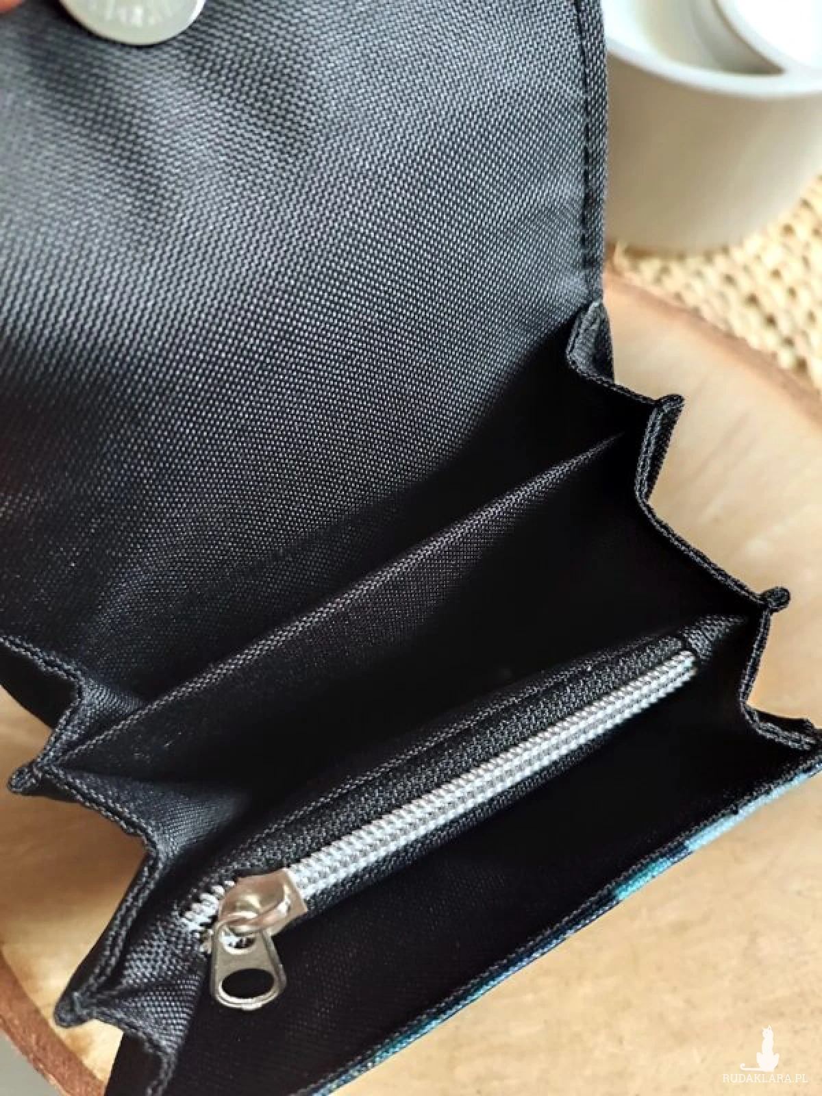 Wewnątrz trzy przegródki i kieszonka na zamek.