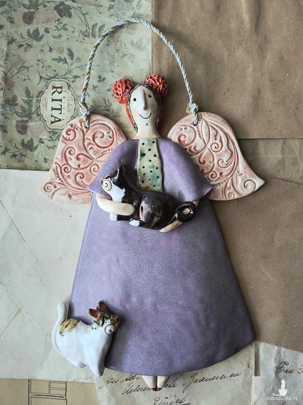 Uroczy aniołek ceramiczny wykonany z gliny szamotowej, wypalony na biskwit, a następnie szkliwiony w temperaturze 1260 stopni C. Wymiary ok 18,5 cm x 24,5 cm. Do powieszenia na ścianie na ozdobnym sznureczku. Idealny jako prezent okolicznościowy lub do ozdoby domu.