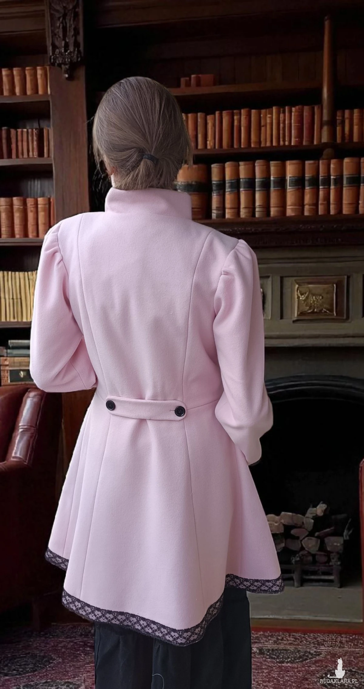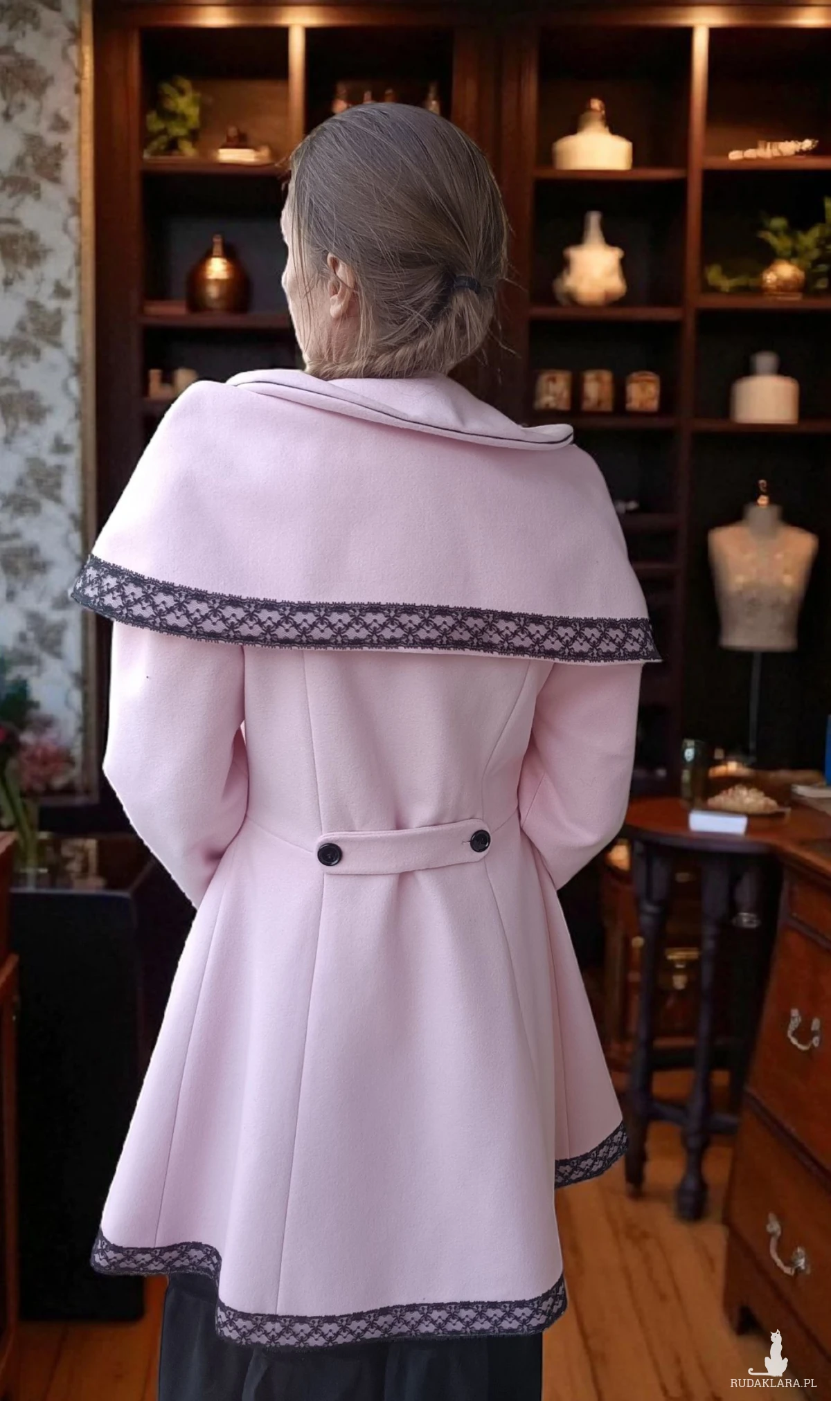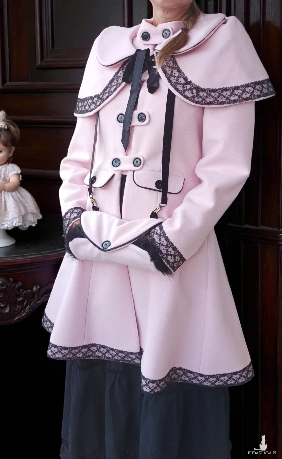 Do sprzedaży płaszcz retro szyty z flauszu ozdobiony czarna koronka i czarna aksamitką regulowany z tyłu podszyty bawełniana podszewką z pelerynka która jest osobna częścią a do pelerynki dopinana mufka do ogrzania rąk.