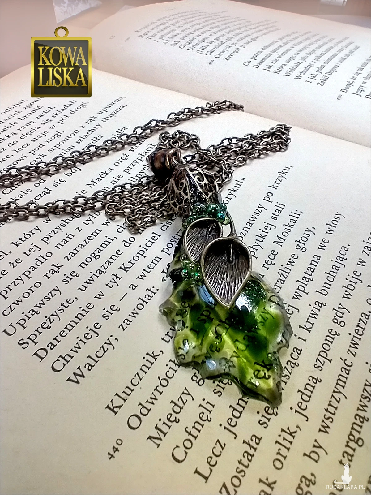 Ciekawy, żywiczny element wisiora w pięknym, oliwkowym odcieniu, przywodzi na myśl świat wydobyty z dna stawu: szklisty osad, drobne kuleczki-bąbelki, ciemniejsze żyłowania. Przezroczysta całość "wylewa" się spod roślinnych elementów, połączonych i zebranych "dzwonkiem" w kolorze antycznego brązu.