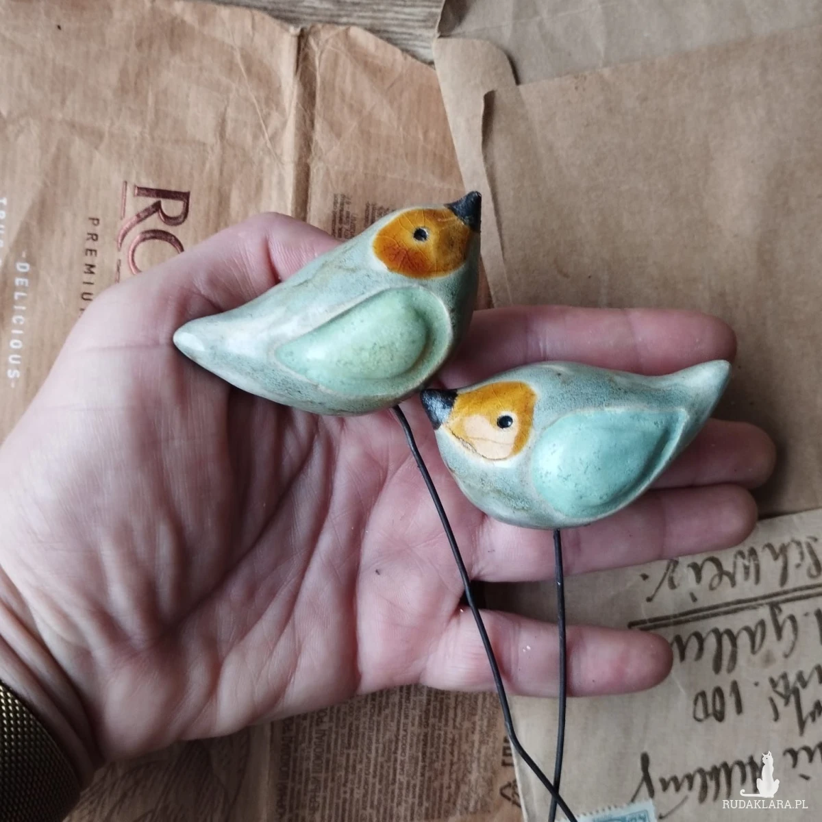 Komplet ptaszków ceramicznych na piku, wykonanych z gliny szamotowe, wypalonych na biskwit, a następnie szkliwionych w temp. ok 1260 stopni C. Wymiary 6 cm x 5,5 cm. Do postawienia na półeczce, lustrze lub jako przycisk do papieru czy serwetek. Dostępne również osobno. Serdecznie polecam!!!