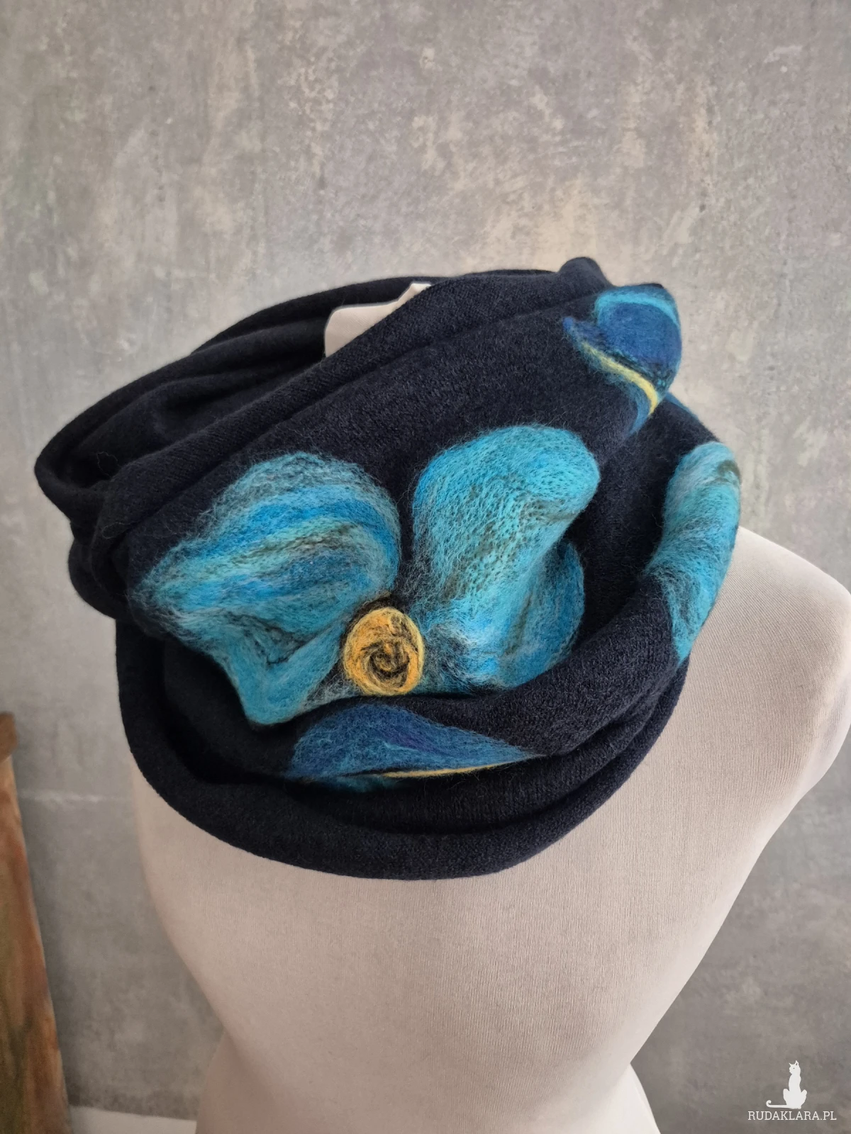 Super prezent na dzień mamy niebieski filcowany wełniany miły i ciepły komin handmade, zdjęcie trochę przekłamuje kolor ten granat jest bardziej podobny do jeansu tak jak na zdjęciu dołączonym przykładowym- tuba, owijany dwa razy, filcowany wełną merynosów, bardzo ciepły i miły, doskonały na prezent, fantastyczny na codzienne noszenie, zwraca uwagę, dodaje koloru, nie zginiesz w tym kominie na ulicy, pojedyncze egzemplarze, polecam bestseller- Ruda Klara ostatnie dostępne od zaraz