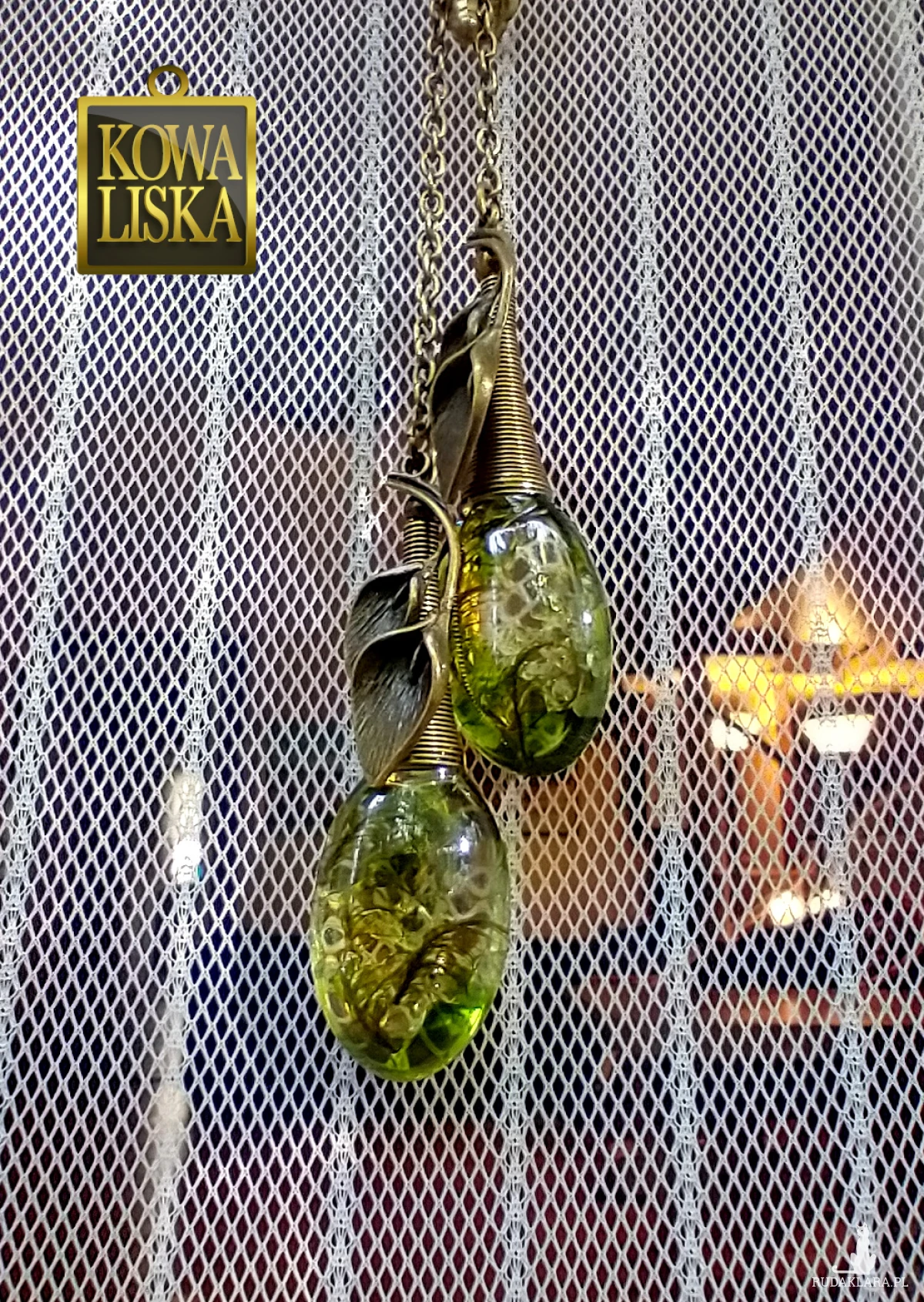 Dwie duże, wypukłe żywiczne krople oprawione w metalowe elementy w kolorze antycznego brązu, podwieszone asymetrycznie na masywnym, metalowym łańcuchu.