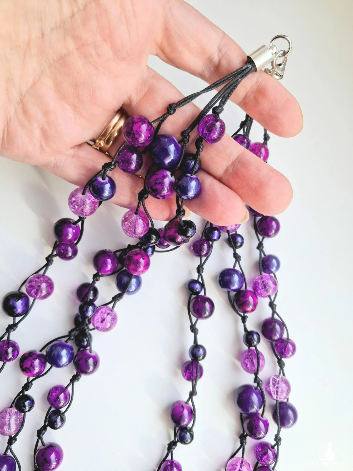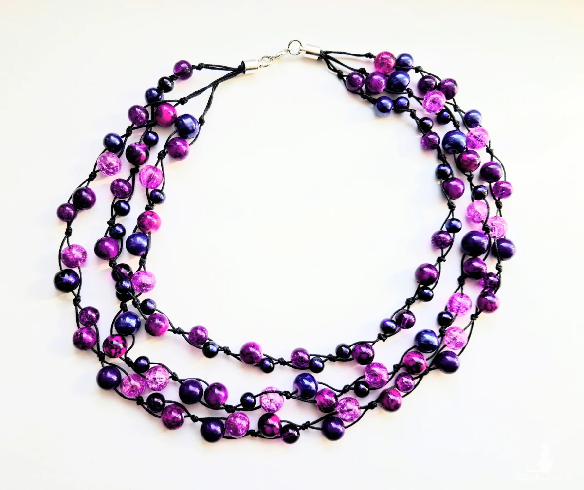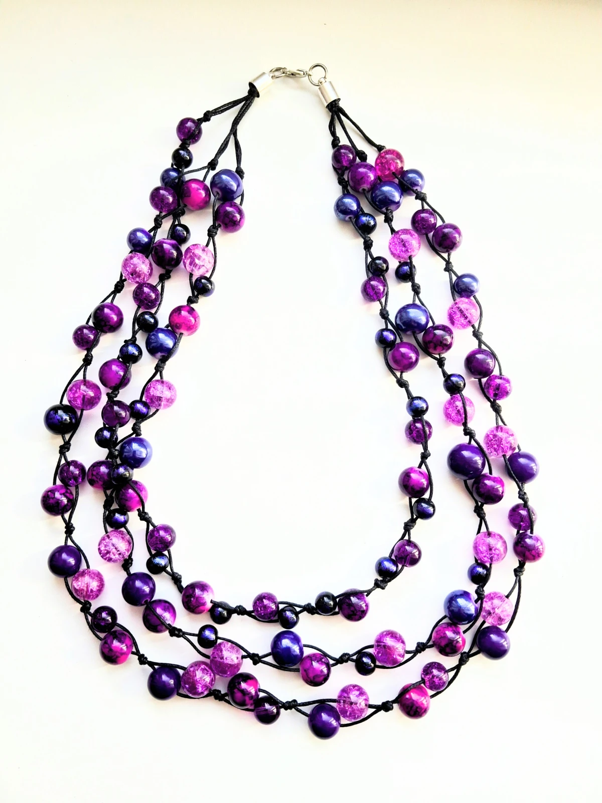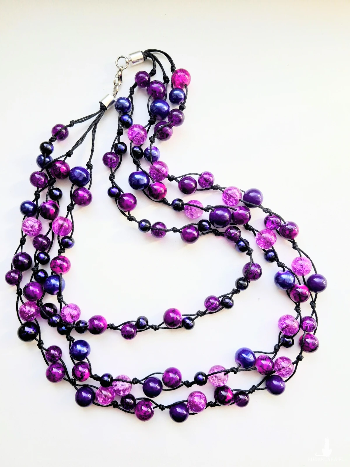 Niezwykły naszyjnik wykonany ręcznie w jednym egzemplarzu z pereł, koralików szklanych i 6 sznurków z bawełny woskowanej.