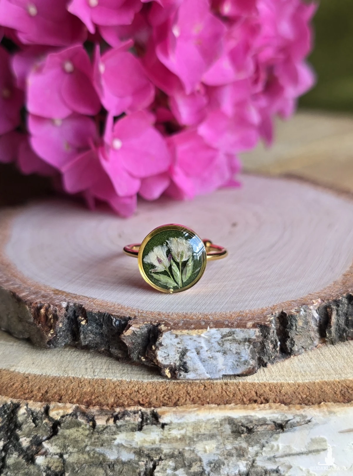 Oferuję Państwu unikalną biżuterię. Pierścionek jest wykonany z suszonych kwiatów i żywicy epoksydowej. Biżuteria jest wspaniałym i oryginalnym prezentem na lata.
