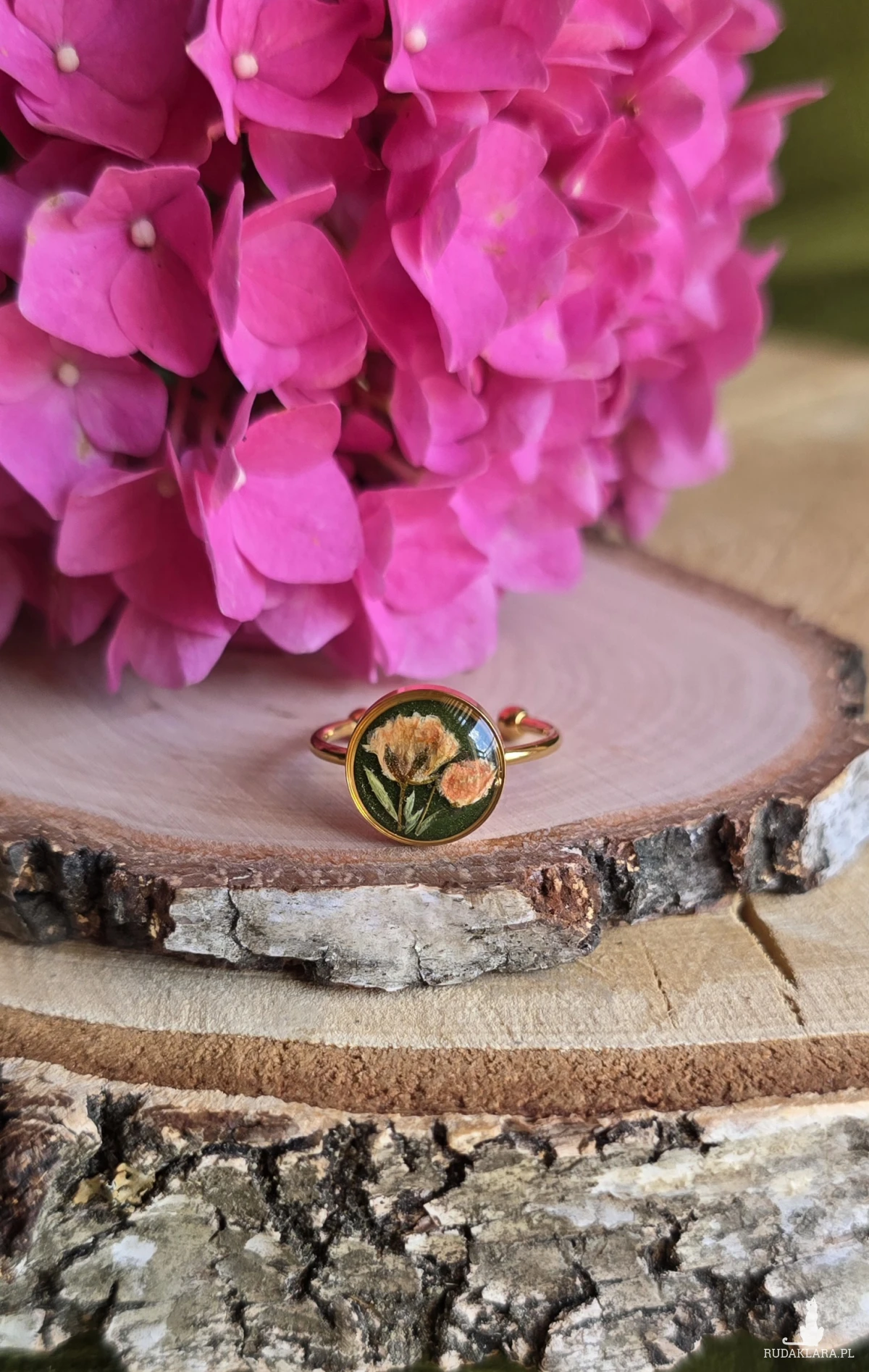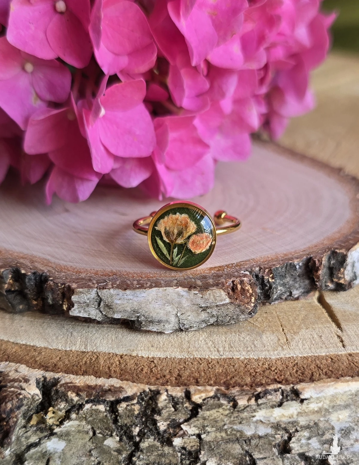 Oferuję Państwu unikalną biżuterię. Pierścionek jest wykonany z suszonych kwiatów i żywicy epoksydowej. Biżuteria jest wspaniałym i oryginalnym prezentem na lata.