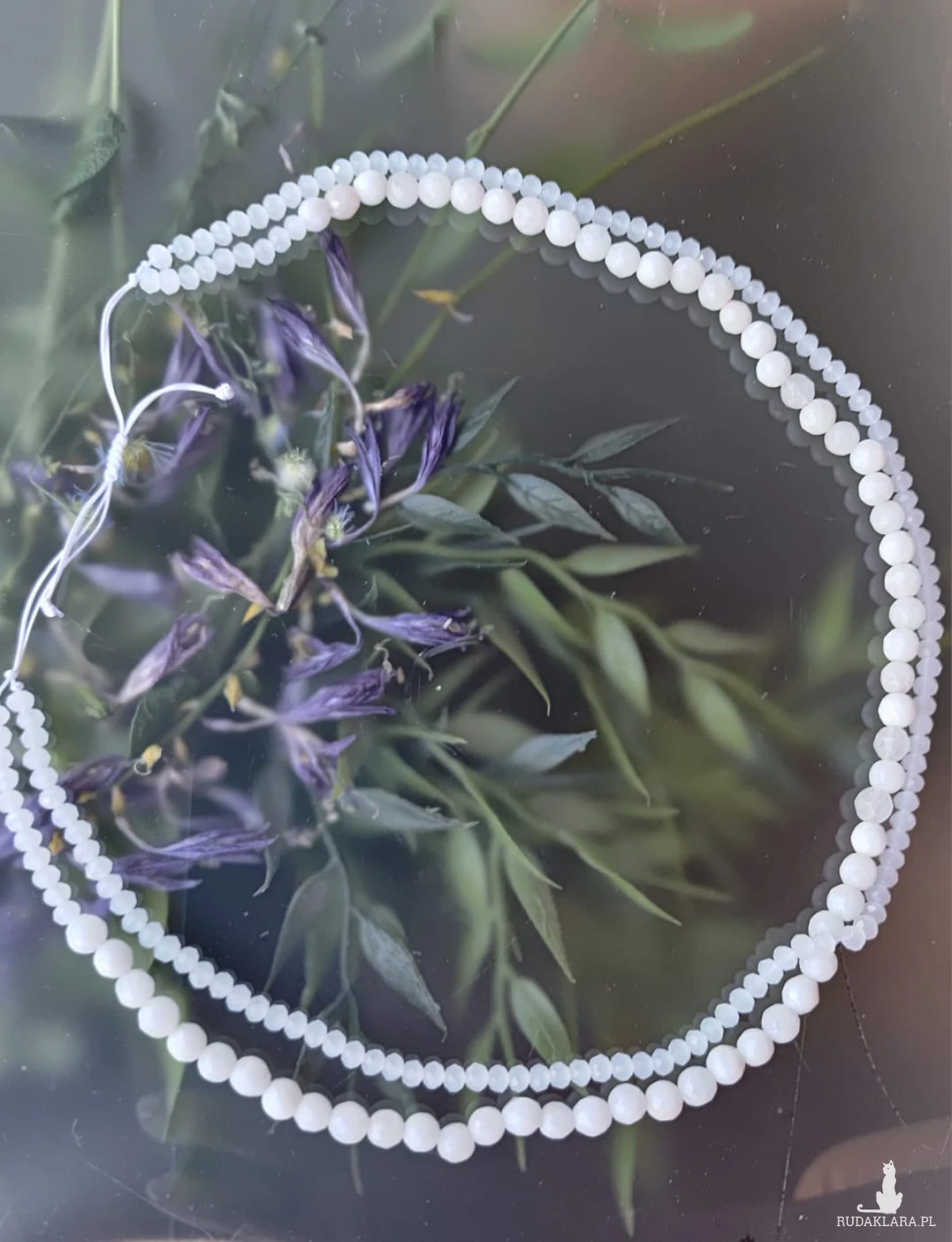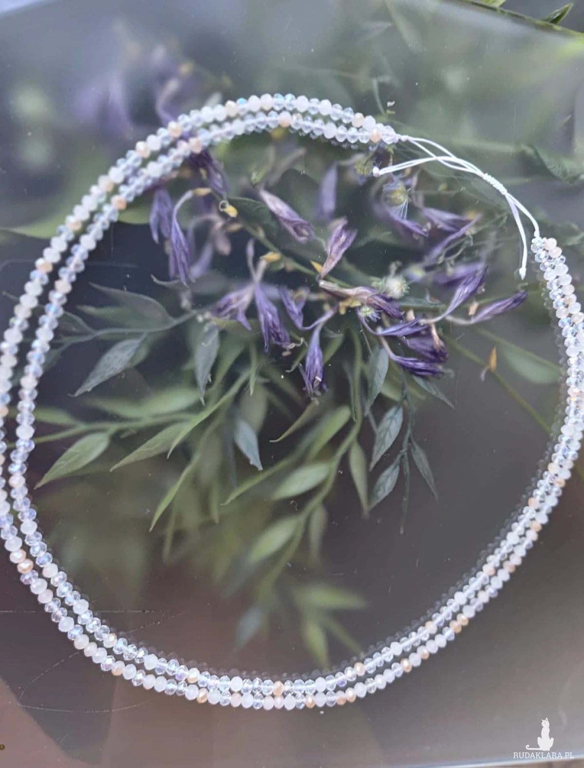 Naszyjnik kaskadowy z kamieni i szklanych koralików. Jadeit kulka 7 mm, koraliki szklane fasetowane beżowe, eqrue i białe transparentne kryształki. Sznurek syntetyczny. Dwa x2  sznurki. Każdy z naszyjników można nosić oddzielnie. Można również nosić jako bransoletkę. Zapięcie wyplecione ze sznurka ściegiem makramowym co pozwala na regulację. Maksymalny obwód 52 cm, należy zmierzyć obwód głowy.