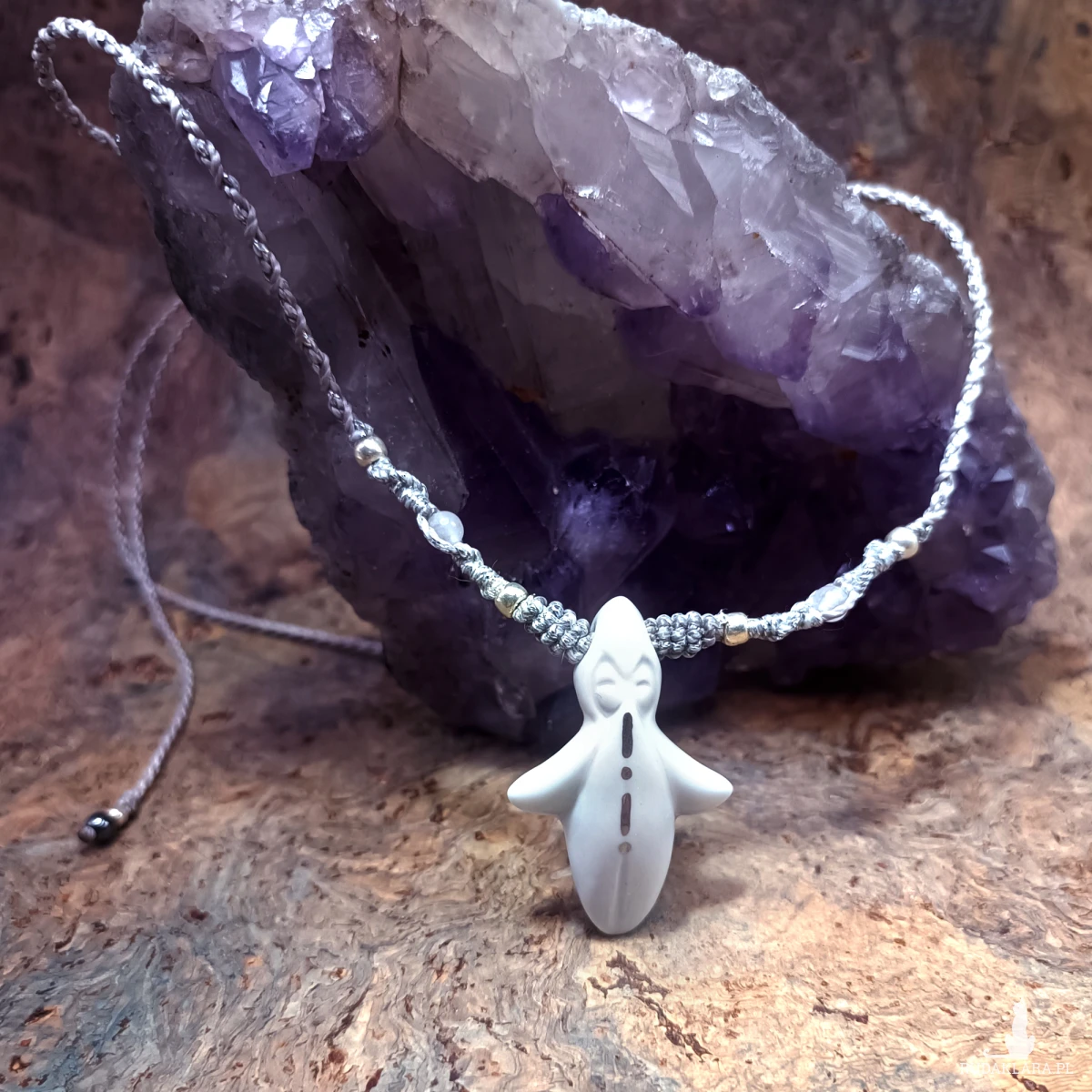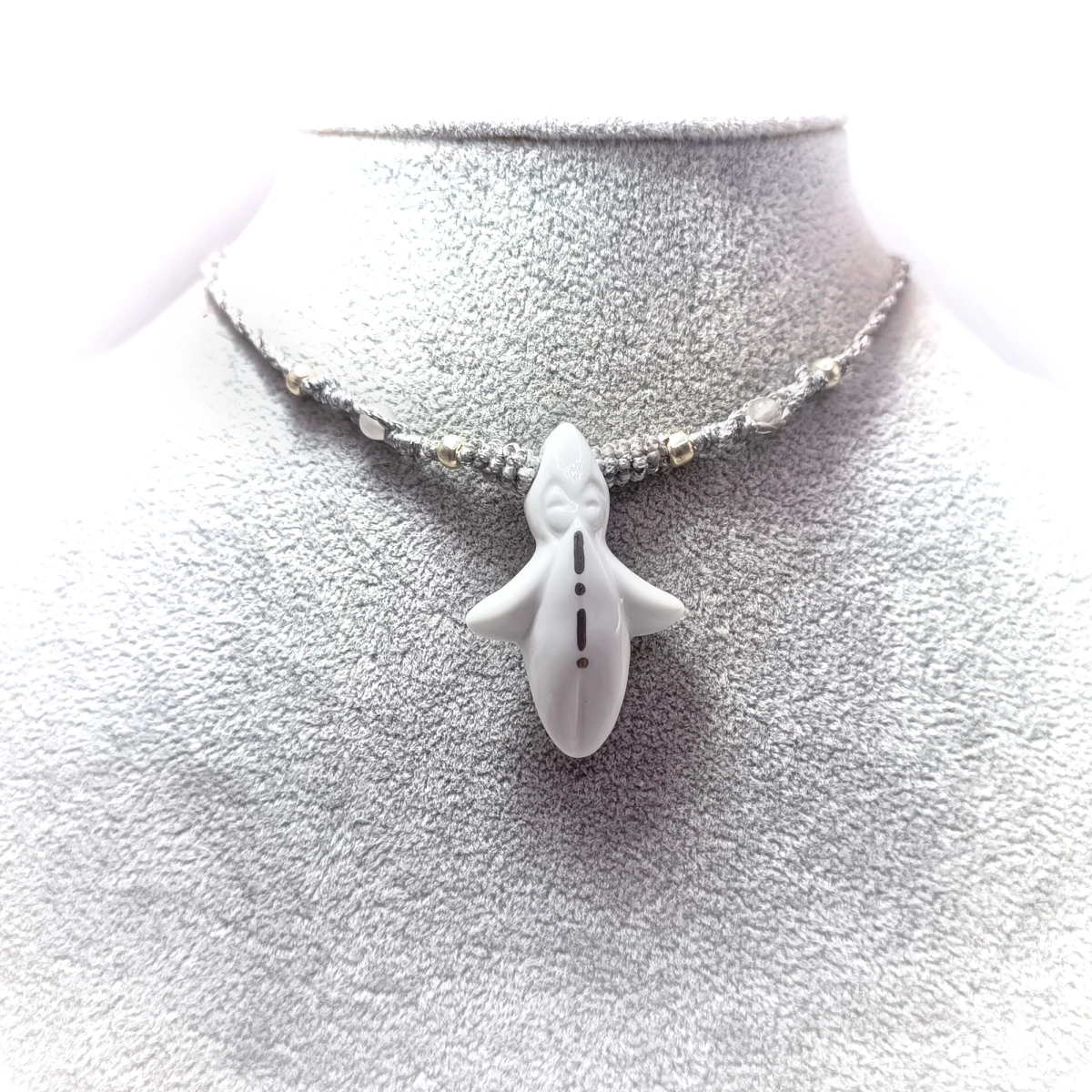 Talizman wykonany jest z porcelany, pokryty błyszczącym szkliwem i platyną. Oprawiony jest techniką mikromakramy, wykonaną ze sznurka o doskonałej jakości z dodatkiem agatów, jadeitu i szklanych koralików w kolorze złotym. Sam wisiorek ma 4 cm wysokości.