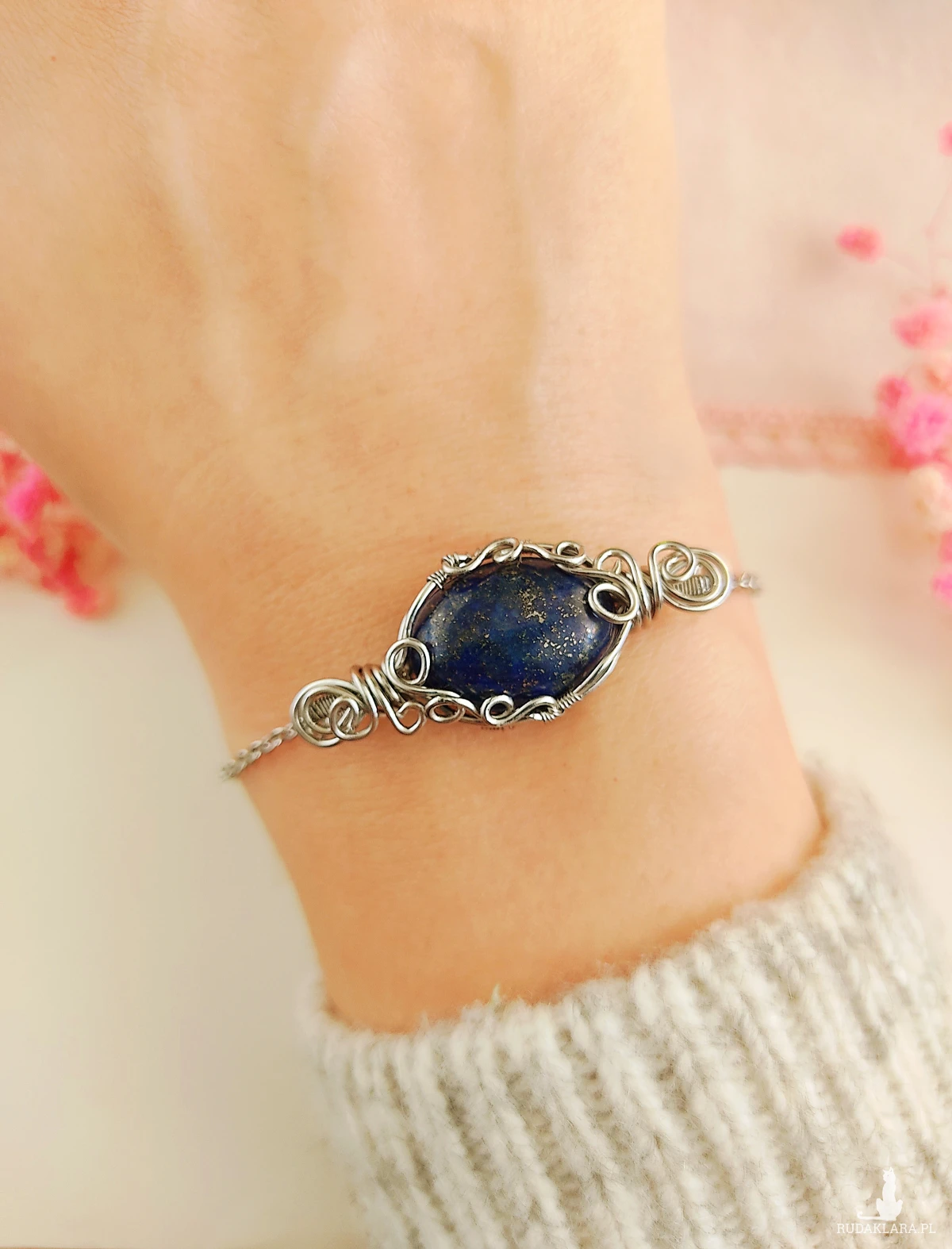 Bransoletka Lapis Lazuli ręcznie robiona. Wykonana techniką wire wrapping z drutów ze stali chirurgicznej.