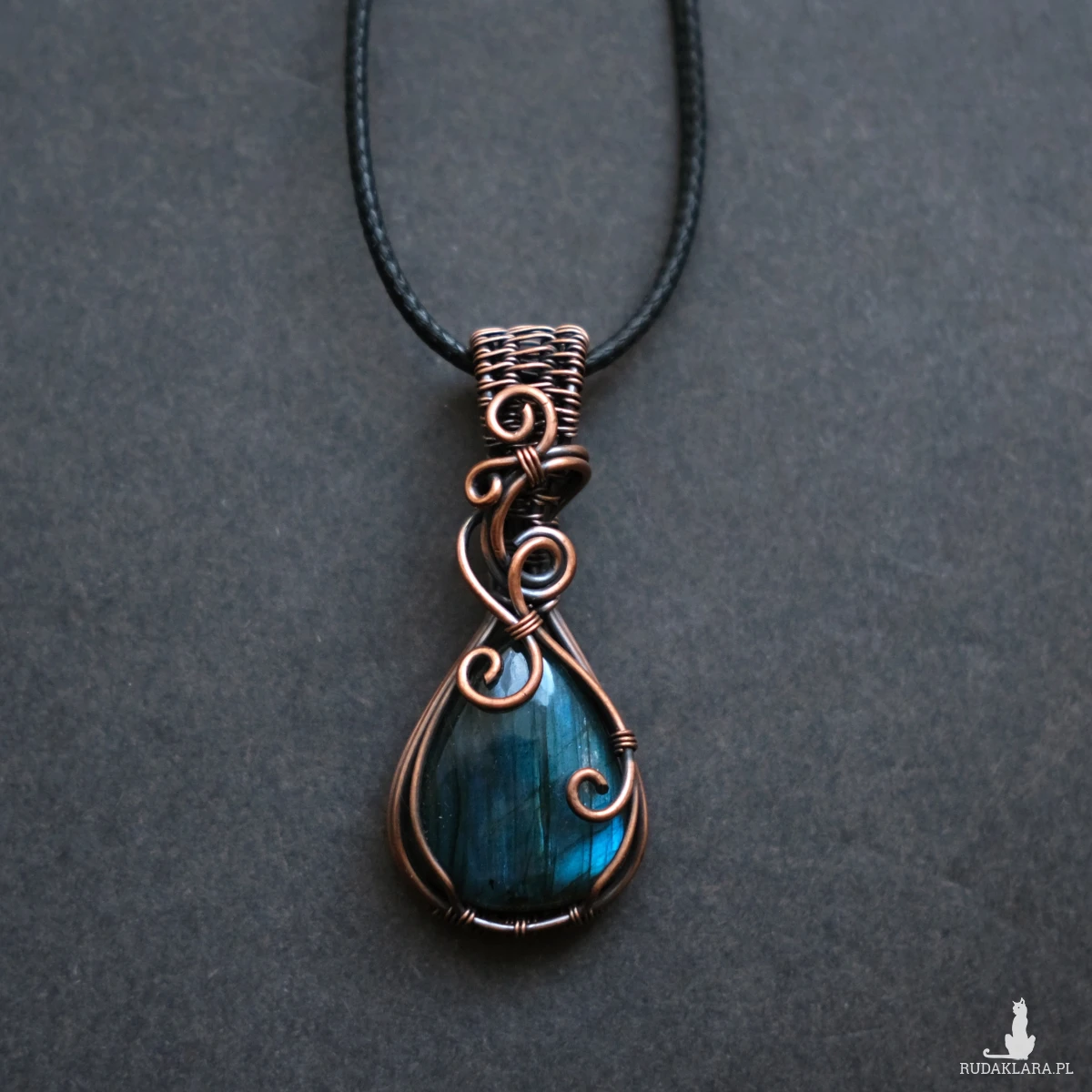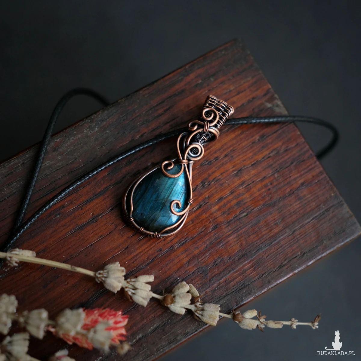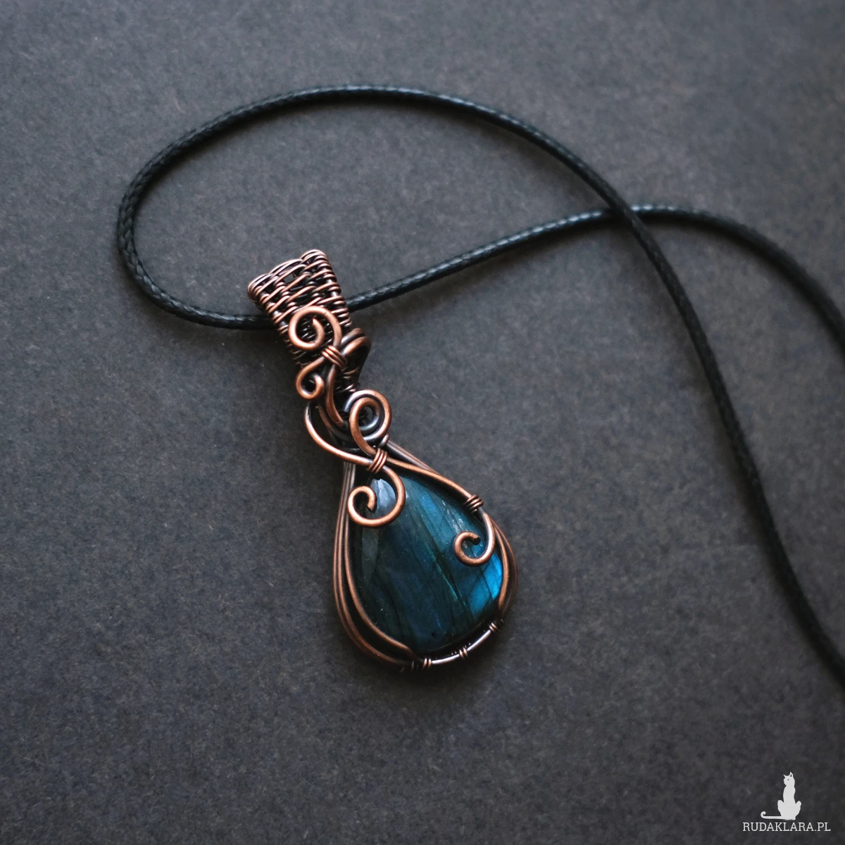 Miedziany wisiorek mieści w sobie kamień labradorytu o ciekawej niebieskiej iryzacji. Posiada szeroki ozdobny uchwyt oraz fantazyjne sploty miedzianego drutu. Świetnie dopełni stylizację kobiety stawiającej na drobną, ale pełną uroku biżuterię.
