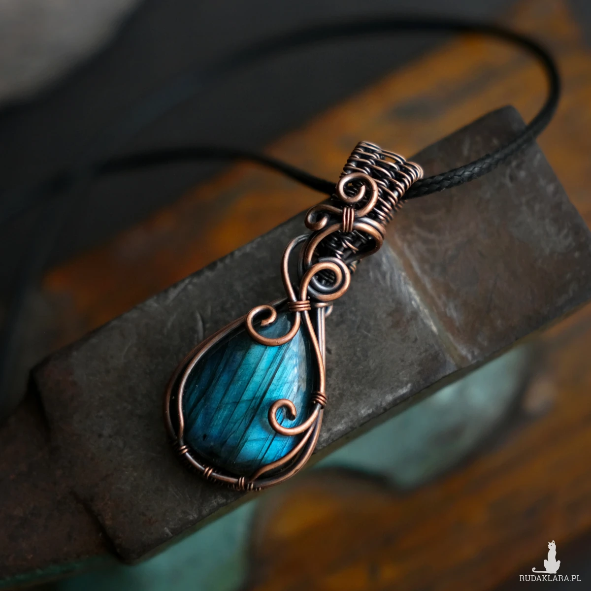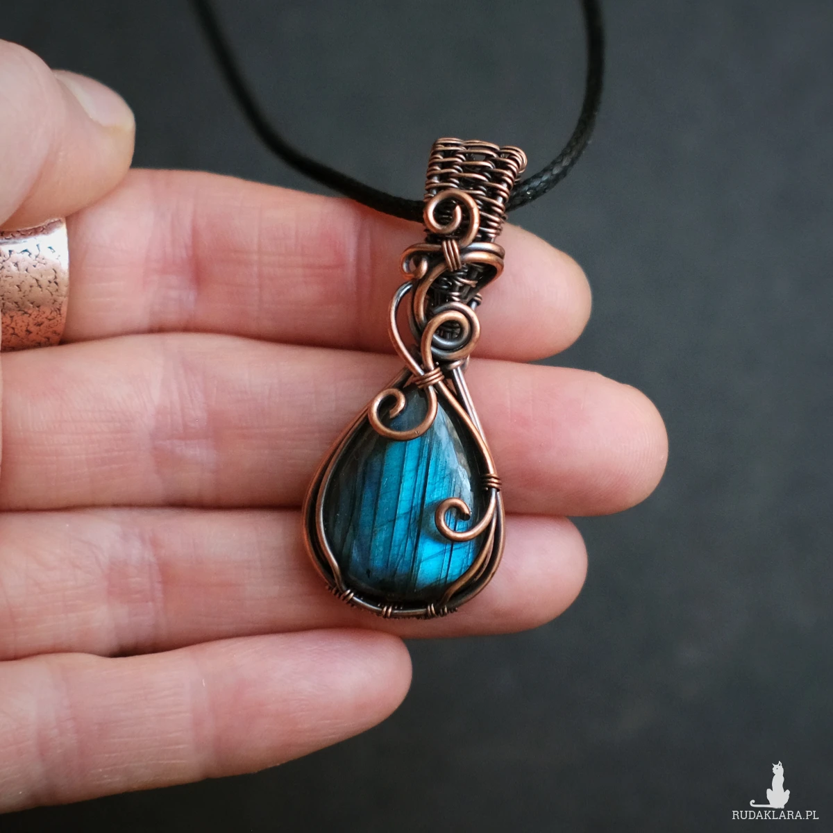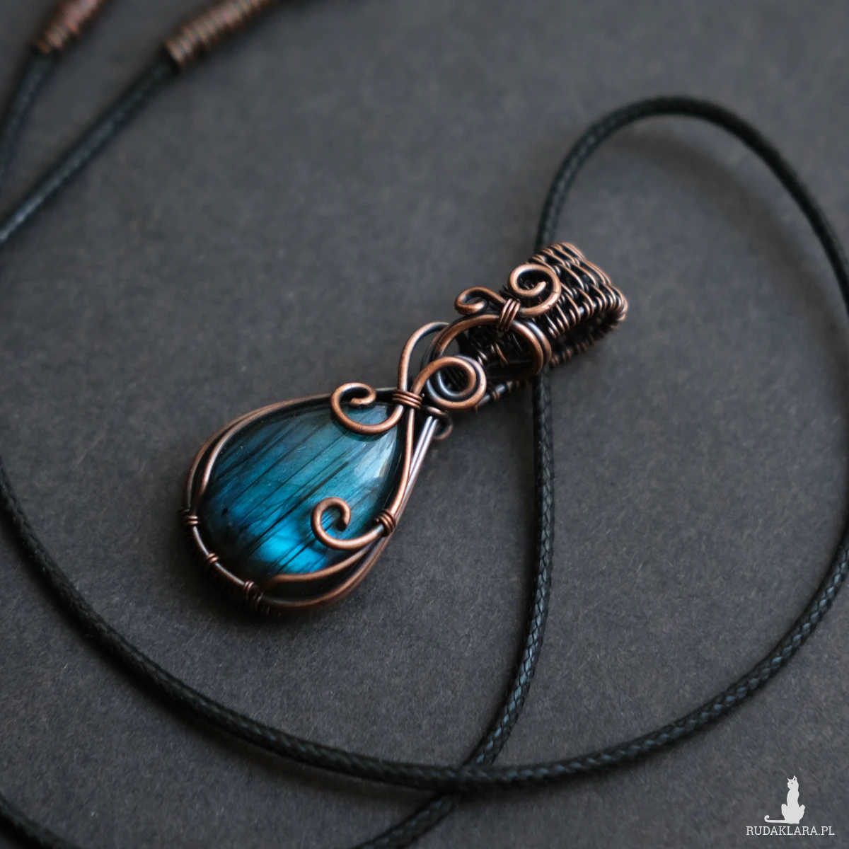 Miedziany wisiorek mieści w sobie kamień labradorytu o ciekawej niebieskiej iryzacji. Posiada szeroki ozdobny uchwyt oraz fantazyjne sploty miedzianego drutu. Świetnie dopełni stylizację kobiety stawiającej na drobną, ale pełną uroku biżuterię.