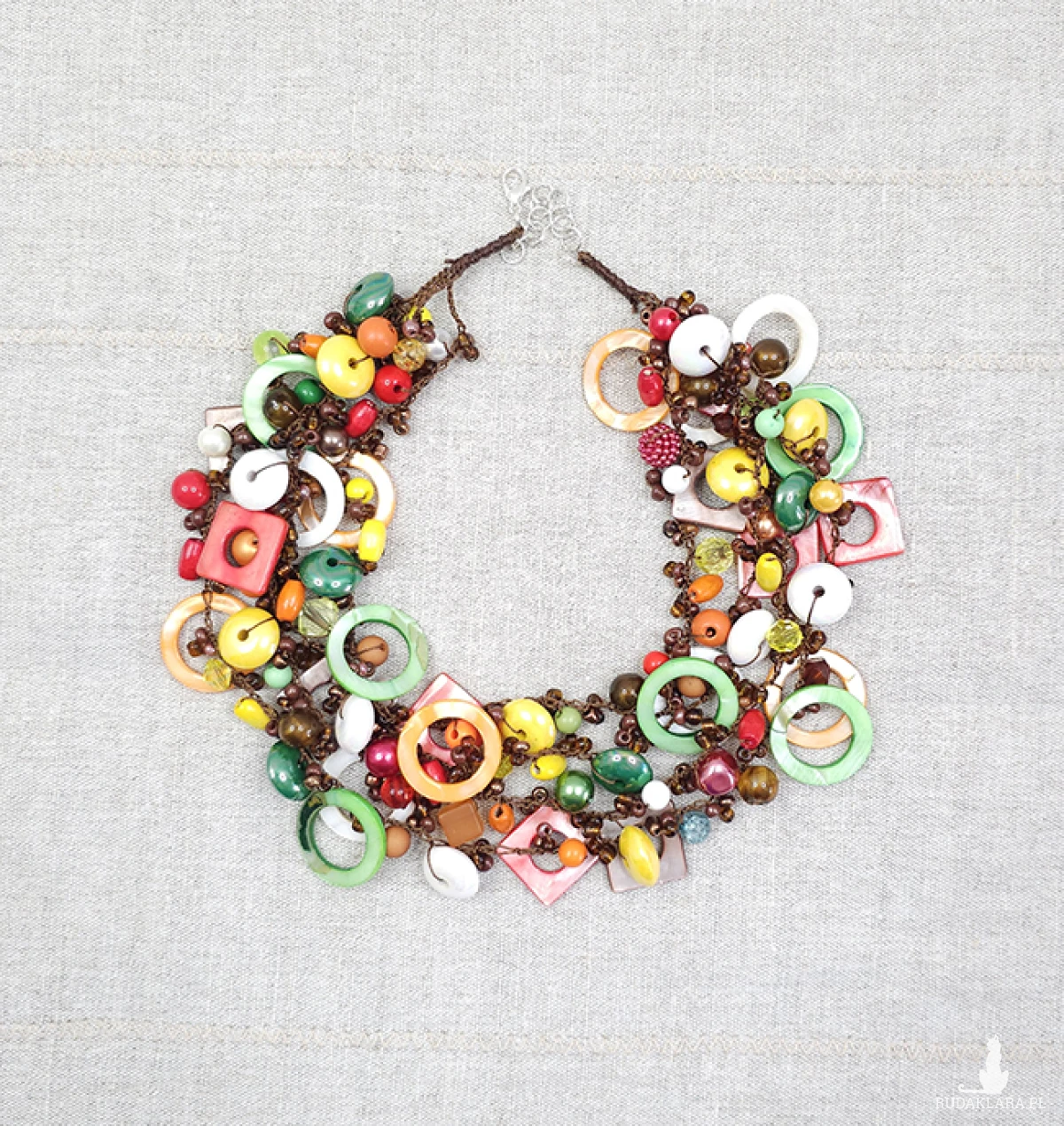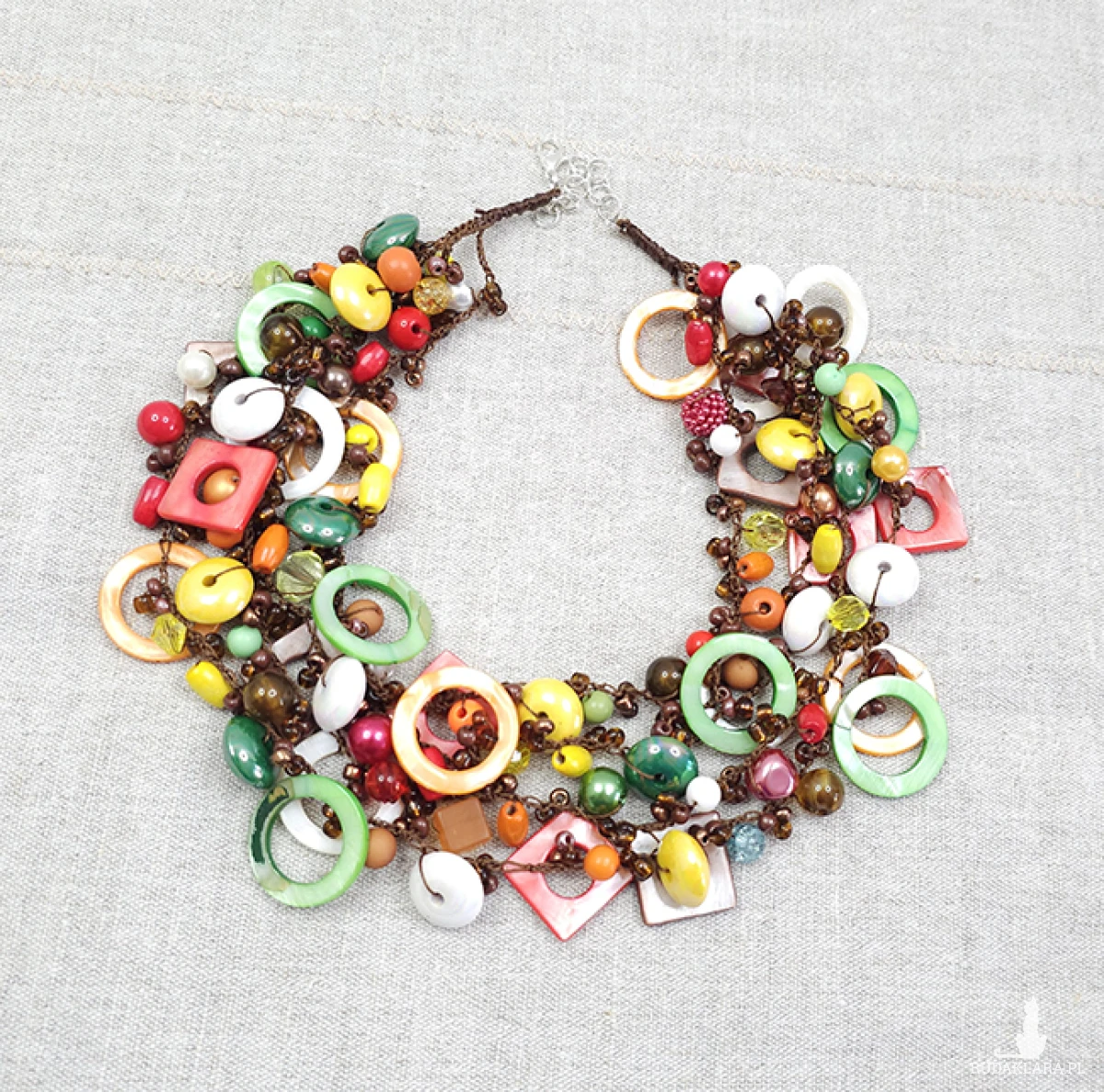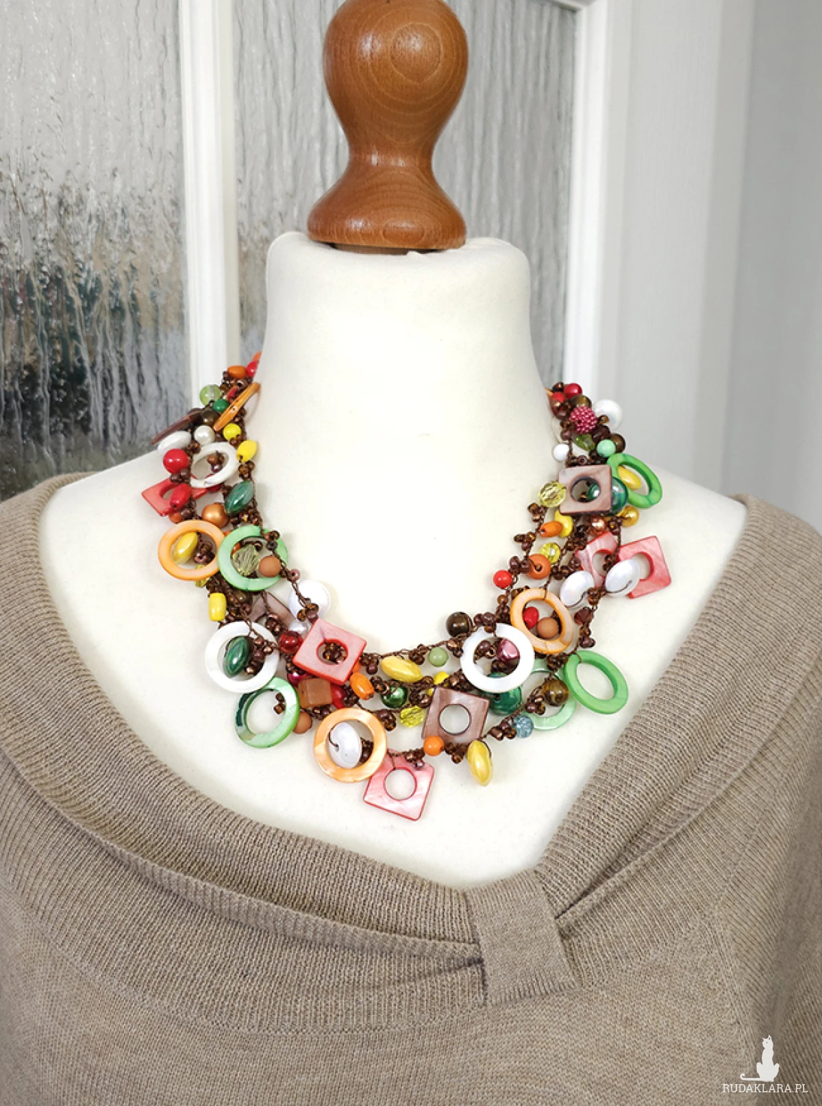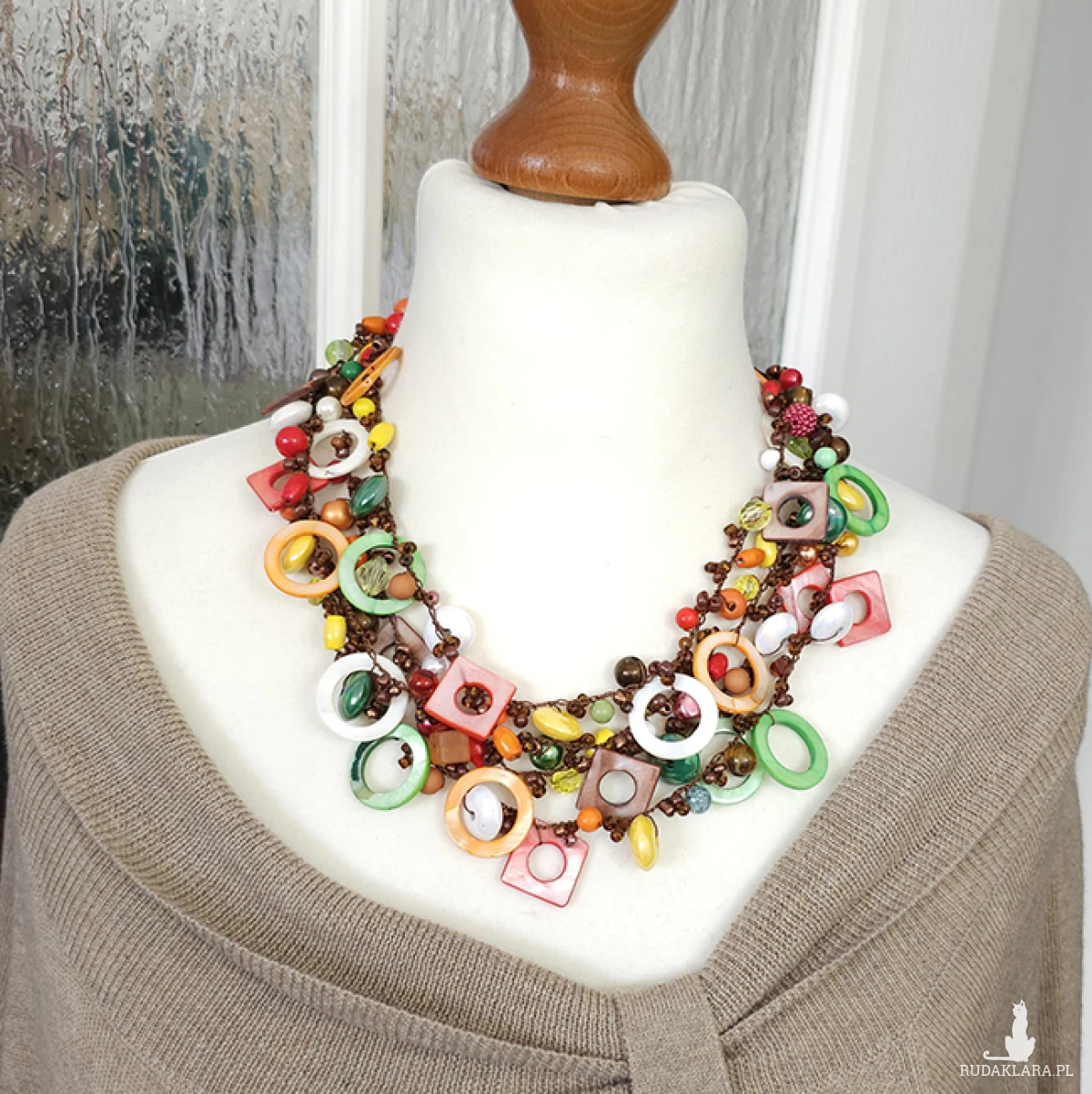 Przedstawiamy naszyjnik, w którym połączyliśmy różnorodne materiały: gładkie szkło i akryl, naturalne drewno i lśniąca masa perłowa (4-25 mm).