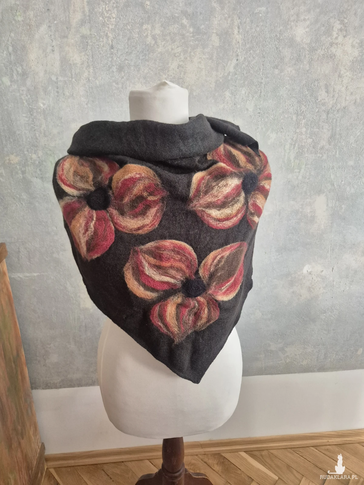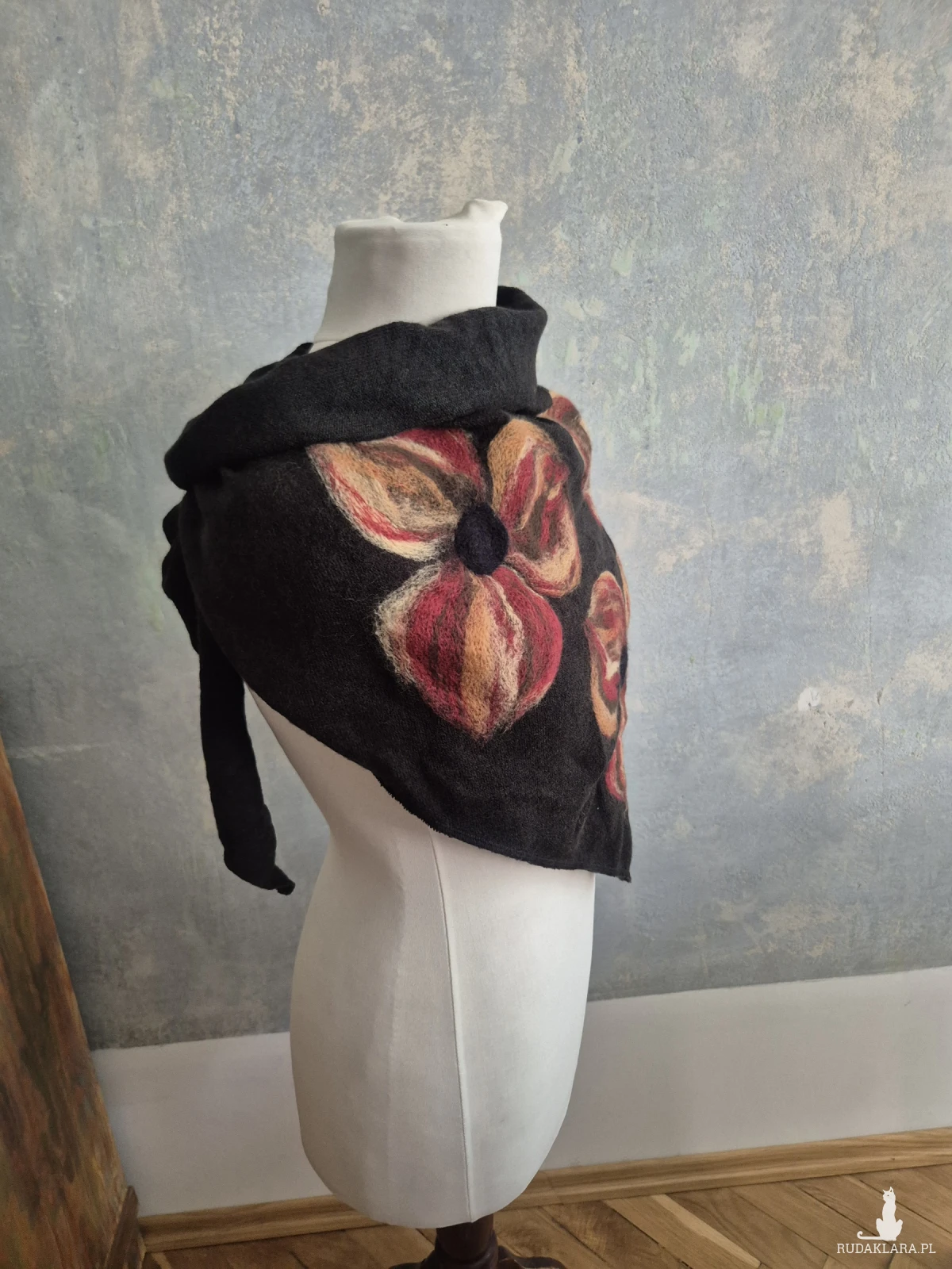 Czarna chusta handmade wełniana, elementy filcowane to wełna merynosów, produkt wysokiej jakości, chusta miła i ciepła, doskonała na chłodne dni, idealna na prezent, wspaniała na codzienne noszenie, zwraca uwagę swą oryginalnością, miękko układa się wokół szyi, absolutny bestseller polecam czas oczekiwania tydzien box a1