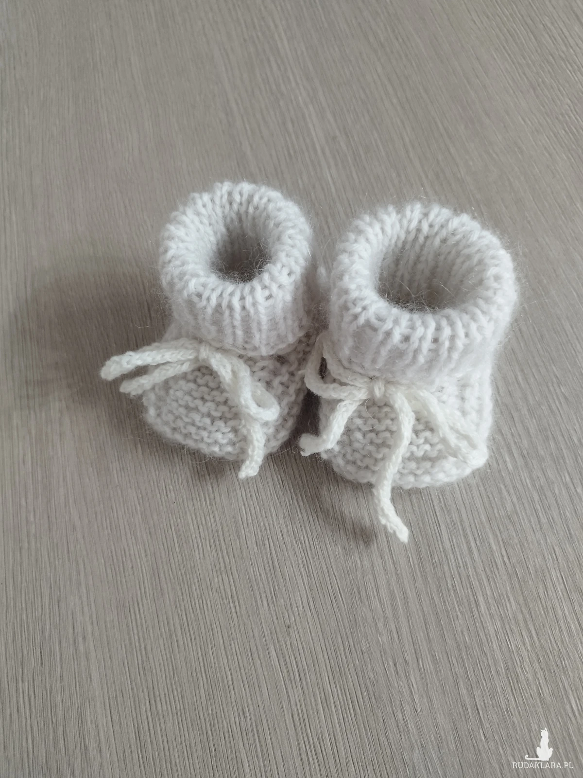 Buciki zrobione na drutach. Z przodu wiązane sznureczkiem. Skład wełna merino, moher i jedwab. Rozmiar 0-3mies