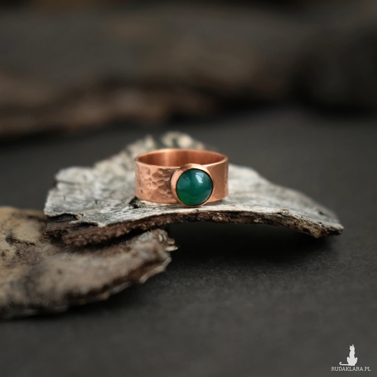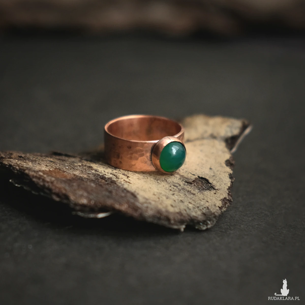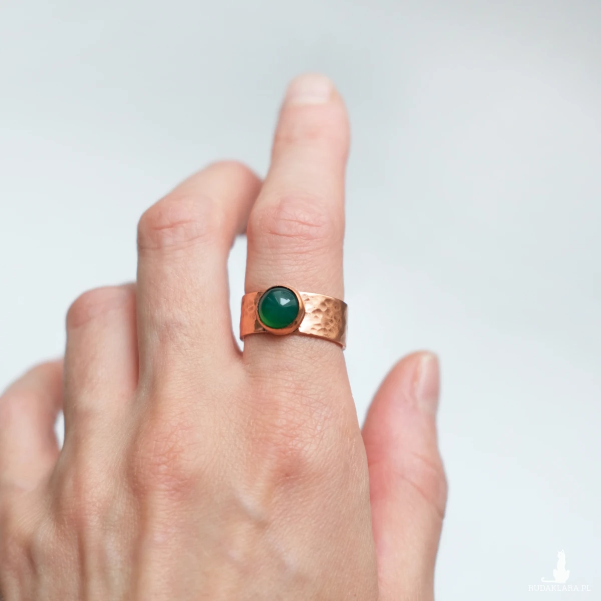 Pierścionek na szerokiej fakturowanej obrączce mieści w sobie kamień onyksu w zielonym kolorze. Pierścionek został wykonany ręcznie z miedzi, średnica kamienia 8 mm.