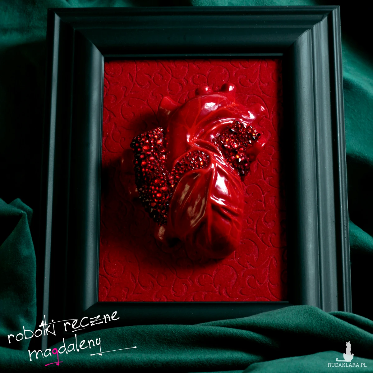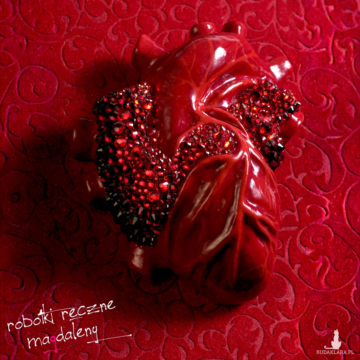 Odlew serca z gipsu polimerowego pomalowany farbami i zabezpieczony lakierem. Ozdobiony czerwonymi, szklanymi kryształkami.