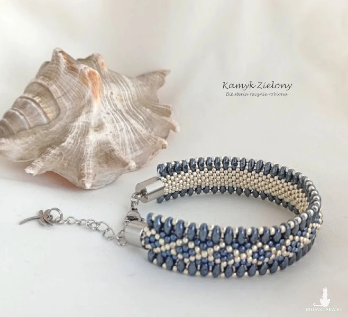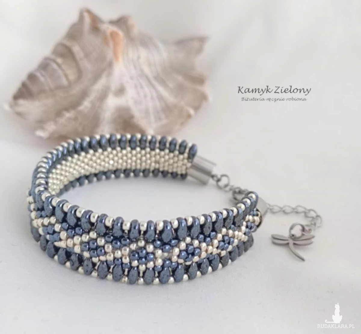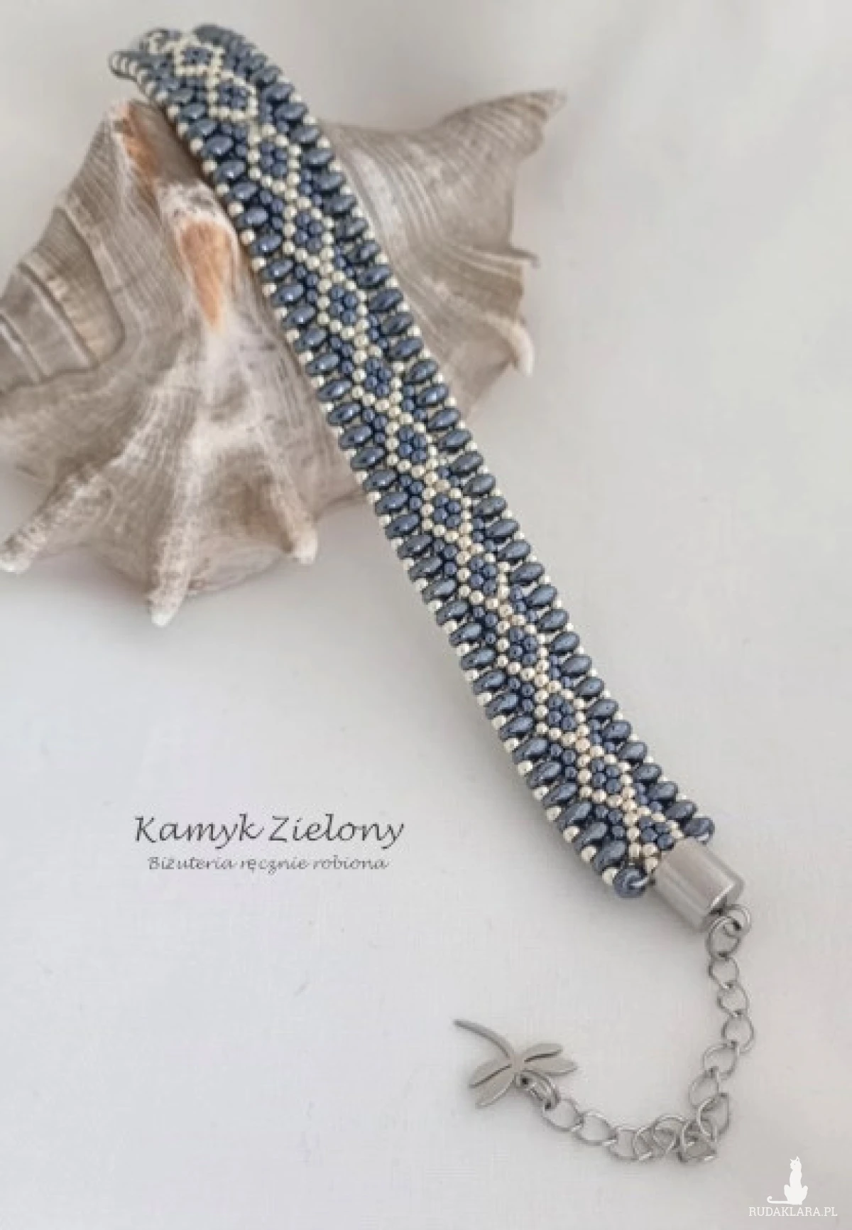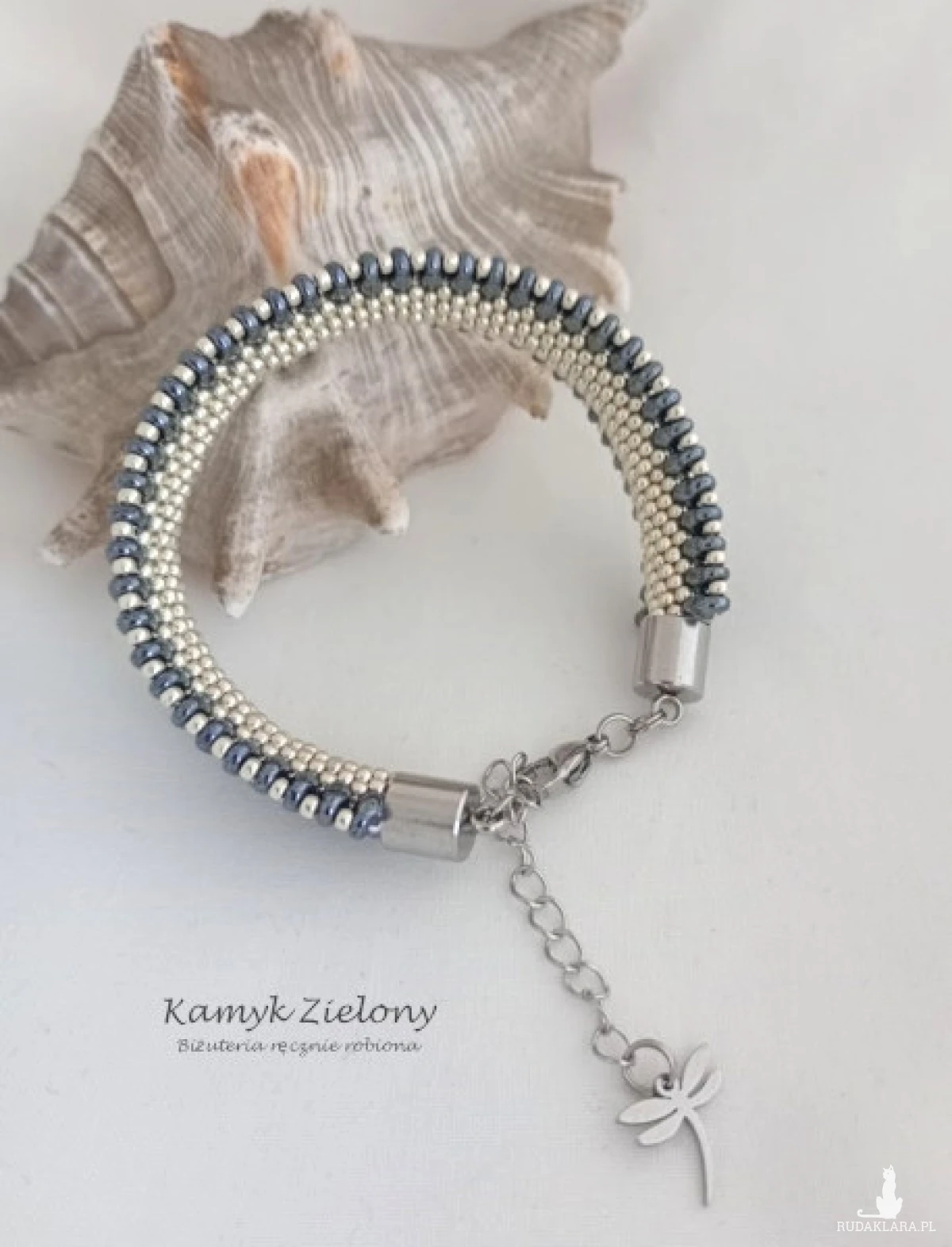 Bransoletka w formie dwustronnej gąsieniczki zrobiona została z doskonałej jakości koralików ze szkła japońskiej firmy Toho oraz czeskich koralików Preciosa (koraliki brzegowe). Dobrane w niej dwa kolory - hematytowy oraz srebrny pięknie ze sobą współgrają, tworząc wyjątkową i bardzo oryginalną ozdobę.