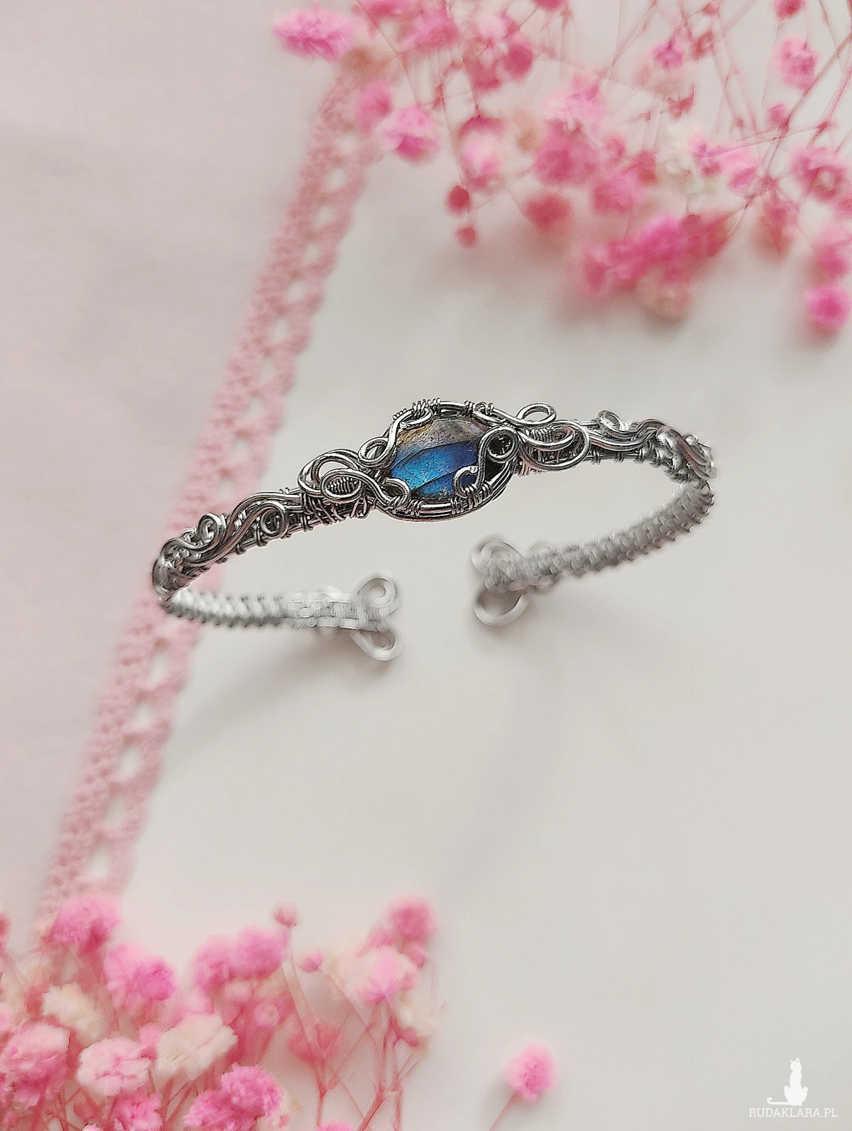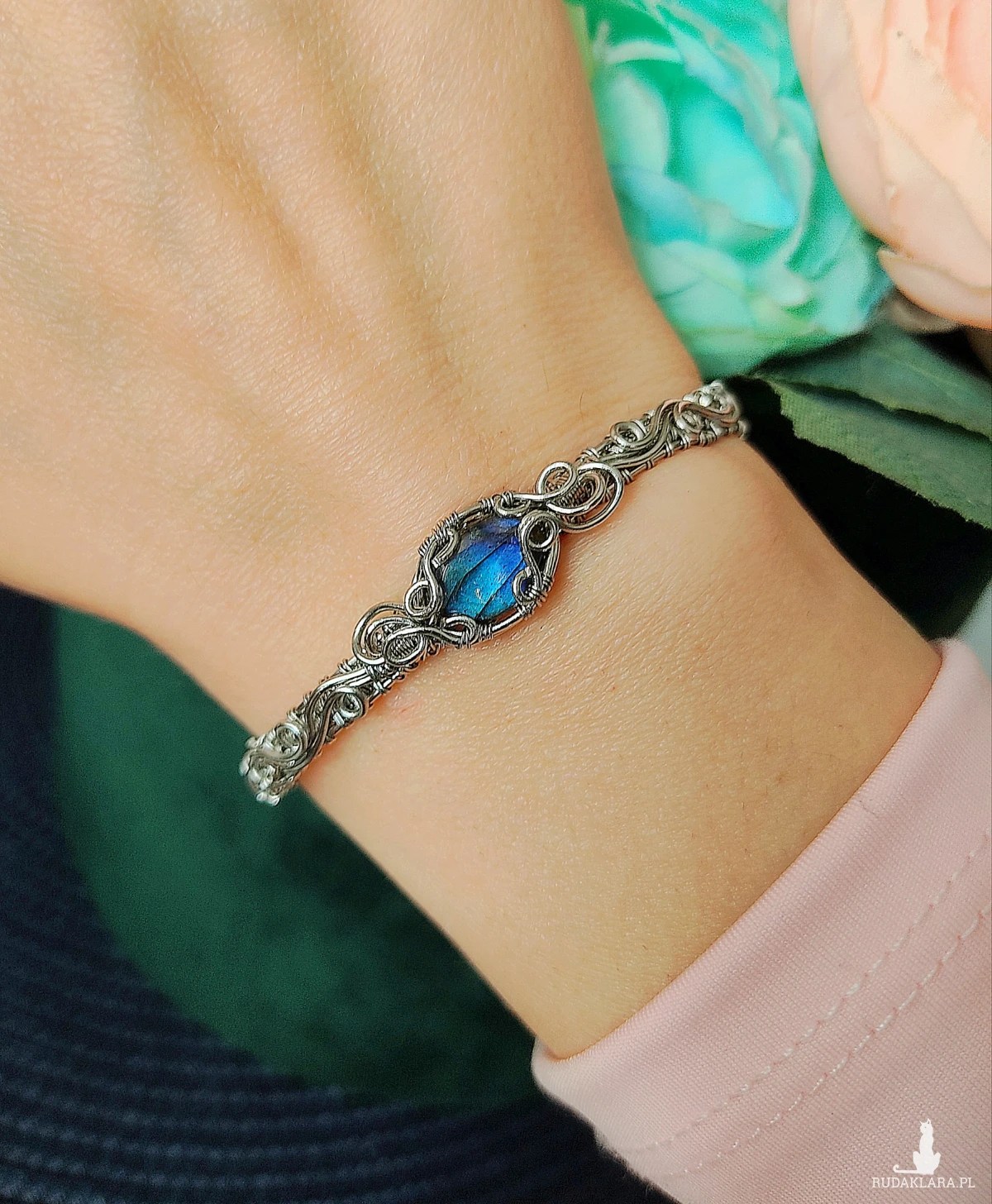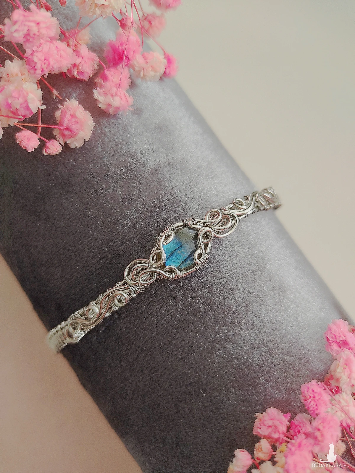 Bransoletka Labradoryt Niebieski ręcznie robiona. Wykonana techniką wire wrapping z drutów ze stali chirurgicznej.
