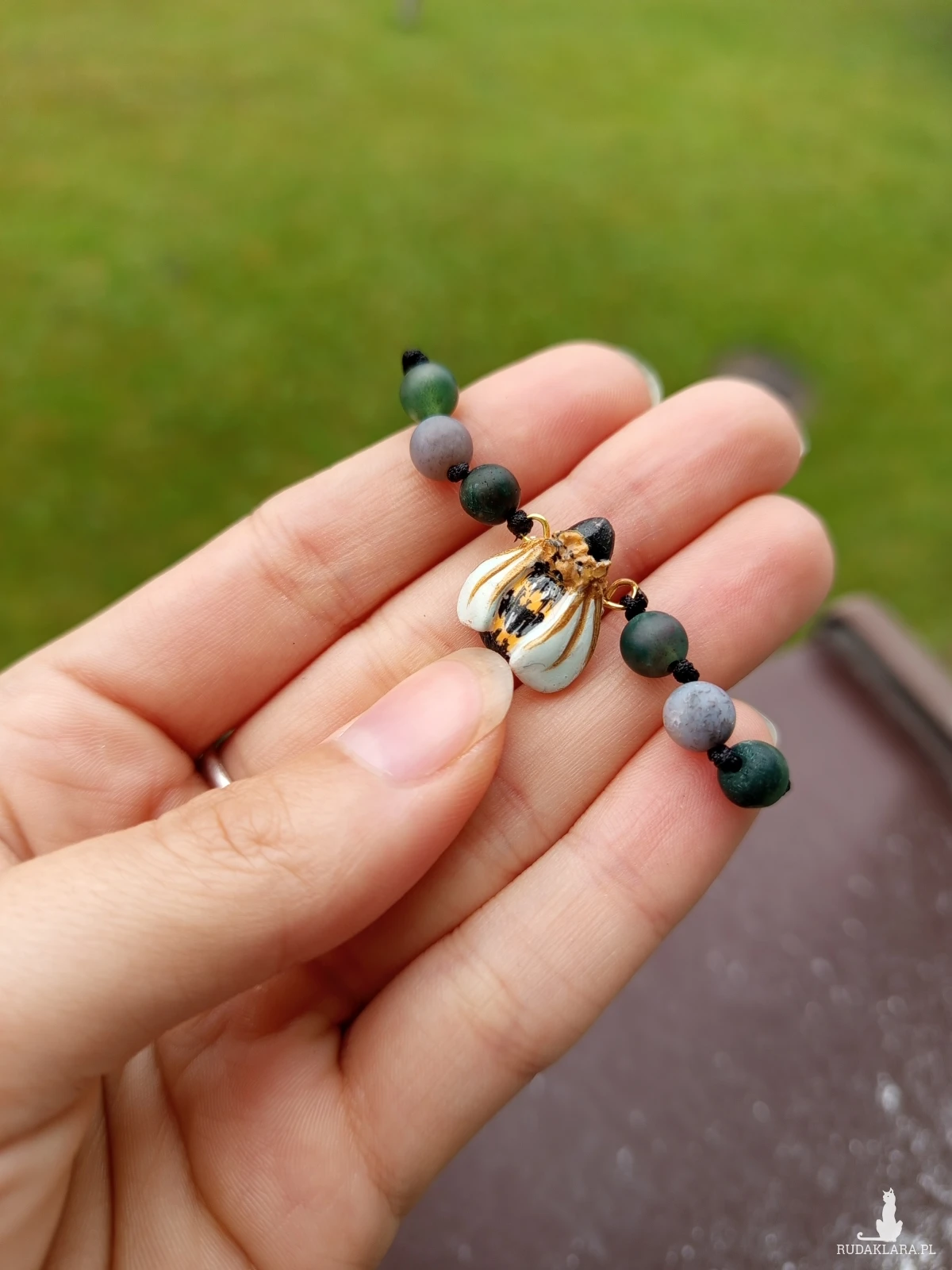 Delikatna, a zarazem pełna symboliki – ta ręcznie wykonana bransoletka zdobiona jest uroczą pszczółką z glinki polimerowej, która wprowadza w klimat natury i letnich łąk. Towarzyszy jej agat, kamień harmonii, równowagi i ochrony, który nadaje całości subtelnego, naturalnego charakteru.