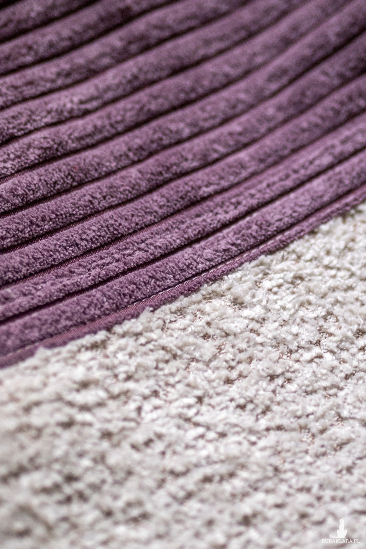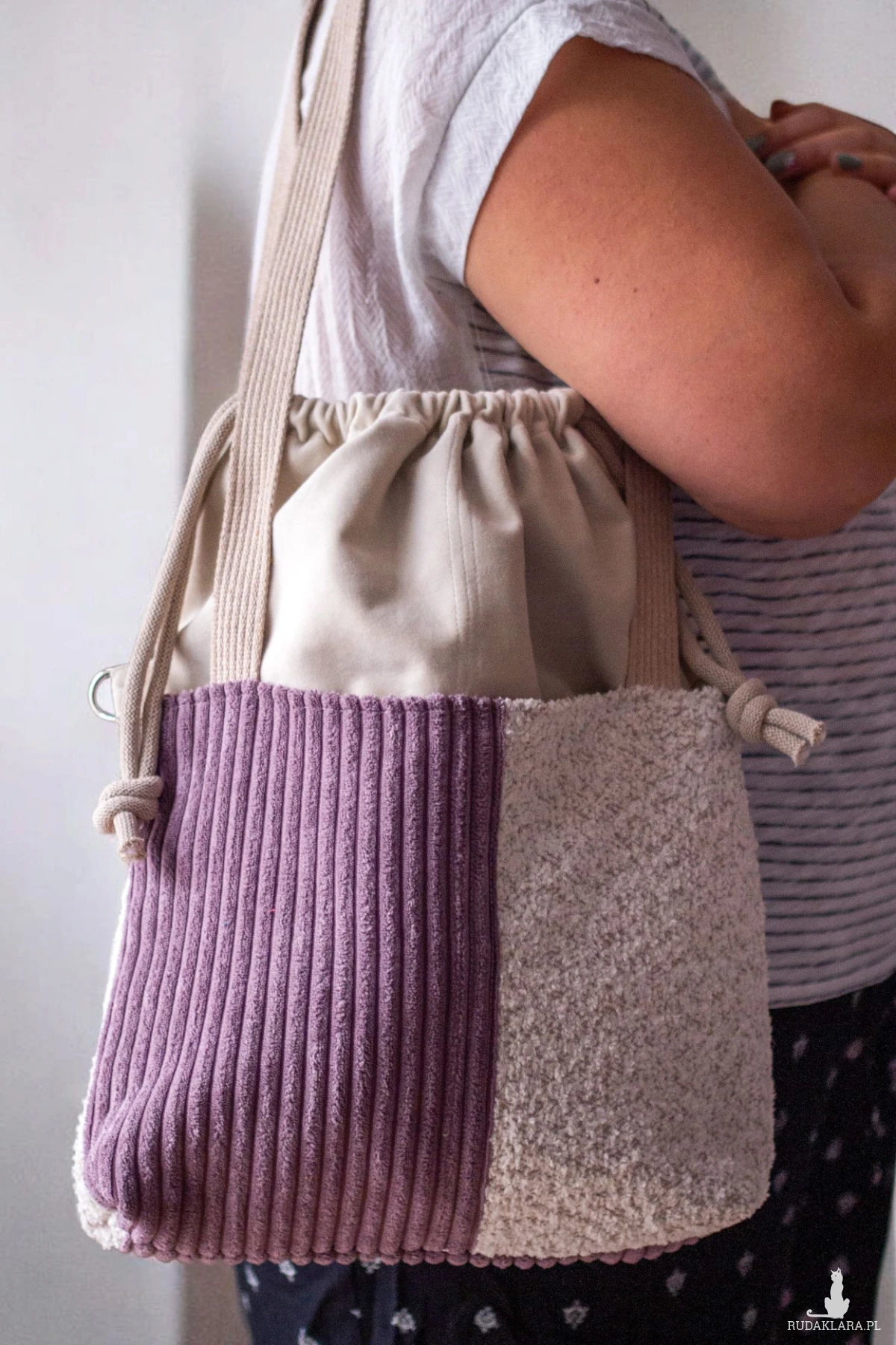 Torba worek wykonana z weluru, tkaniny typu "baranek" oraz grubego sztruksu. Stworzona w duchu no waste.