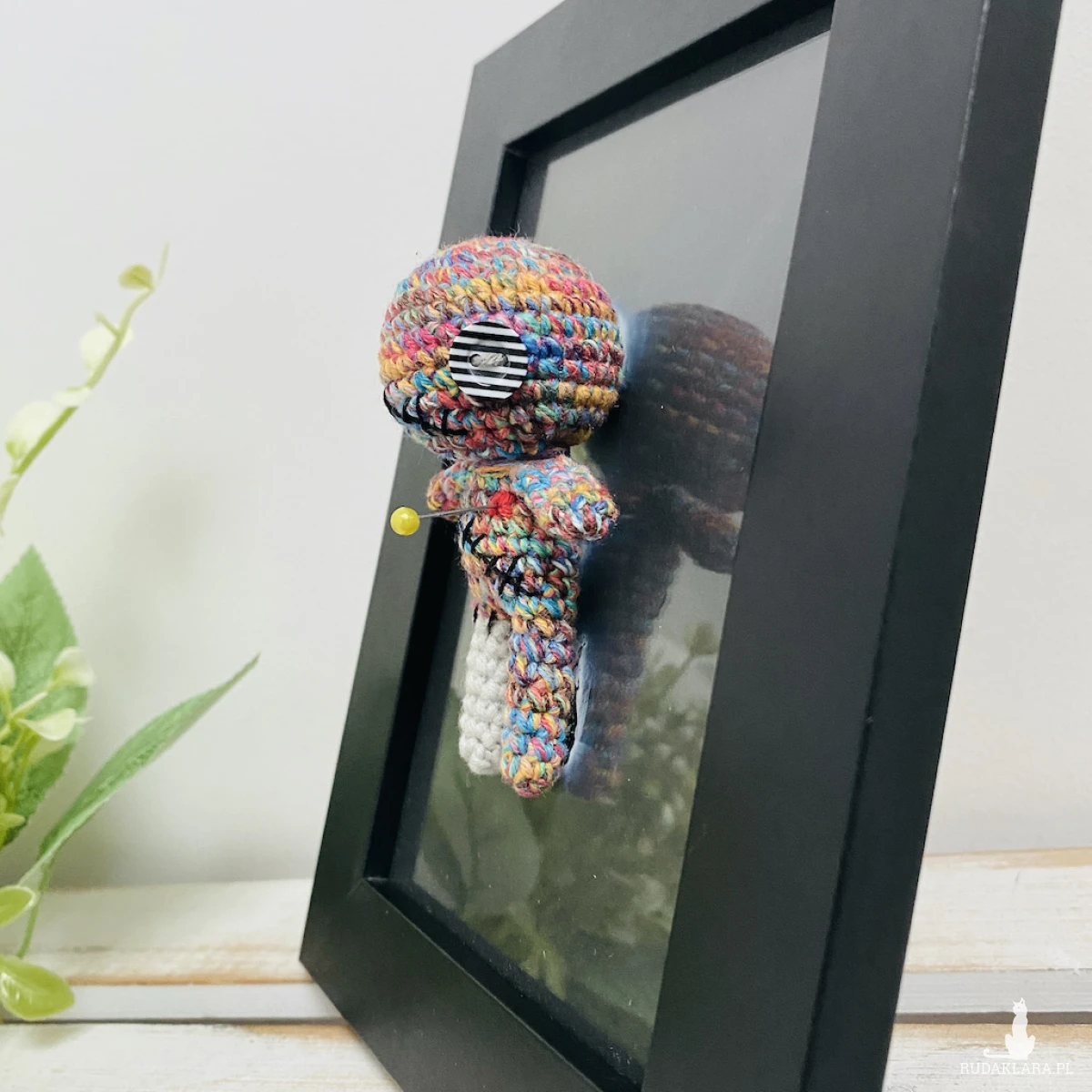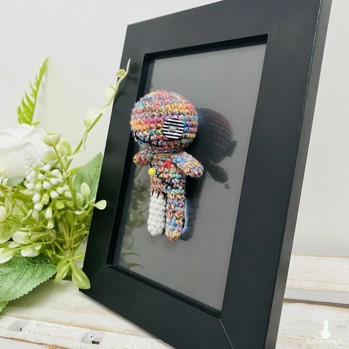 Ta ręcznie robiona na szydełku laleczka voodoo w eleganckiej ramce to idealny miks magii, humoru i designu.