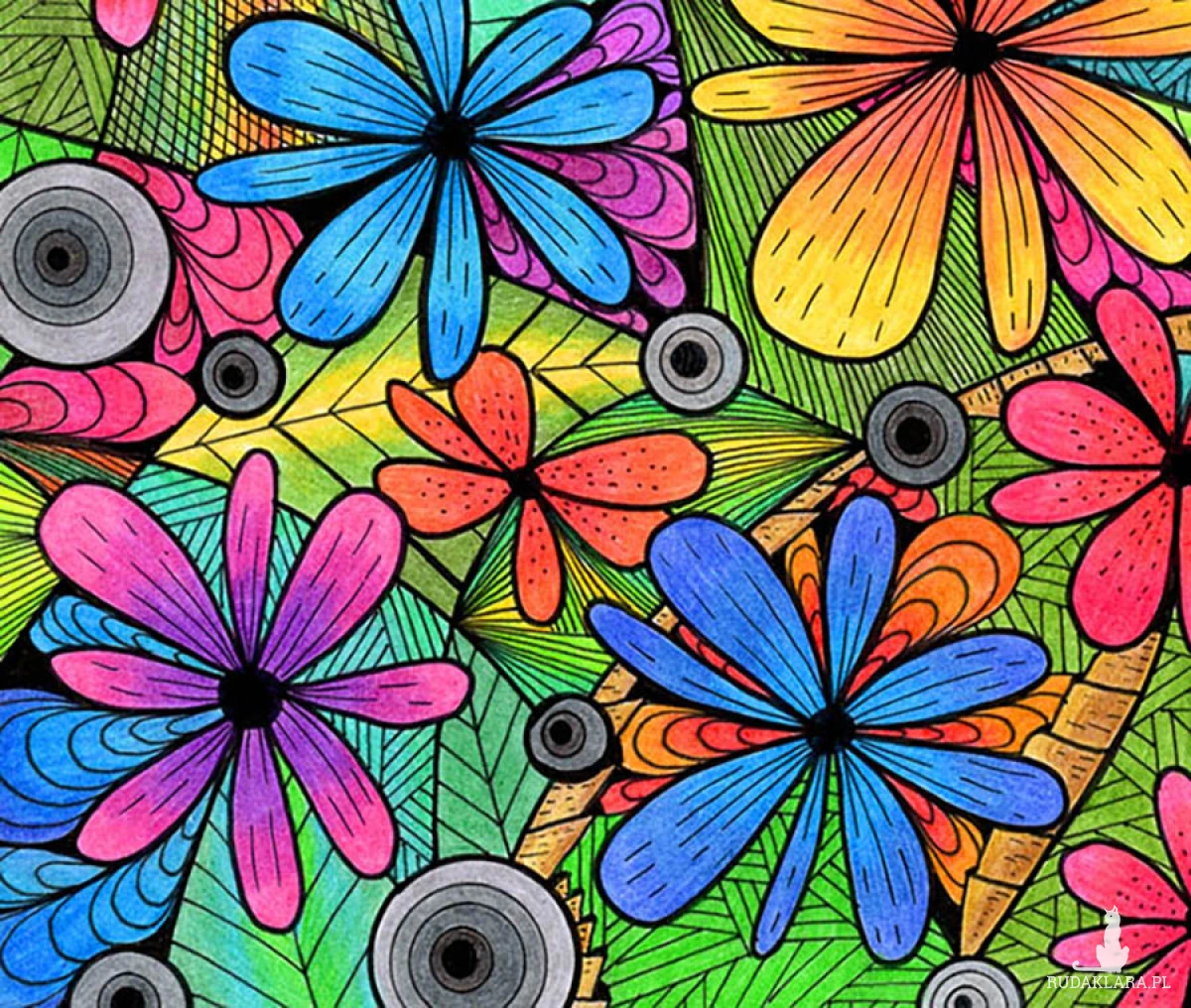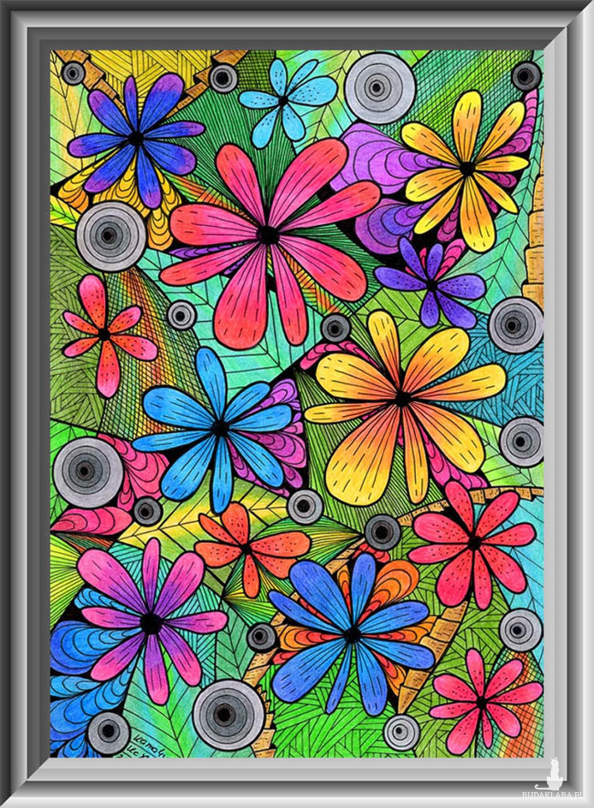 „Zaczarowany ogród” to metafora wewnętrznego świata pełnego barw, różnorodności i życia. Każdy kwiat na obrazie jest inny –