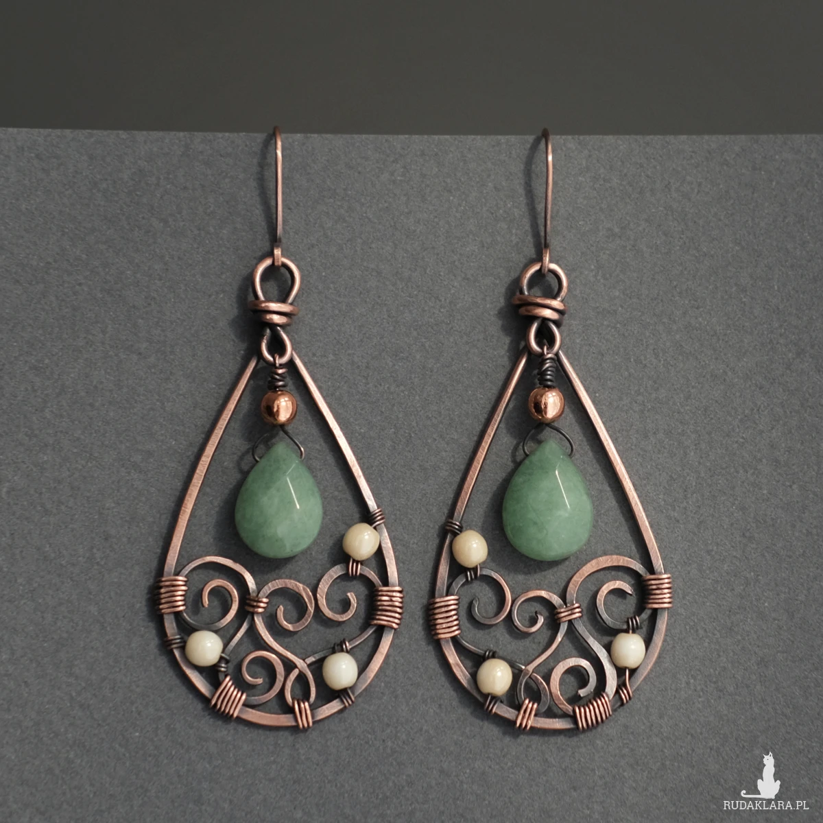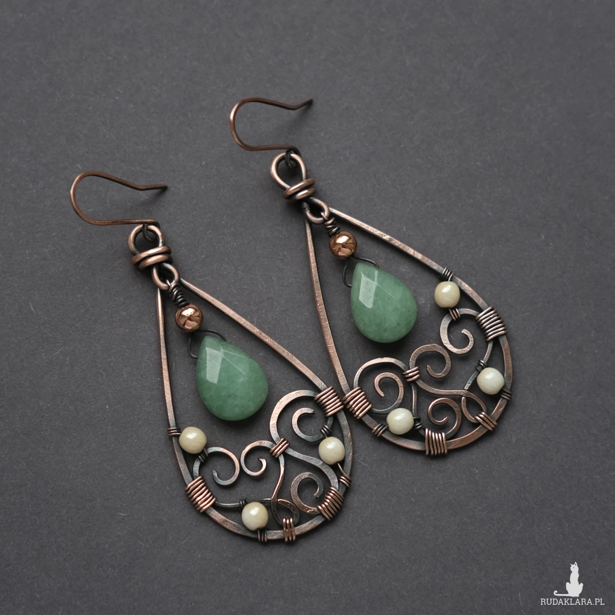 Wiszące miedziane kolczyki wykonane pracochłonną i efektowną metodą wire wrapping. Kolczyki mają kształt łezki, a w środku ozdobione są klimatycznymi oplotami, to wyjątkowy i unikatowy komplet, którego nie znajdziecie nigdzie indziej. Posiadają barwione kamienie jadeitu oraz koraliki hematytu. Wykonane w pełni ręcznie z oksydowanej miedzi, są efektowne ale jednocześnie lekkie.