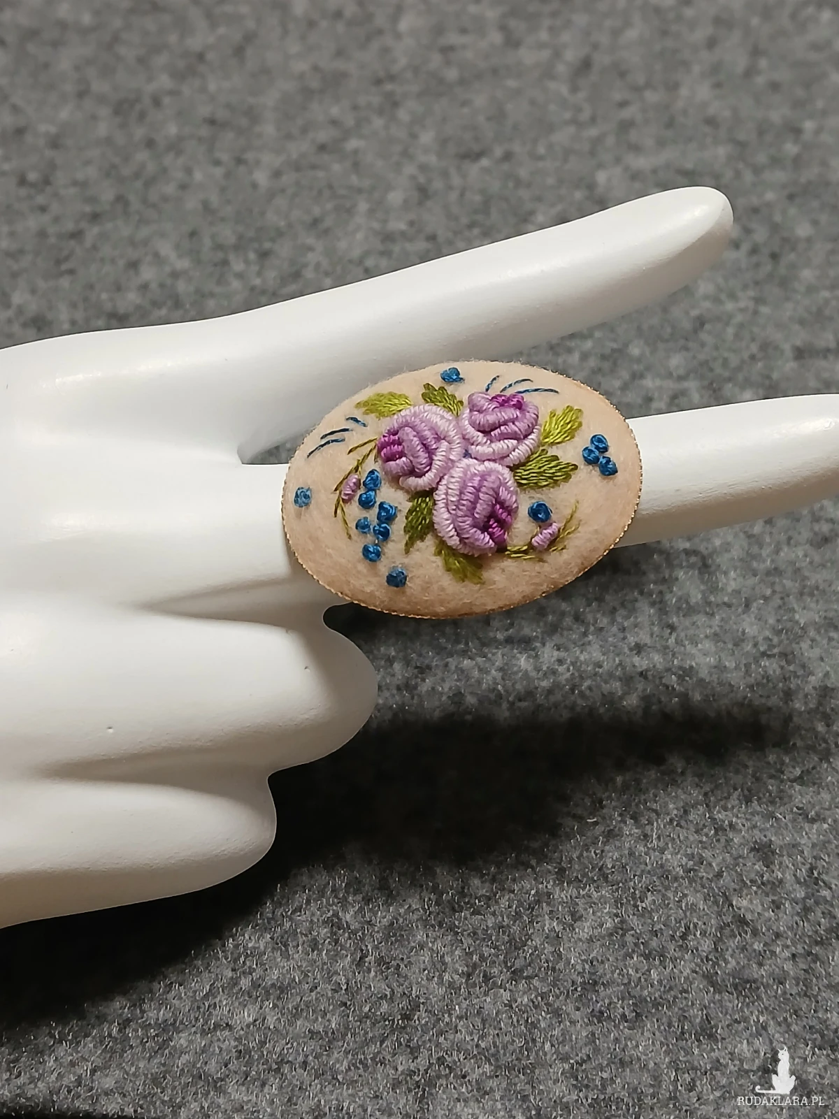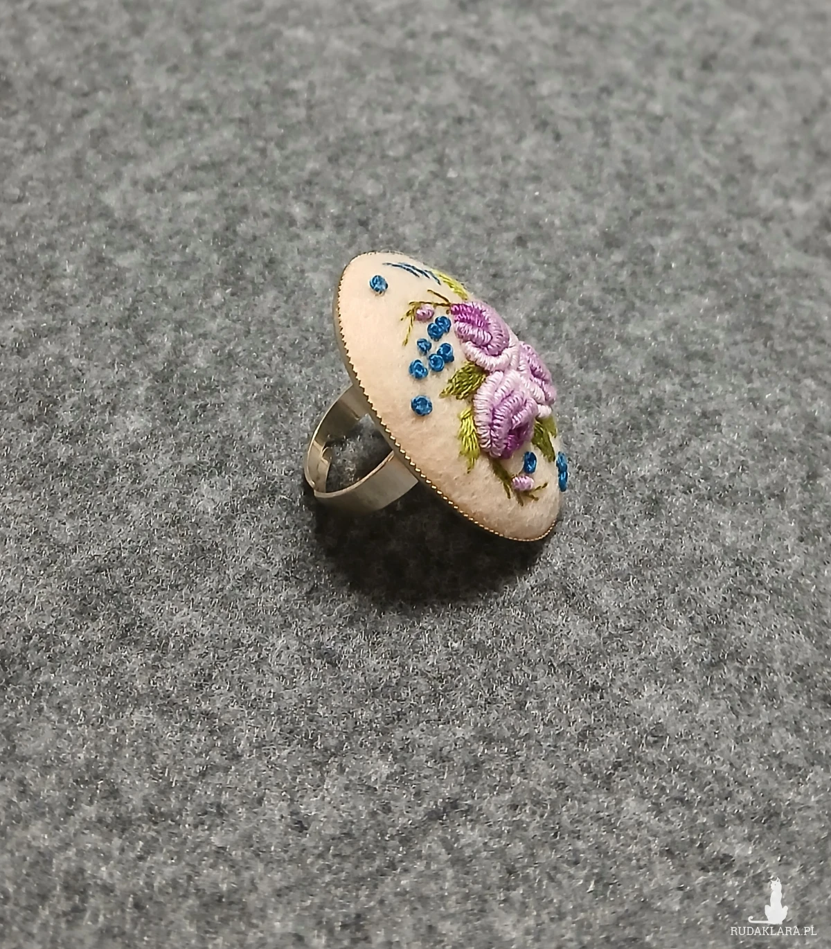 Zaskocz swoich bliskich unikatową biżuterią. Ten nieszablonowy pierścień to wyjątkowy sposób na wyrażenie siebie. Stonowana kolorystyka kilku odcieni fioletu na ecru dobitnie podkreśli Twoją wyjątkową osobowość.