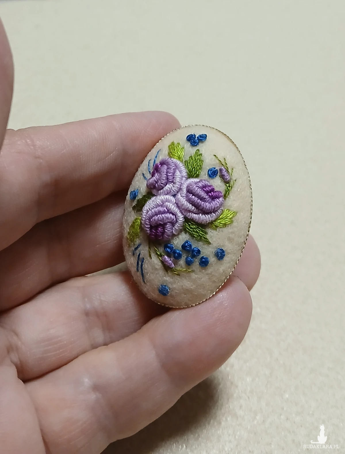 Perfekcyjnie dopracowany haft na filcu wykonałam polską bawełnianą muliną za pomocą igły. Jest on zabezpieczony impregnatem do tkanin ale po dłuższym użytkowaniu można go odświeżyć przy pomocy delikatnego mydła i letniej wody.