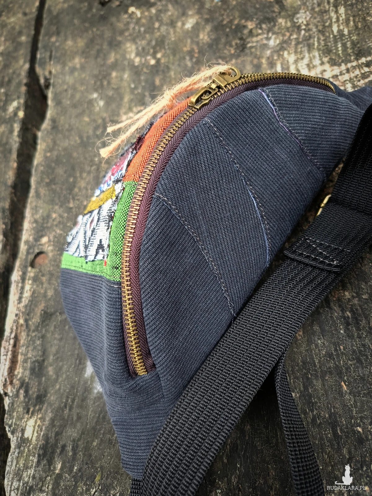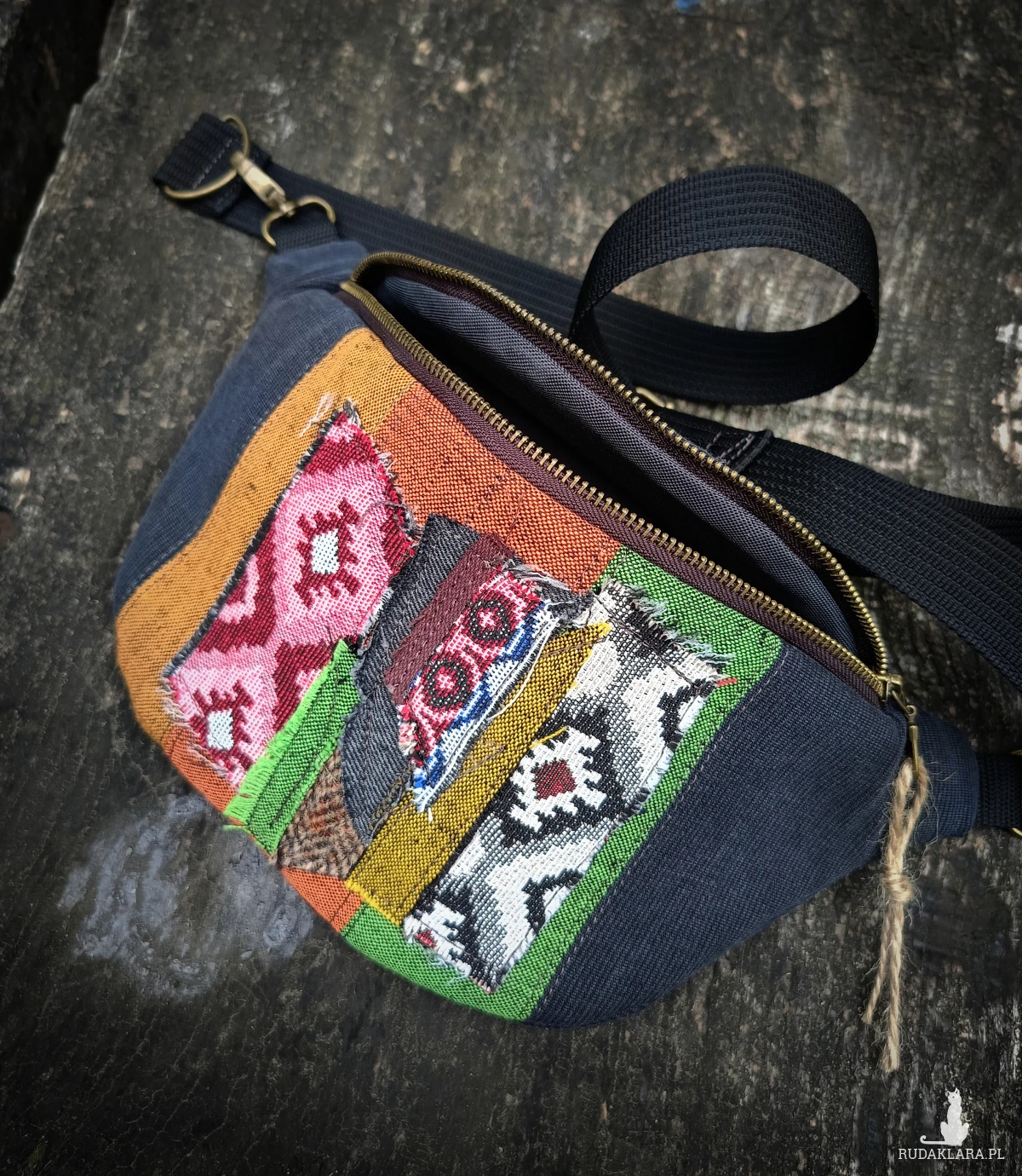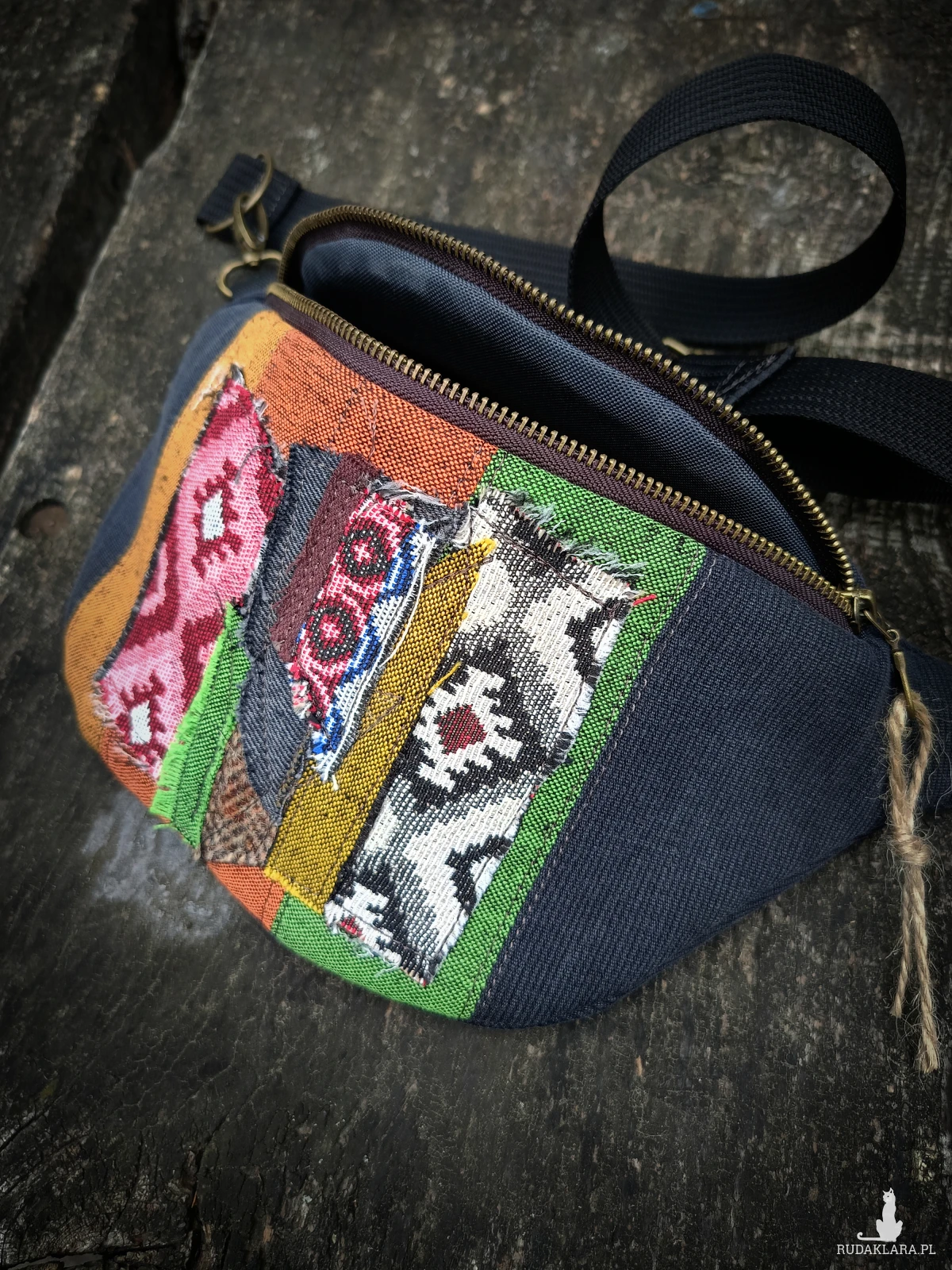 Nerka, saszetka uszyta z kawałków jeansów i różnych typów tkanin dekoracyjnych. Podszewka wodoodporna.