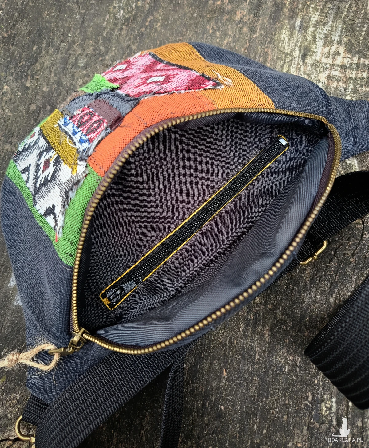 W środku znajduje się kieszonka zapinana na zamek, druga kieszonka naszyta jest na zewnątrz, na tyle nerki.