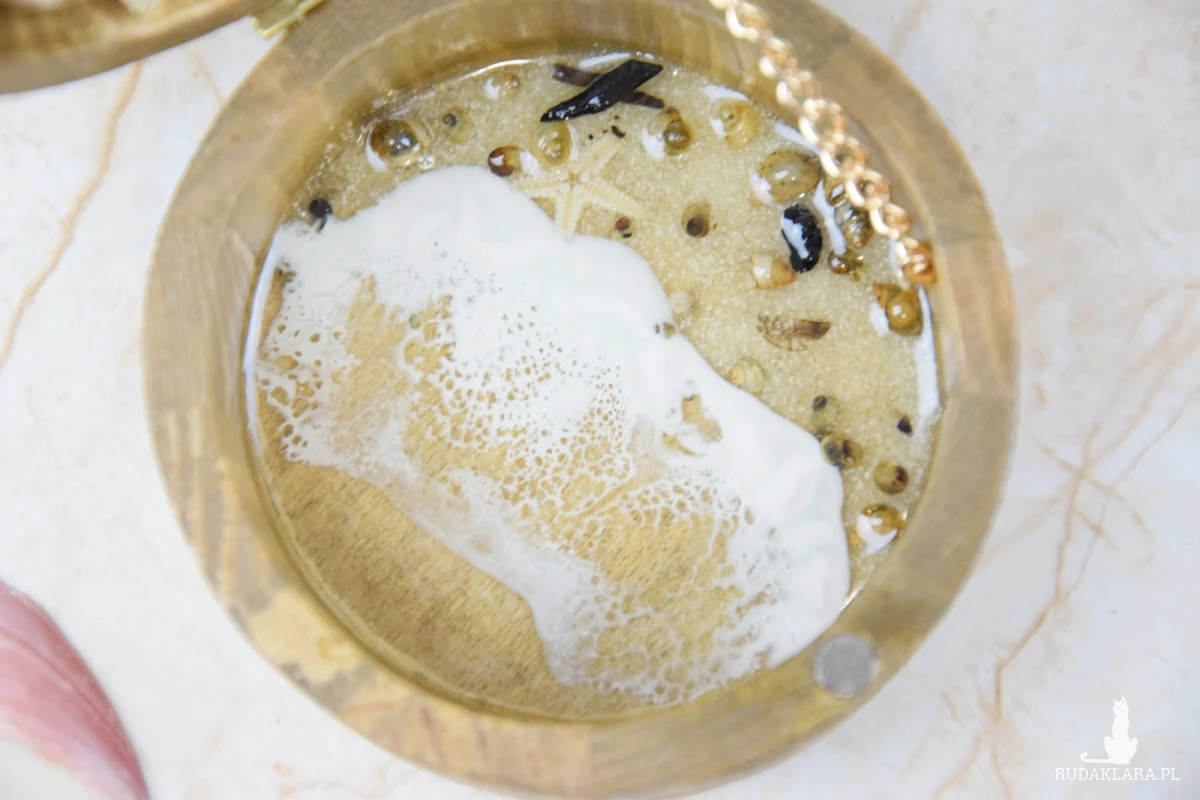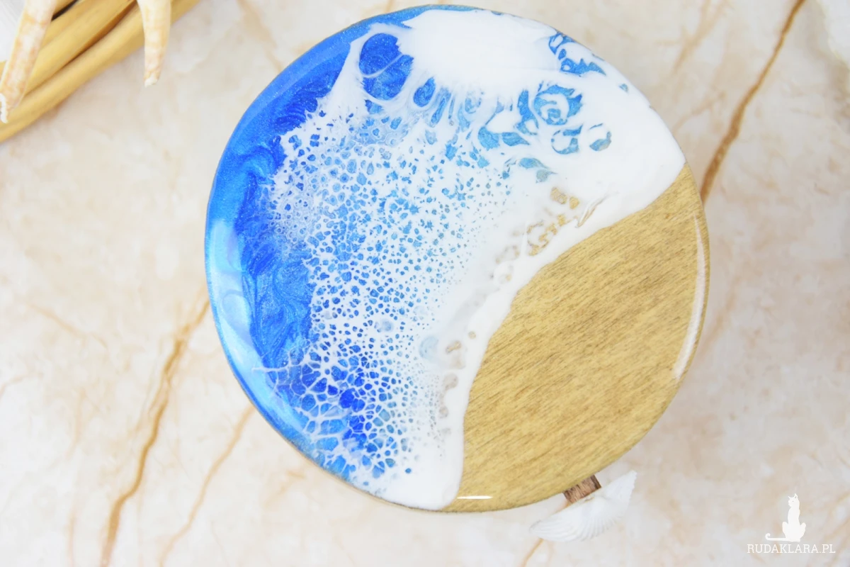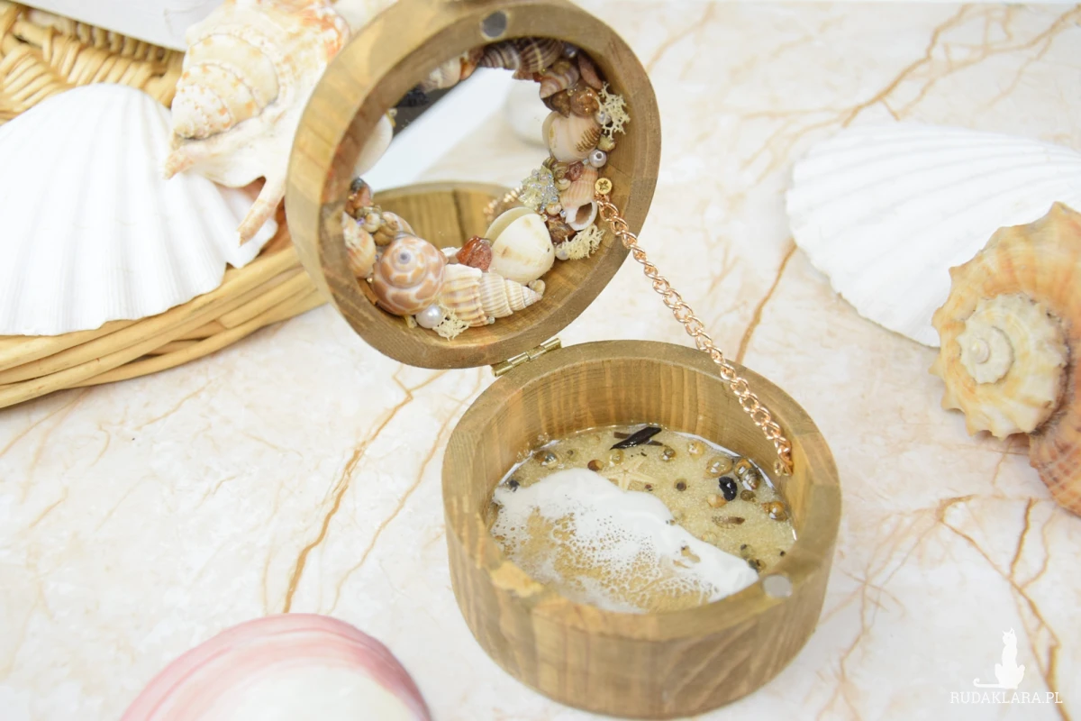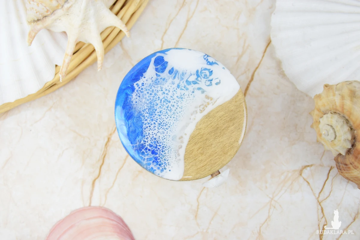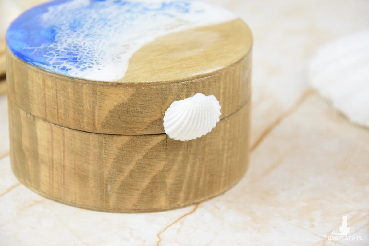 Wieczko i wnętrze zdobi wyjątkowy motyw morski wylany z żywicy – głęboki, niepowtarzalny wzór, który przywodzi na myśl fale, piasek i bezkres oceanu. Szkatułka otwierana jest za pomocą subtelnie osadzonej muszli, która pełni funkcję uchwytu – naturalny, delikatny detal, idealnie wpisujący się w morski klimat.