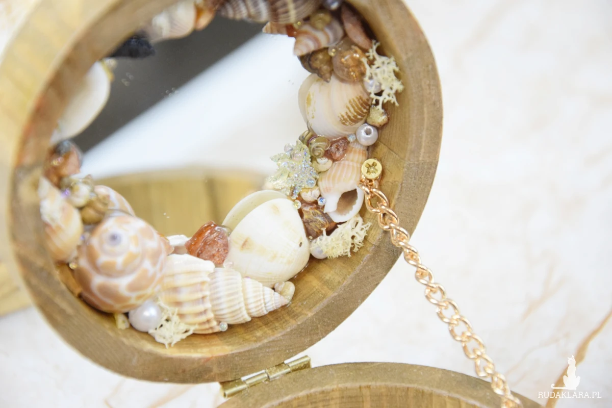 Wewnątrz znajdziesz lusterko otulone wieńcem z morskich skarbów: polskich bursztynów, muszli, pereł, błyszczących diamentów oraz rozgwiazd – jakby zatrzymanych w czasie wspomnień z wakacji nad Bałtykiem.
