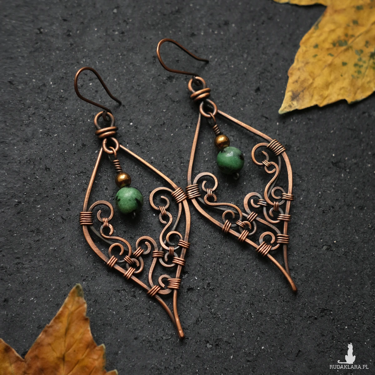 Efektowne miedziane kolczyki wykonane metodą wire wrapping. Kolczyki mają kształt wysmukłych liści, a w środku ozdobione są klimatycznymi oplotami. Posiadają kamienie zoisytu oraz koraliki hematytu. Kolczyki są lekkie, co wpływa na wysoki komfort noszenia. To idealna propozycja na co dzień jak i na większe wyjścia.