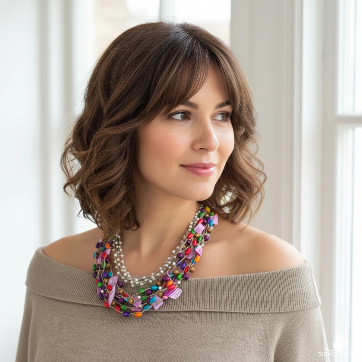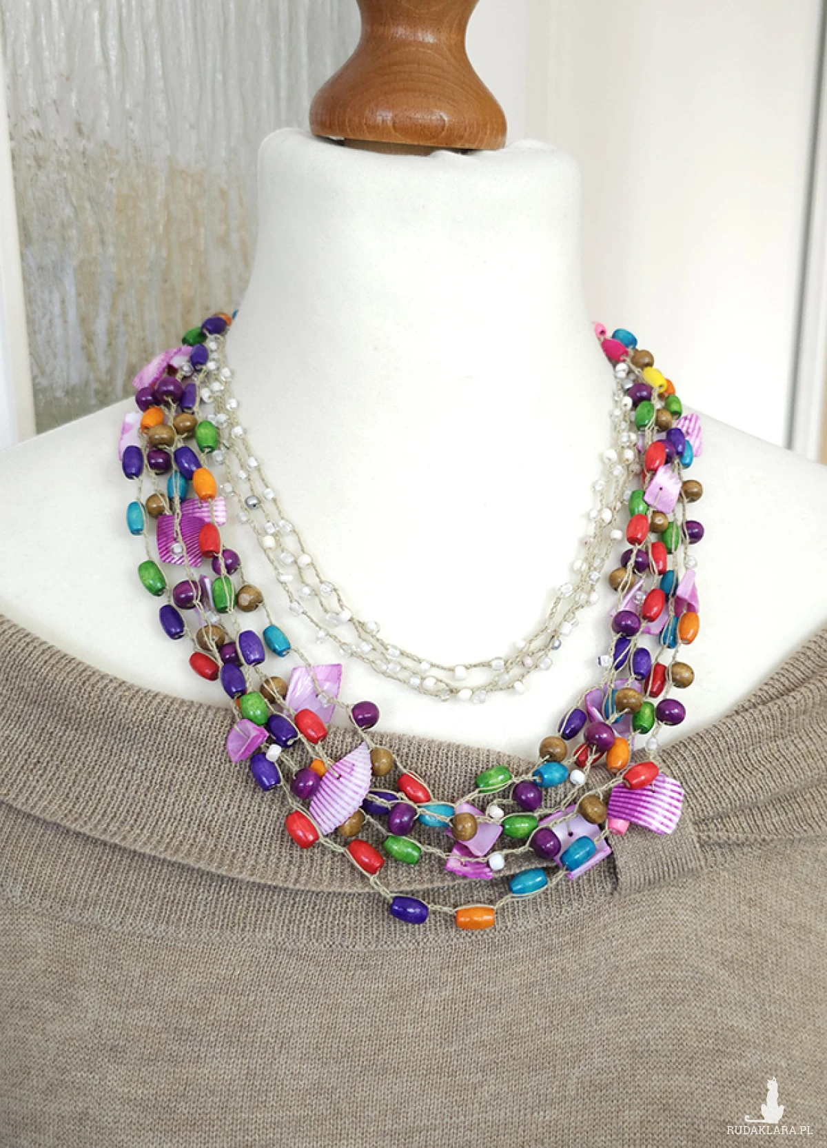 Ożyw swój styl z tym ręcznie robionym, wielowarstwowym naszyjnikiem! To idealny dodatek dla każdej kobiety, która ceni sobie unikatowe i pełne życia akcesoria. Naszyjnik składa się z misternie splecionych sznurów lnianych, zdobionych barwnymi, błyszczącymi szklanymi koralikami oraz naturalnymi, drewnianymi koralikami o różnych rozmiarach (4-10 mm). Całość dopełniają urocze, cięte muszelki w intensywnym, fioletowym odcieniu, które dodają biżuterii letniego, wakacyjnego klimatu. Doskonały do letnich sukienek, topów i casualowych stylizacji. Materiały: len, szklane i drewniane koraliki (4-10 mm), muszelki cięte. 8 sznurków. Obwód: 53 cm plus 5 cm regulacji. Zapięcie antyalergiczne (bez niklu, kadmu i ołowiu). Ostatnie zdjęcie to symulacja Ai.