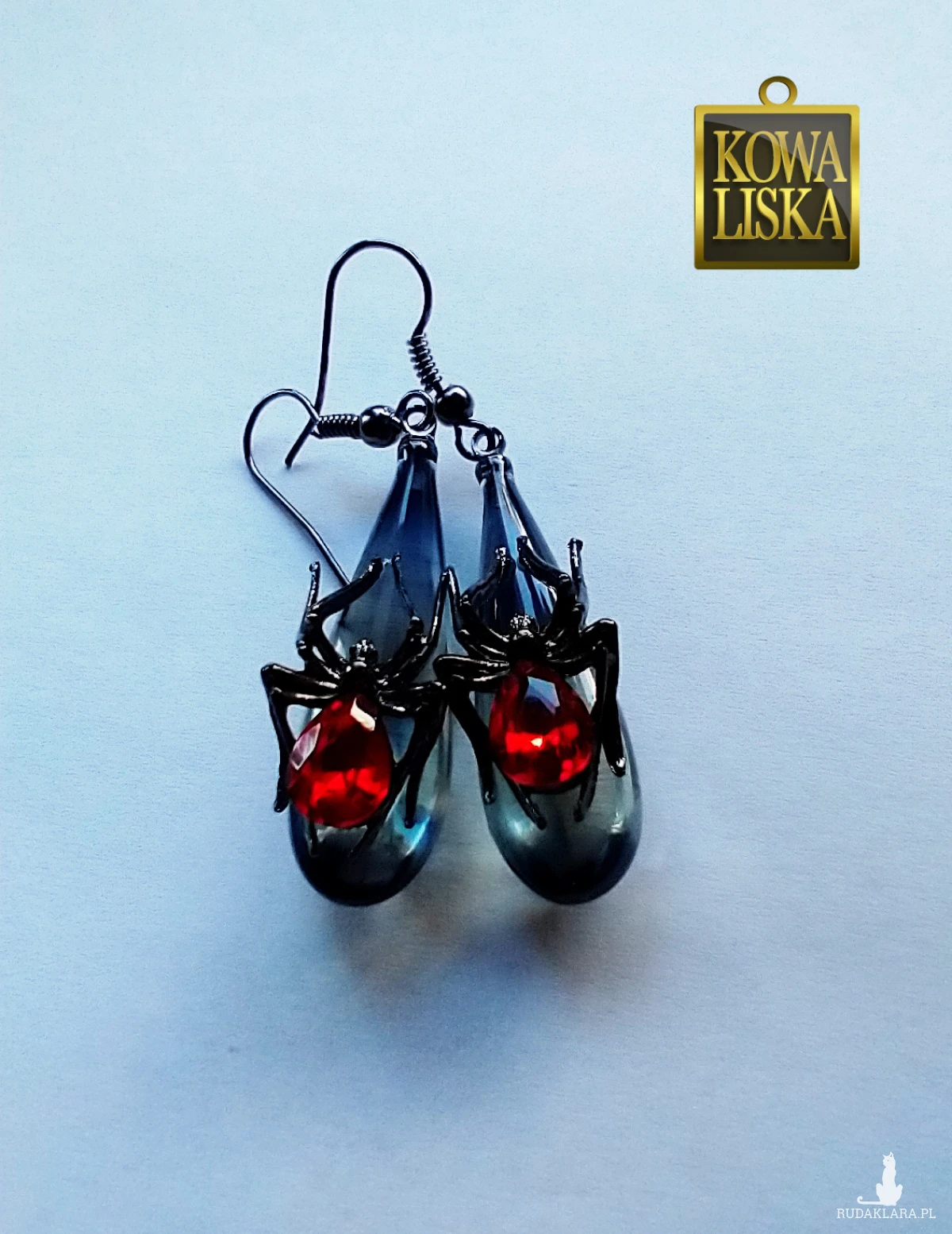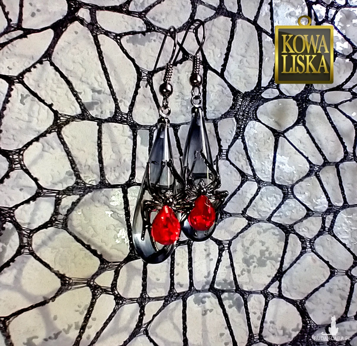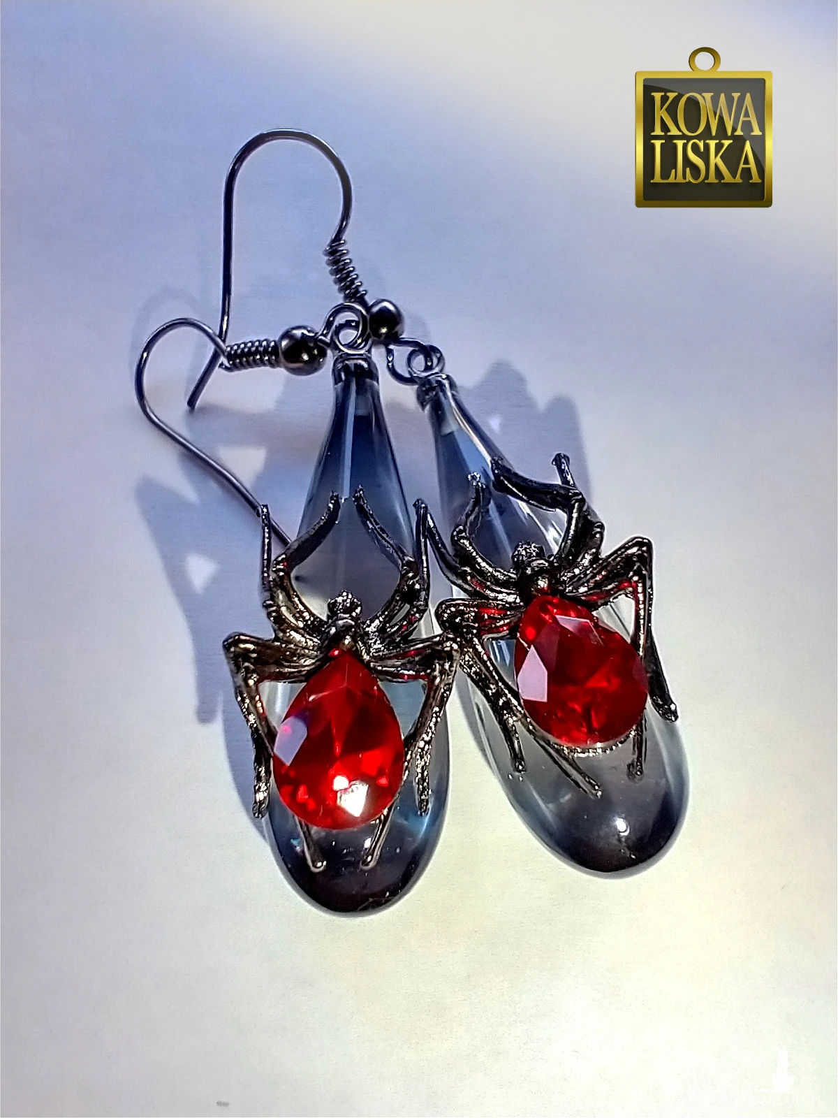 Dekoracyjne drapieżne pająki z jaskrawoczerwonymi odwłokami, przysiadły na przydymionych na grafitowo, krystalicznych łezkach.