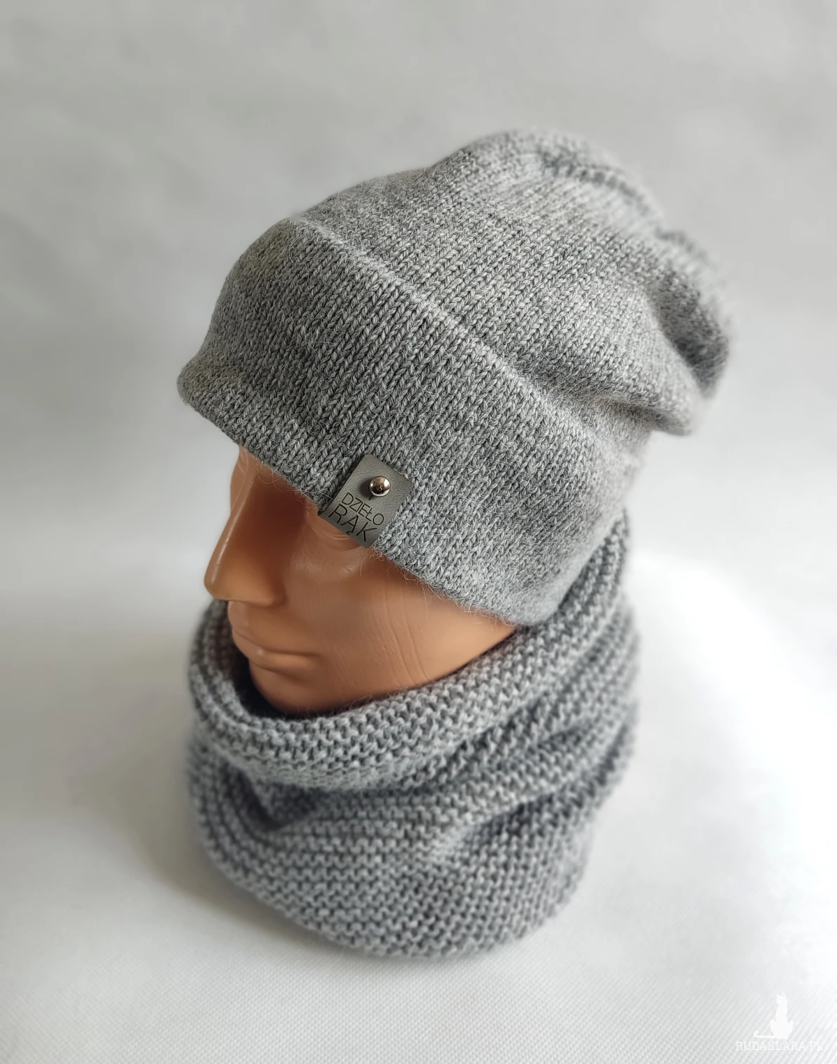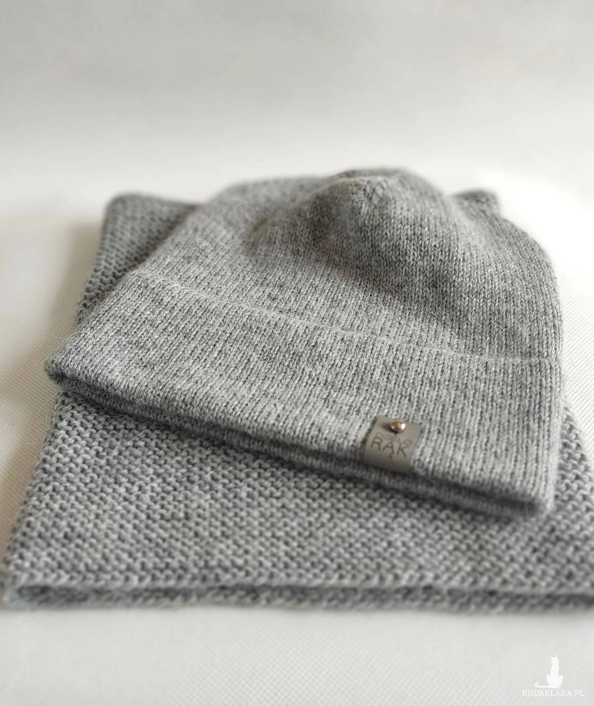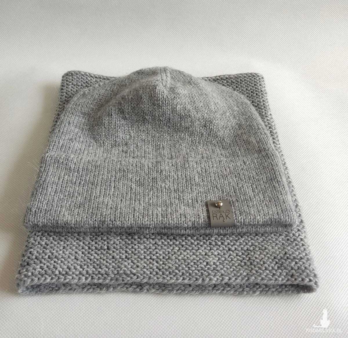 W skład zestawu wchodzi komin tuba i czapka o klasycznym fasonie, na szerokim podwójnym podwinięciu, dopasowującym się do kształtu głowy.