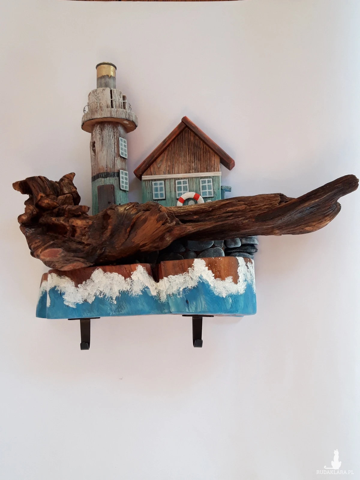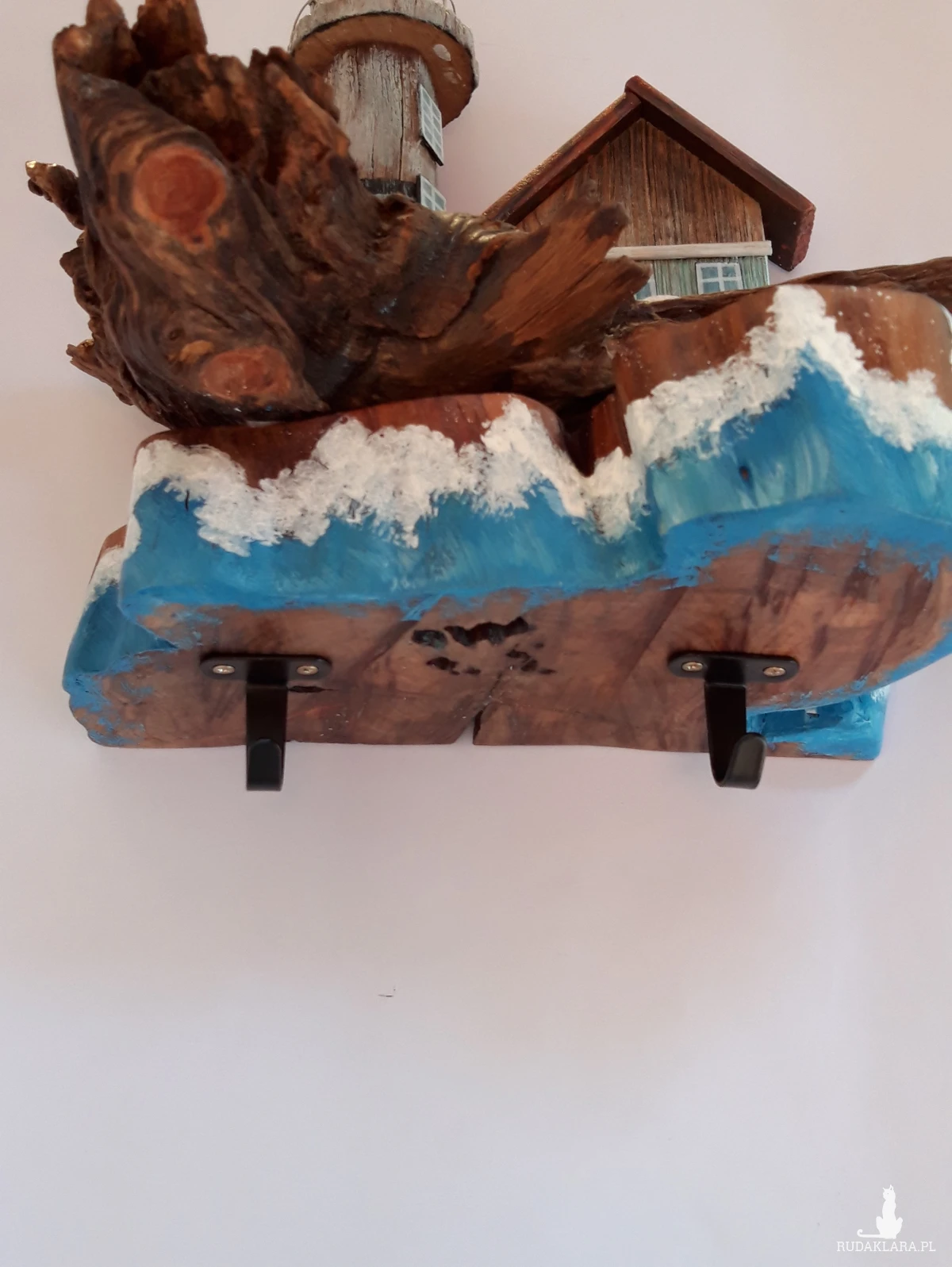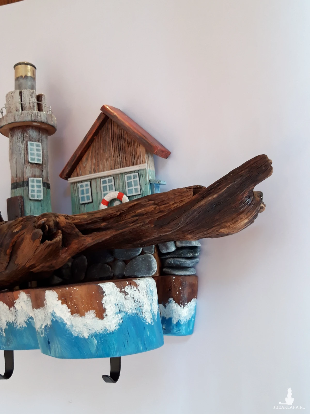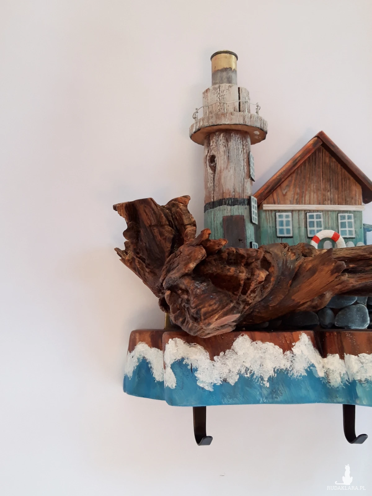 Wieszak wykonany z plaster drzewa śliwy a złamana gałąź imituje skały. Latarnia wykonana z suchej gałęzi dębowej, natomiast domek latarnika to stara, oczyszczona deska. Dodatkiem dekoracji są również kamienie w kolorze błękitu. Całość malowana farbami akrylowymi, drewno zabezpieczone olejem do drewna i dodatkowo werniksem.