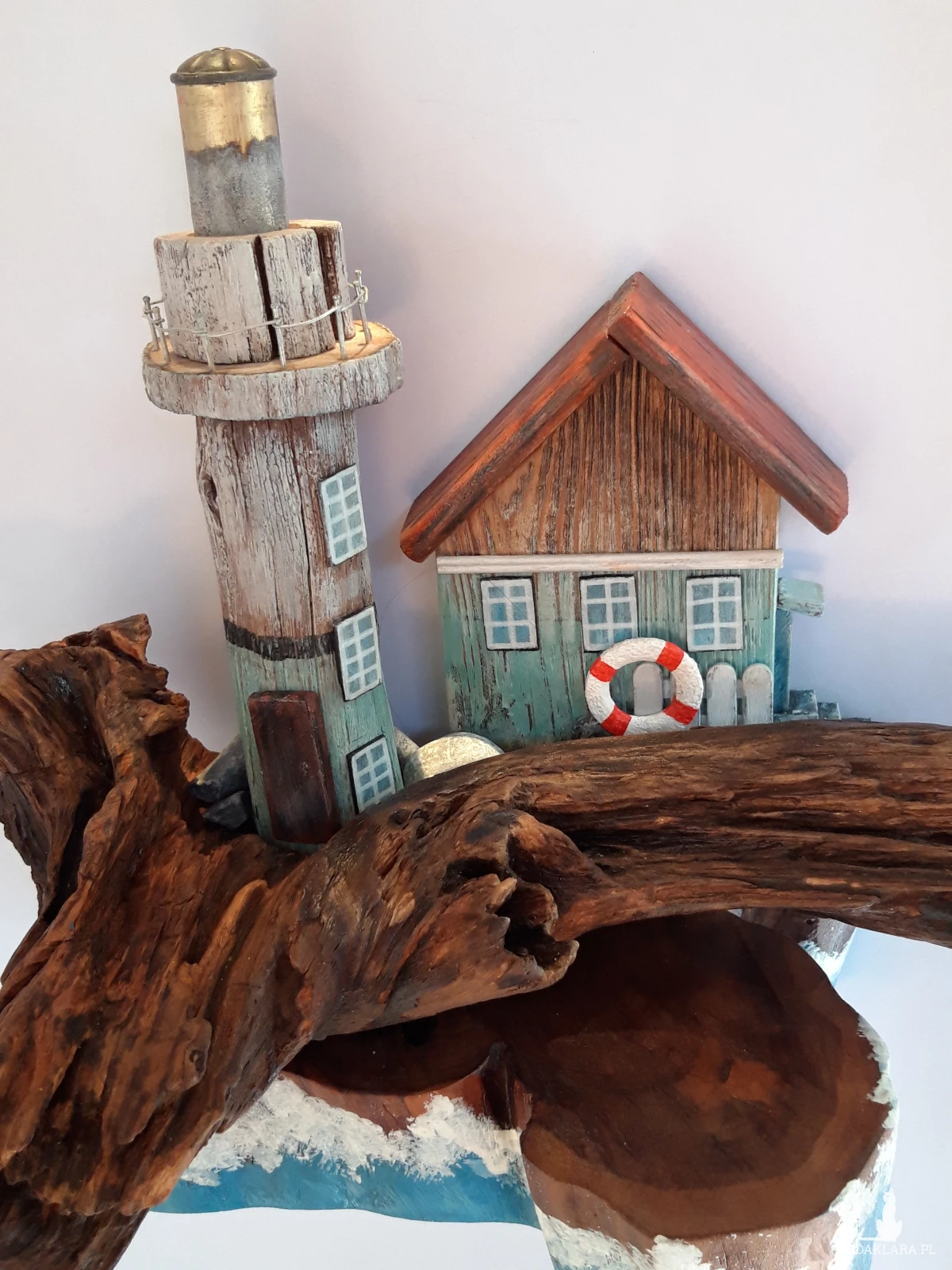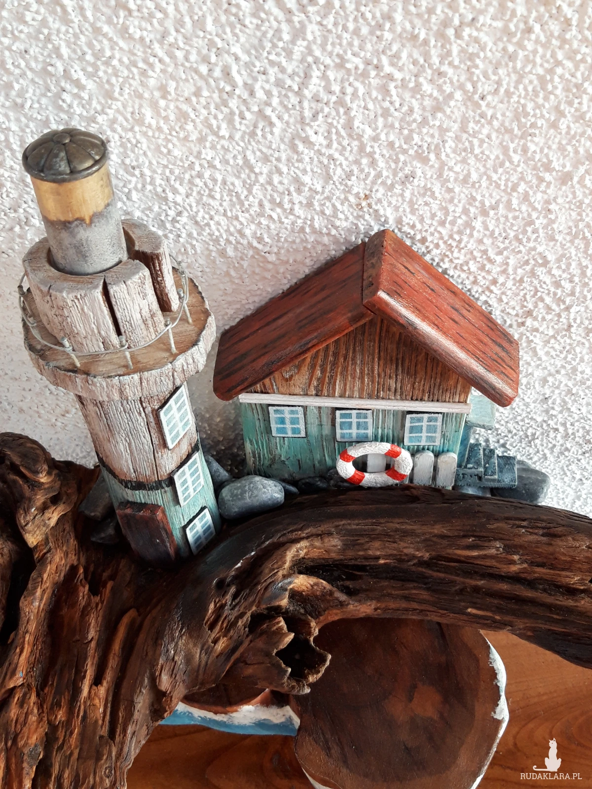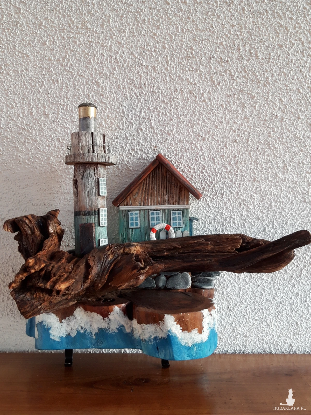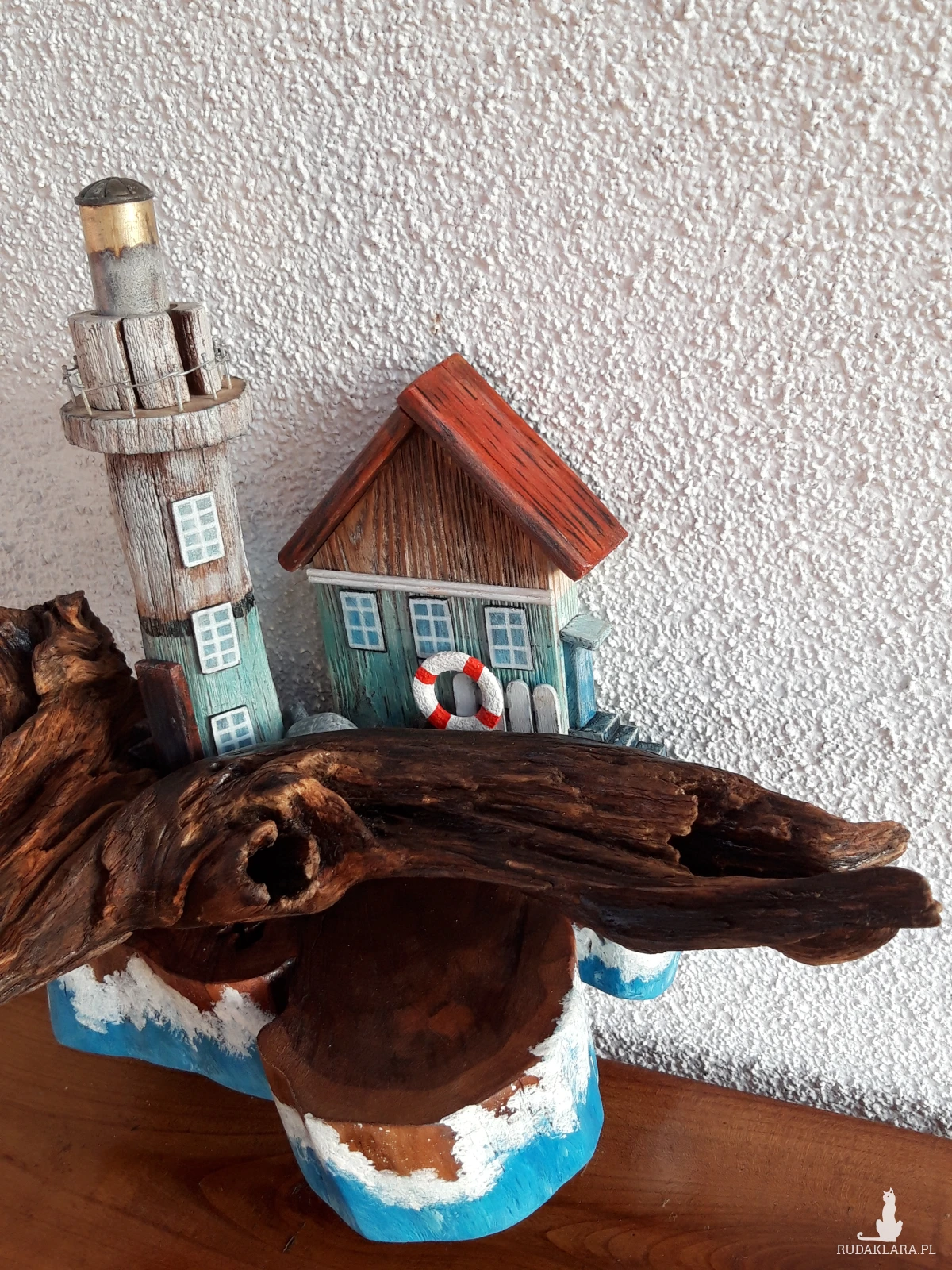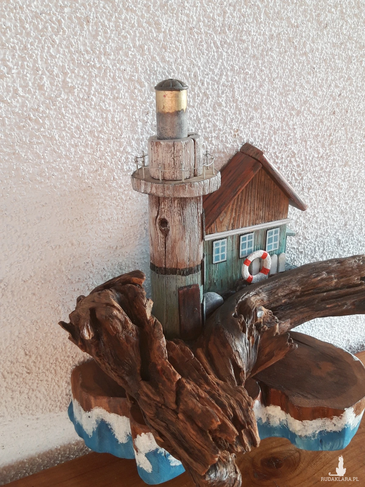 Wieszak wykonany z plaster drzewa śliwy a złamana gałąź imituje skały. Latarnia wykonana z suchej gałęzi dębowej, natomiast domek latarnika to stara, oczyszczona deska. Dodatkiem dekoracji są również kamienie w kolorze błękitu. Całość malowana farbami akrylowymi, drewno zabezpieczone olejem do drewna i dodatkowo werniksem.