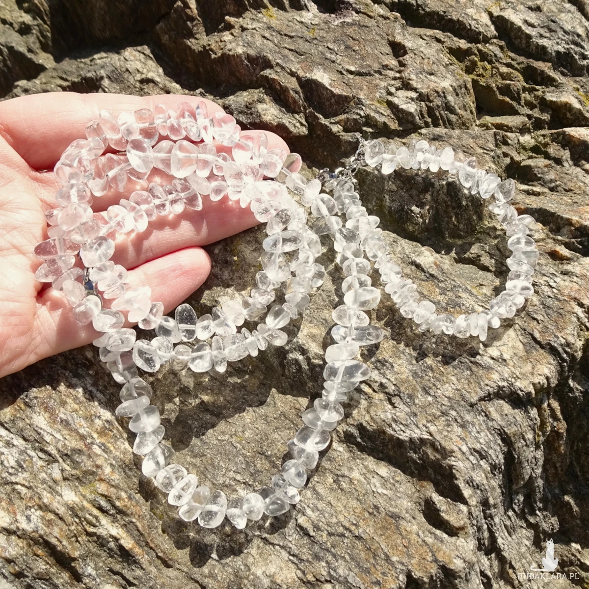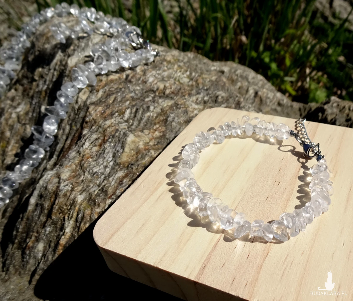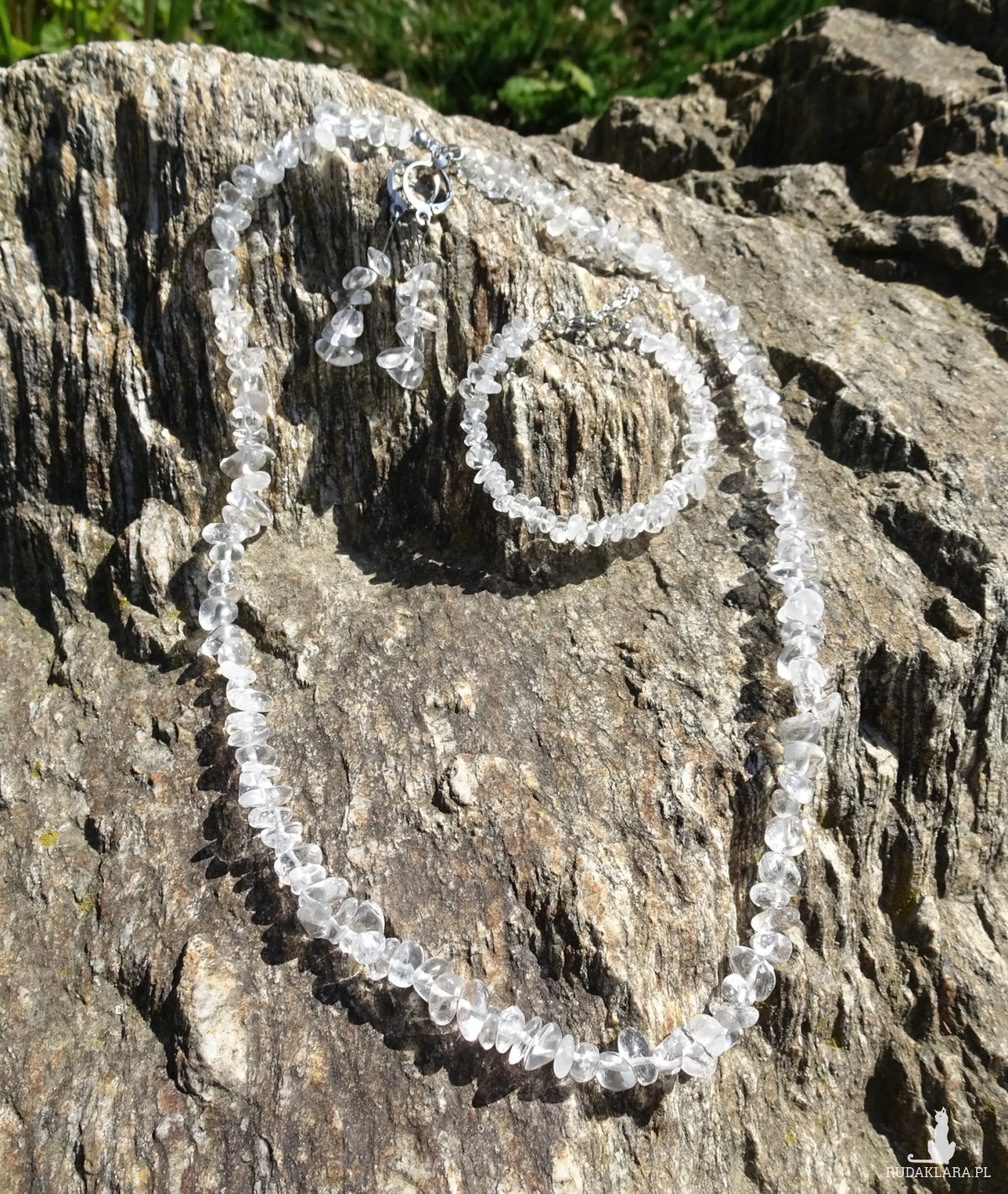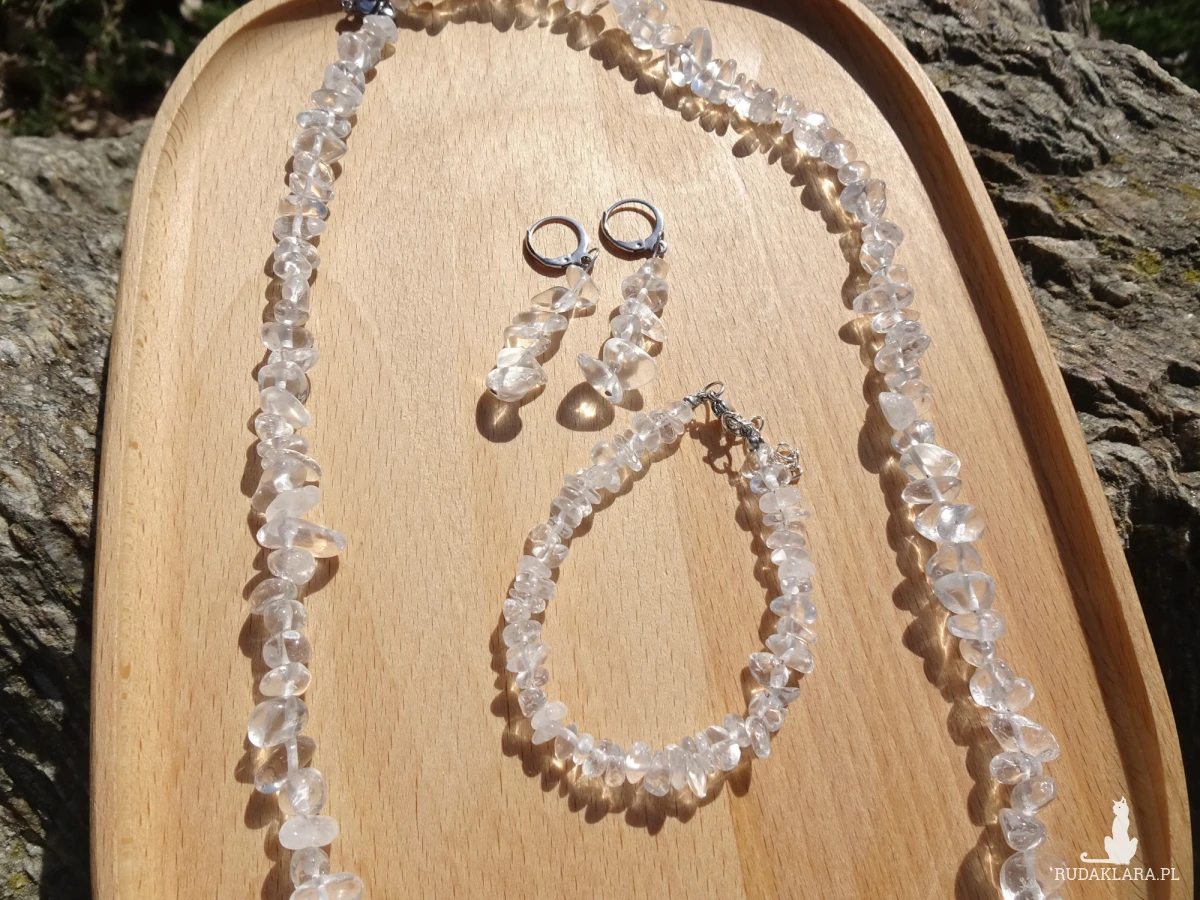 Komplet z sieczki z kryształu górskiego wielkości 4-8mm i elementów ze stali szlachetnej. W komplecie długi naszyjnik, bransoletka z zapięciem i kolczyki. Długość naszyjnika – 61cm, bransoletki – 17cm + przedłużka 3cm, kolczyków – ok. 5,1cm.