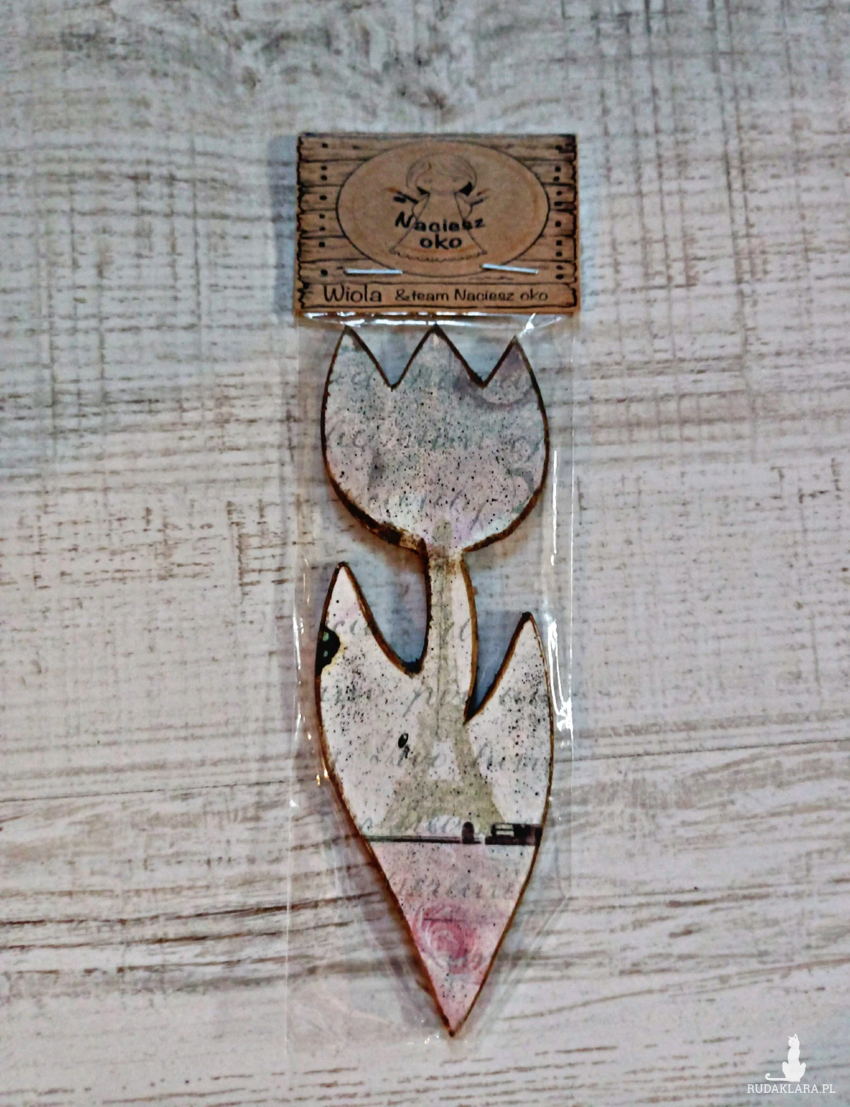 Drewniana zakładka do książki, zdobiona dwustronnie techniką decoupage.